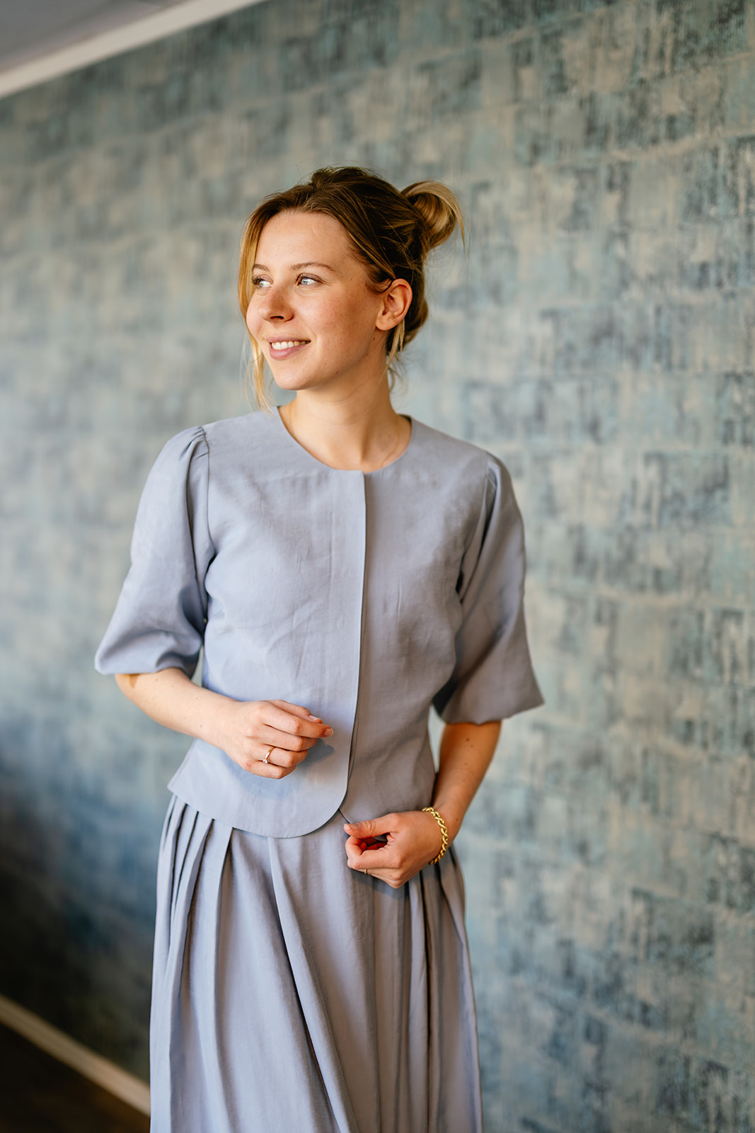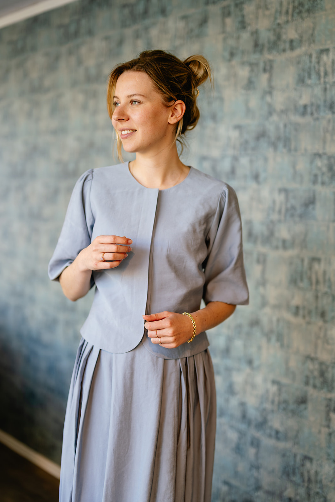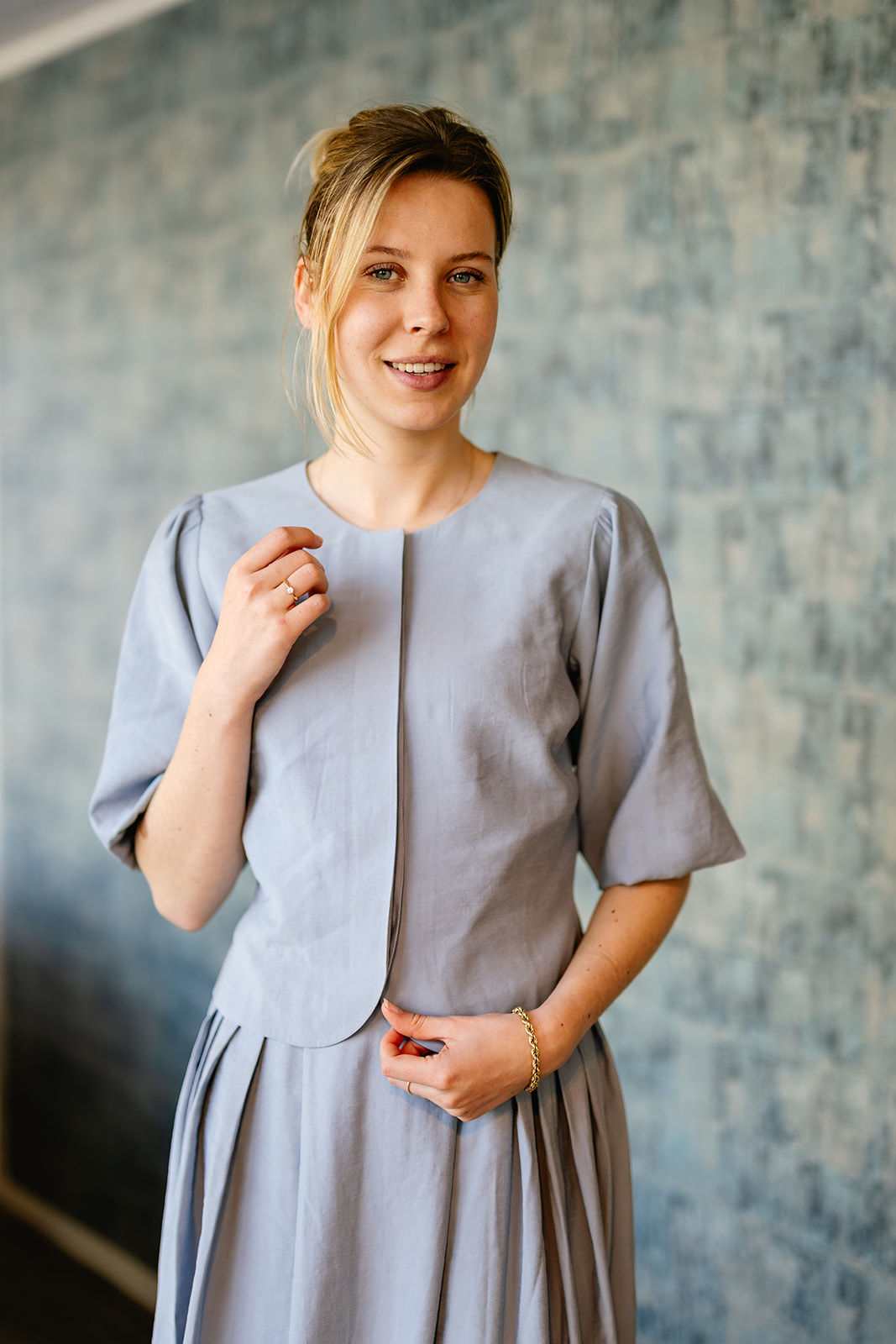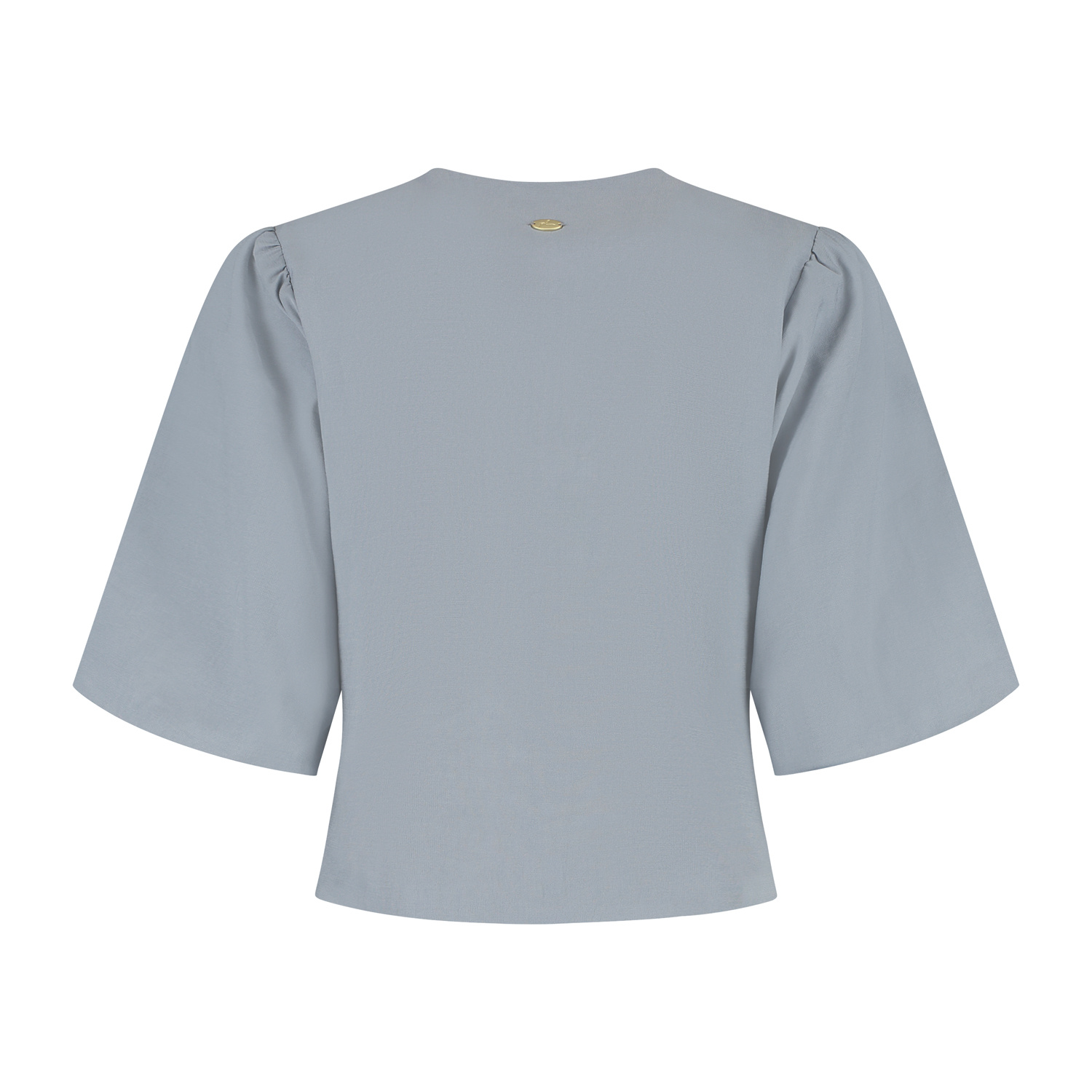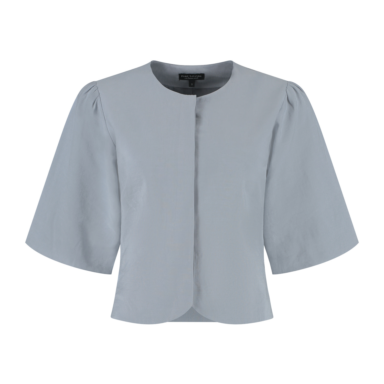 Deze blouse/jasje Aniek in een blauwe tint van Port Lavande straalt in haar eenvoud. De rechte, licht cropped pasvorm en de korte ballonmouwen geven de blouse net iets meer, het kan daardoor ook prima...