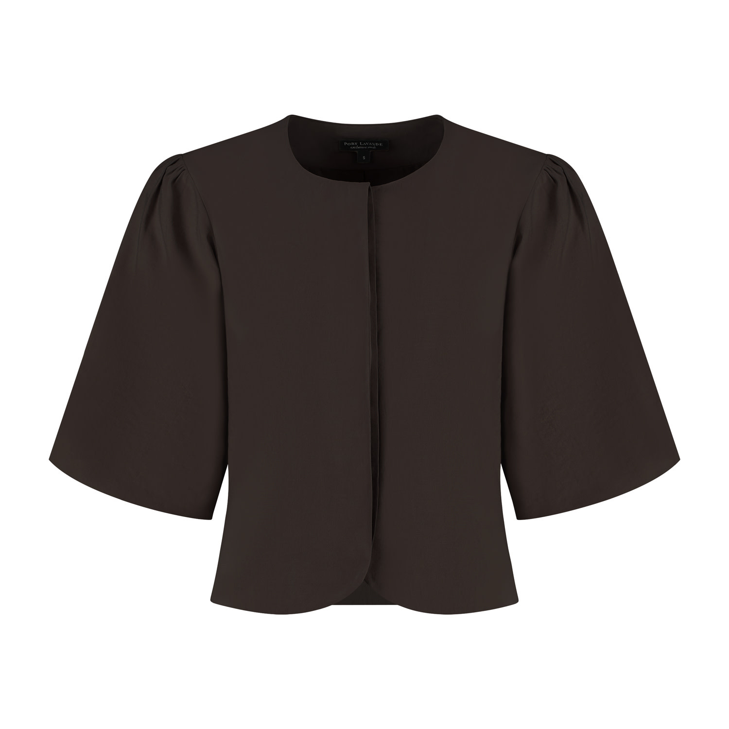 Deze blouse/jasje Aniek in donkerbruin van Port Lavande straalt in haar eenvoud. De rechte, licht cropped pasvorm en de korte ballonmouwen geven de blouse net iets meer, het kan daardoor ook prima als jasje gedragen worden. De rimpeling bij de schouders en de verborgen/blinde sluiting aan de voorzijde zorgen voor een strakke en rustige afwerking. De blouse/jasje Aniek is gemaakt in een mooie stevige viscose kwaliteitsstof en is voorzien van een voeringstof. Perfect te combineren met rok Sharon en diverse andere items.