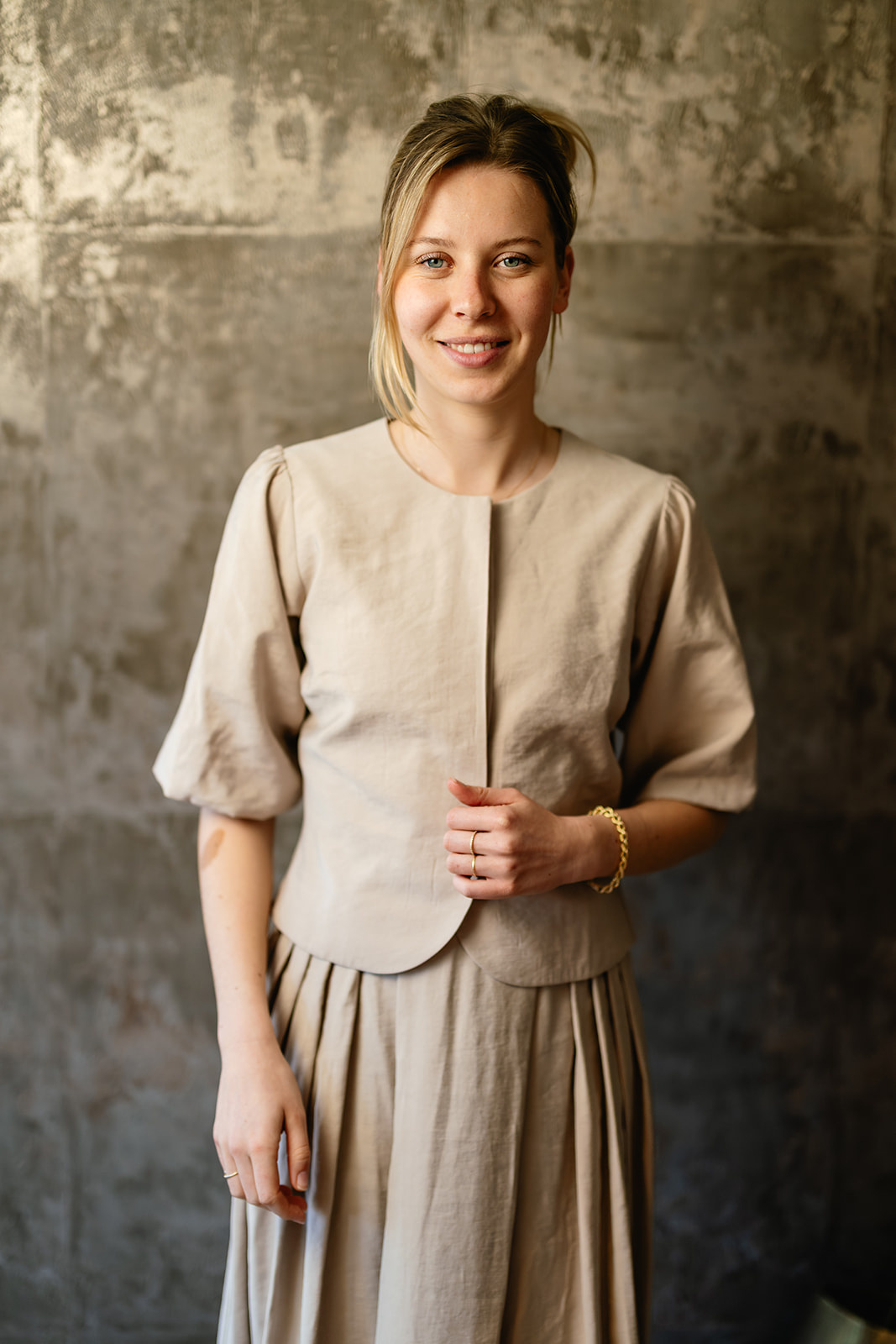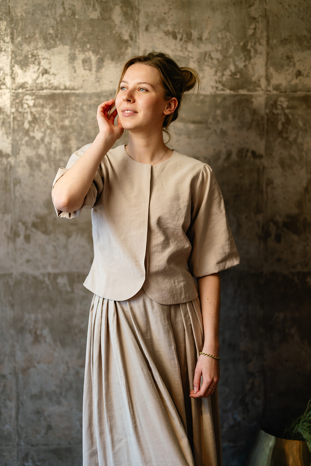 Deze blouse/jasje Aniek in een zand tint van Port Lavande straalt in haar eenvoud. De rechte, licht cropped pasvorm en de korte ballonmouwen geven de blouse net iets meer, het kan daardoor ook prima als jasje gedragen worden. De rimpeling bij de schouders en de verborgen/blinde sluiting aan de voorzijde zorgen voor een strakke en rustige afwerking. De blouse/jasje Aniek is gemaakt in een mooie stevige viscose kwaliteitsstof en is voorzien van een voeringstof. Perfect te combineren met rok Sharon en diverse andere items.
