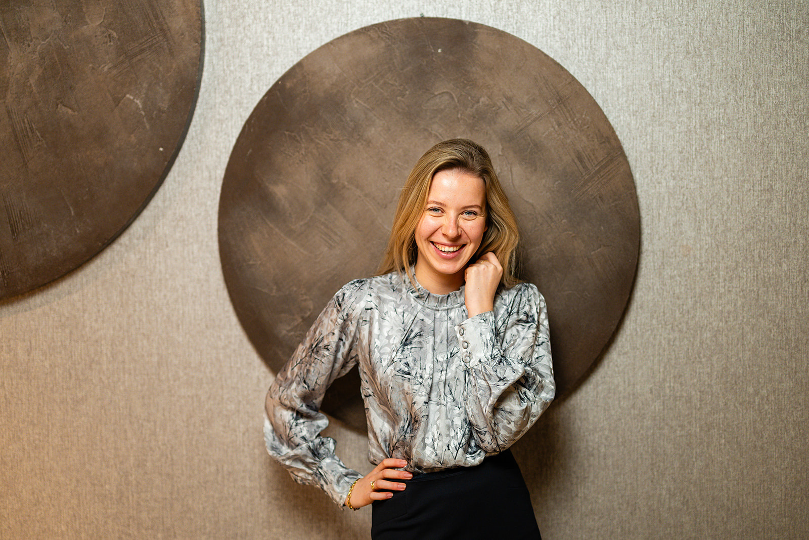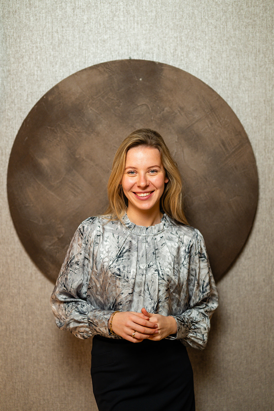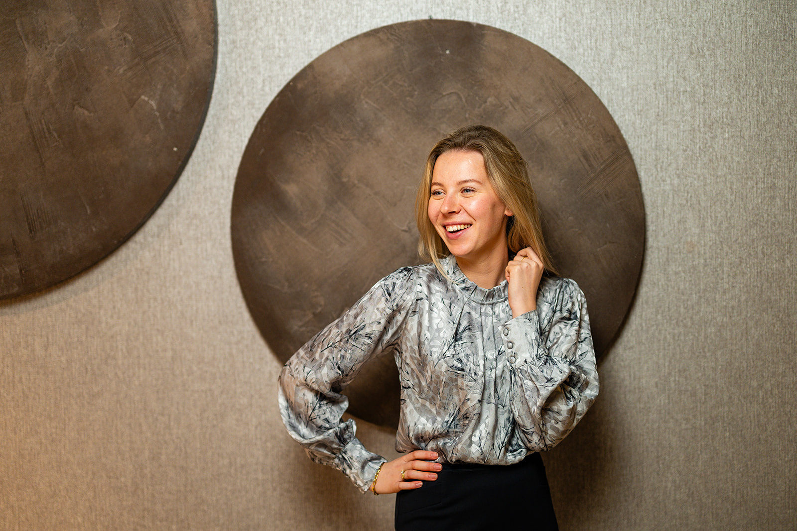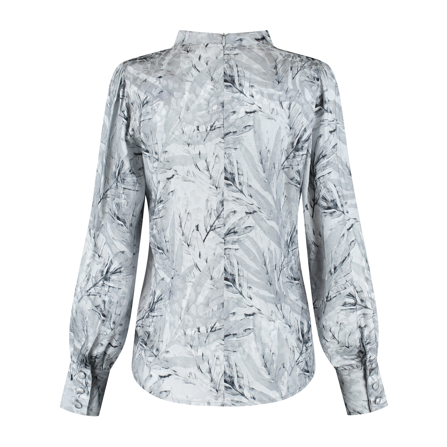 Blouse met geplooide kraagboordje en plooidetail vooraan. De blouse heeft lange blousende mouwen met een brede manchetten voorzien van stofknoopjes. Deze blouse sluit middenachter d.m.v. een blinde rits en is gemaakt in een blouse-kwaliteitsstof met mooie print en een vleugje glans.