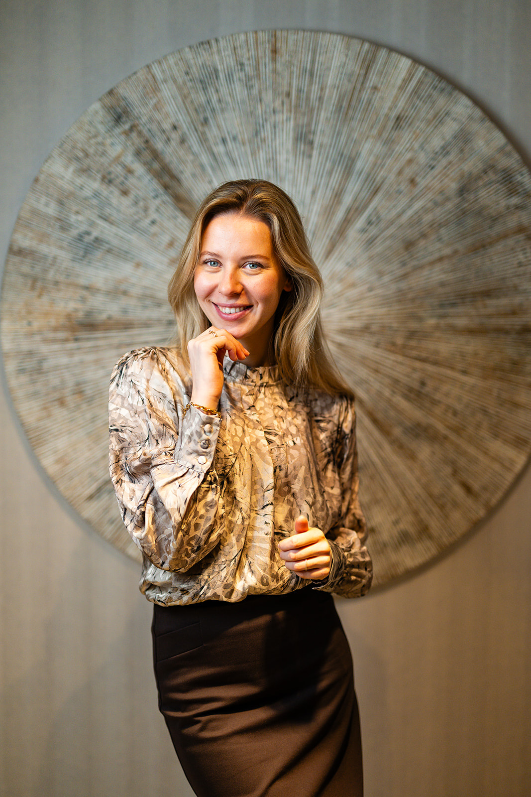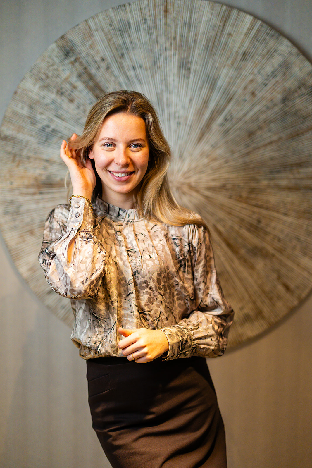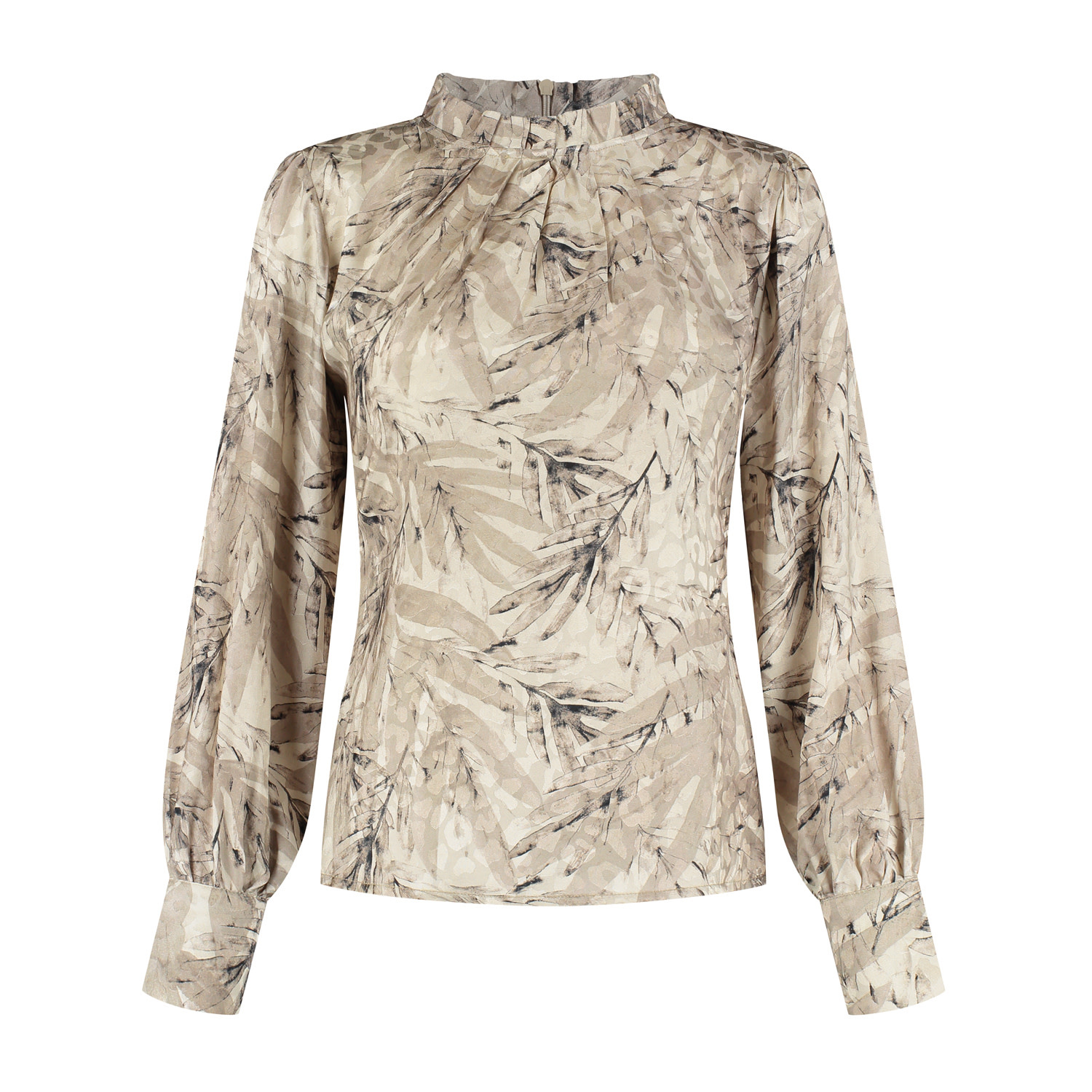 Blouse met geplooide kraagboordje en plooidetail vooraan. De blouse heeft lange blousende mouwen met een brede manchetten voorzien van stofknoopjes. Deze blouse sluit middenachter d.m.v. een blinde rits en is gemaakt in een blouse-kwaliteitsstof met mooie print en een vleugje glans.