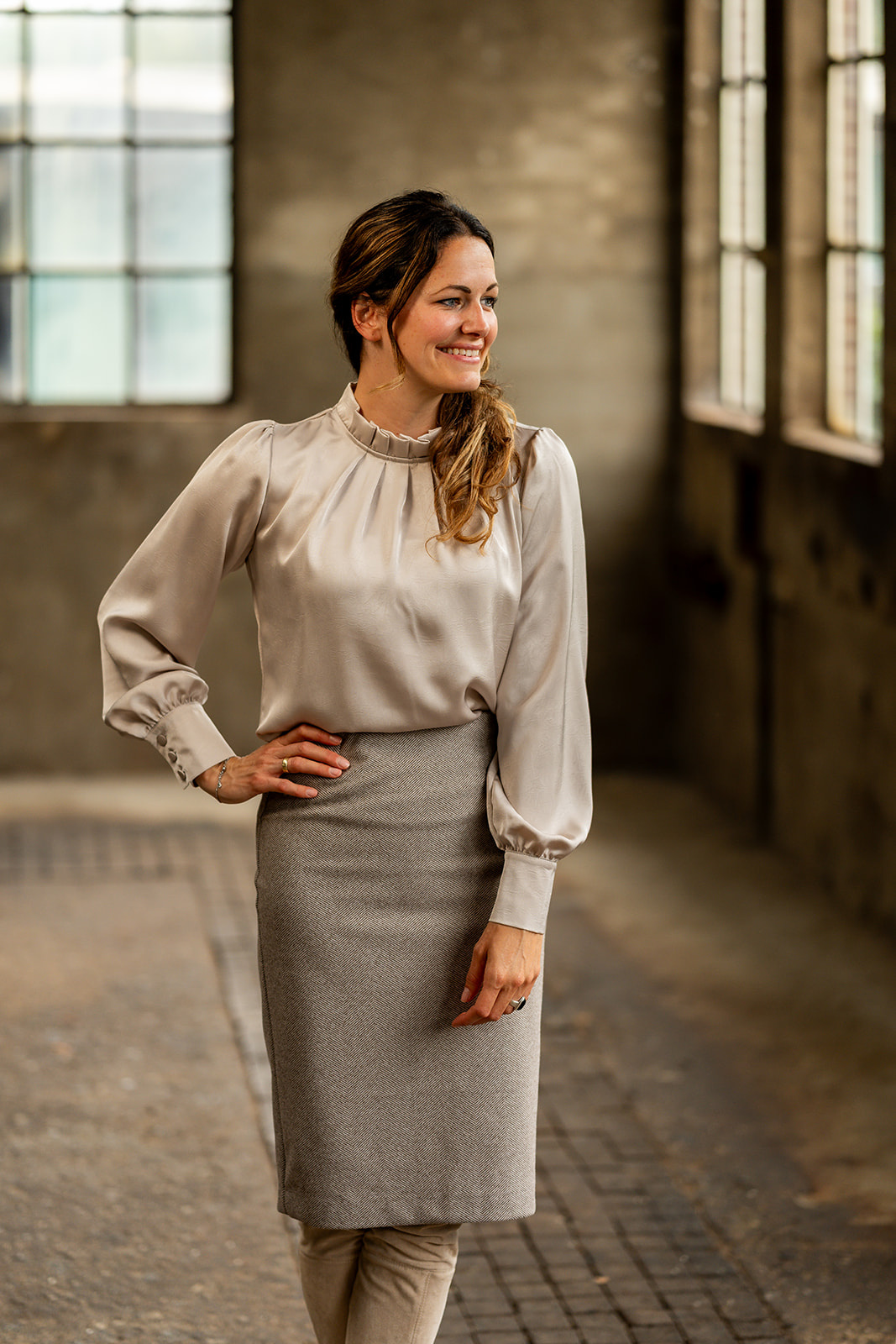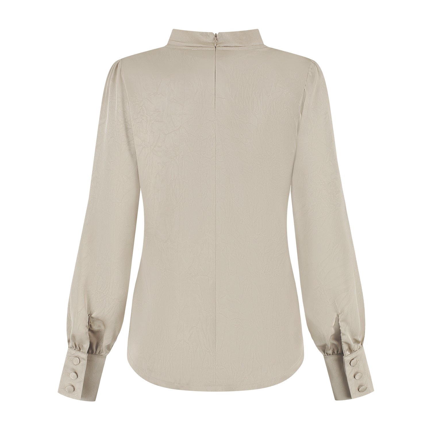 Blouse met geplooide kraagboordje en plooidetail vooraan. De blouse heeft lange blousende mouwen met een brede manchetten voorzien van stofknoopjes. Deze blouse sluit middenachter d.m.v. een blinde rits en is gemaakt in een mooie satijnachtige kwaliteitsstof met een vleugje glans en reliëflook. *Dit artikel komt naar verwachting medio oktober opnieuw binnen!
