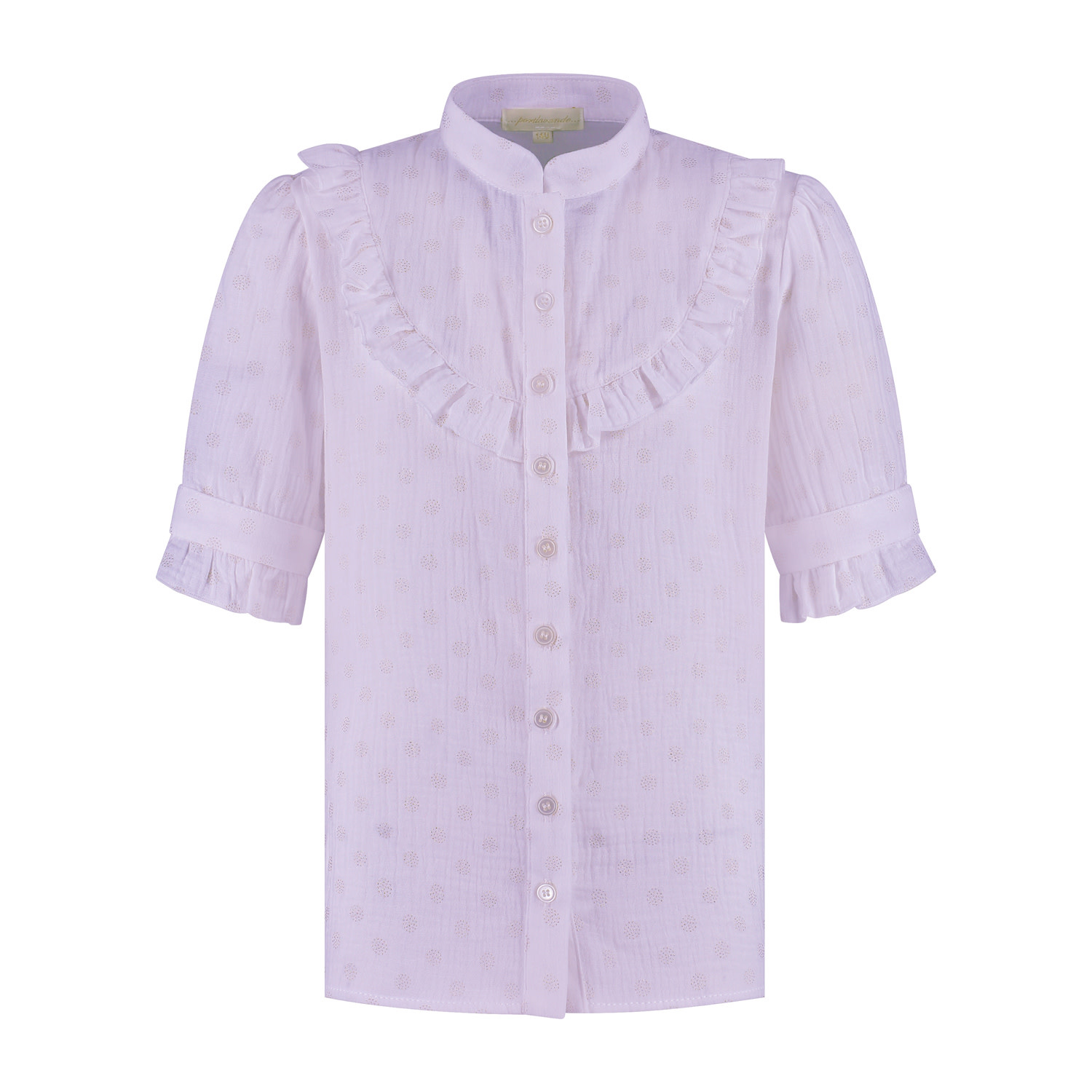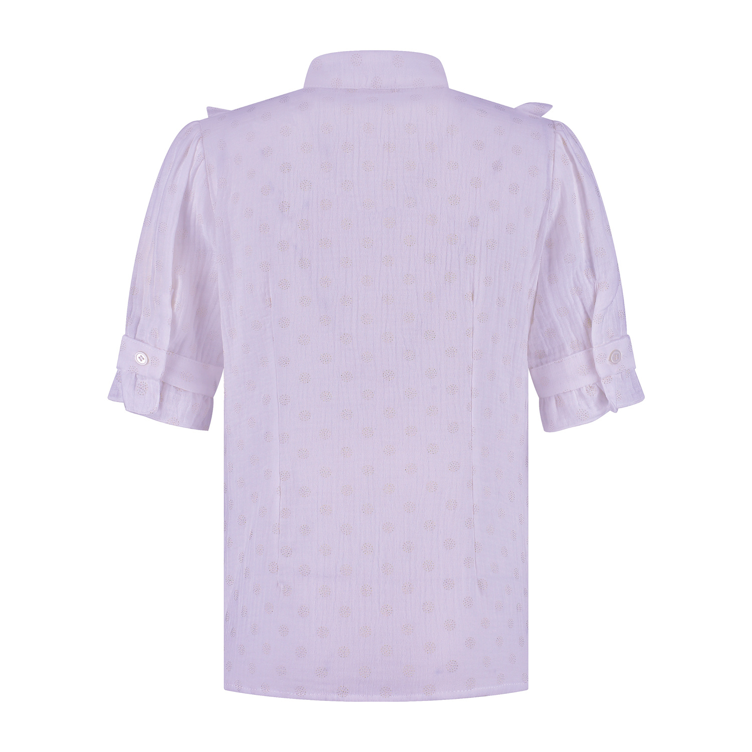Blouse met klein opstaand boordje en smalle roezelstrook op het voorpand. De blouse heeft een korte mouw met roezelstrookje langs de manchet. De blouse sluit d.m.v. een knopenlijst en is gemaakt in ee...