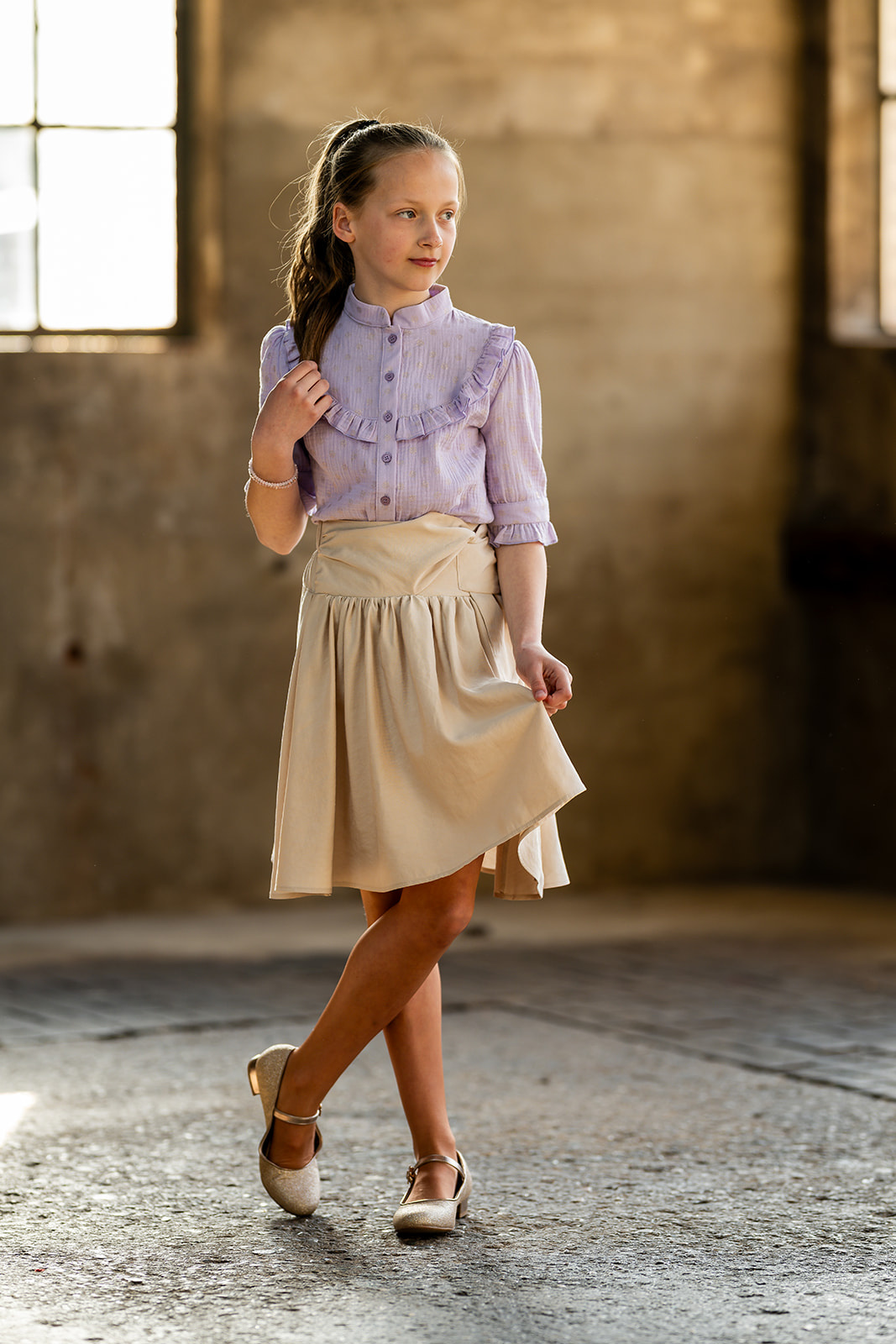 Blouse met klein opstaand boordje en smalle roezelstrook op het voorpand. De blouse heeft een korte mouw met roezelstrookje langs de manchet. De blouse sluit d.m.v. een knopenlijst en is gemaakt in een chique dunne katoenen kwaliteitsstof met een klein goudkleurig printje op de stof.