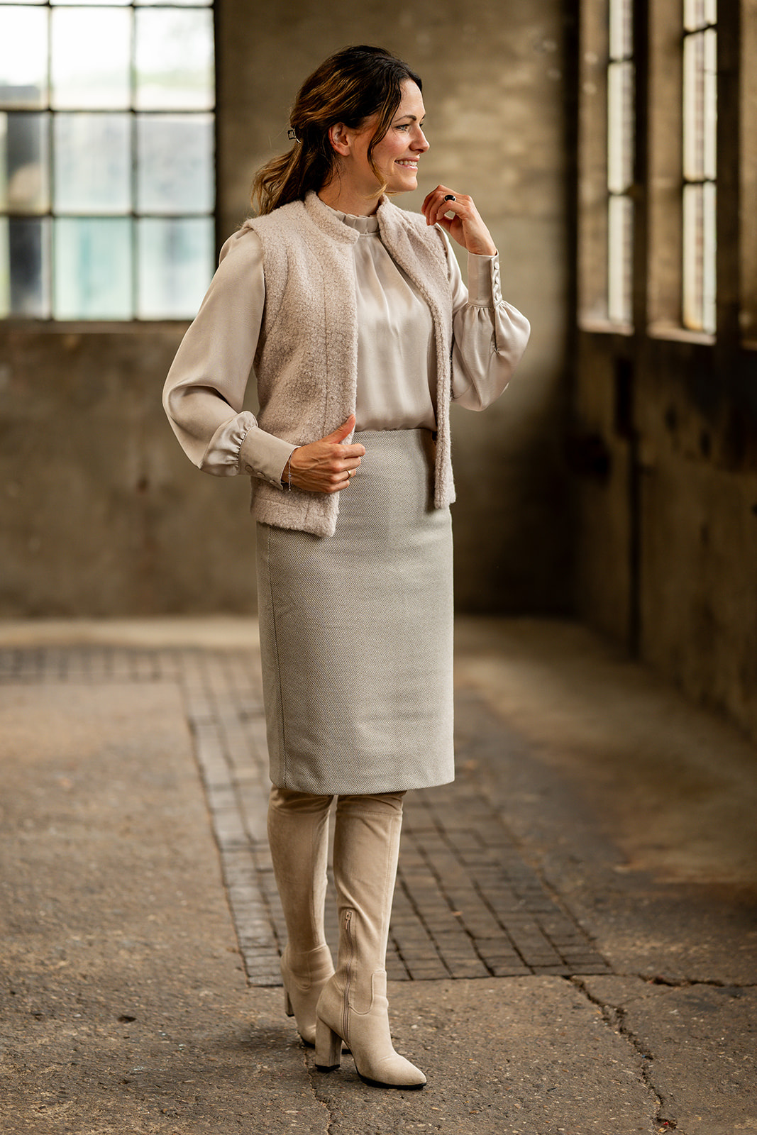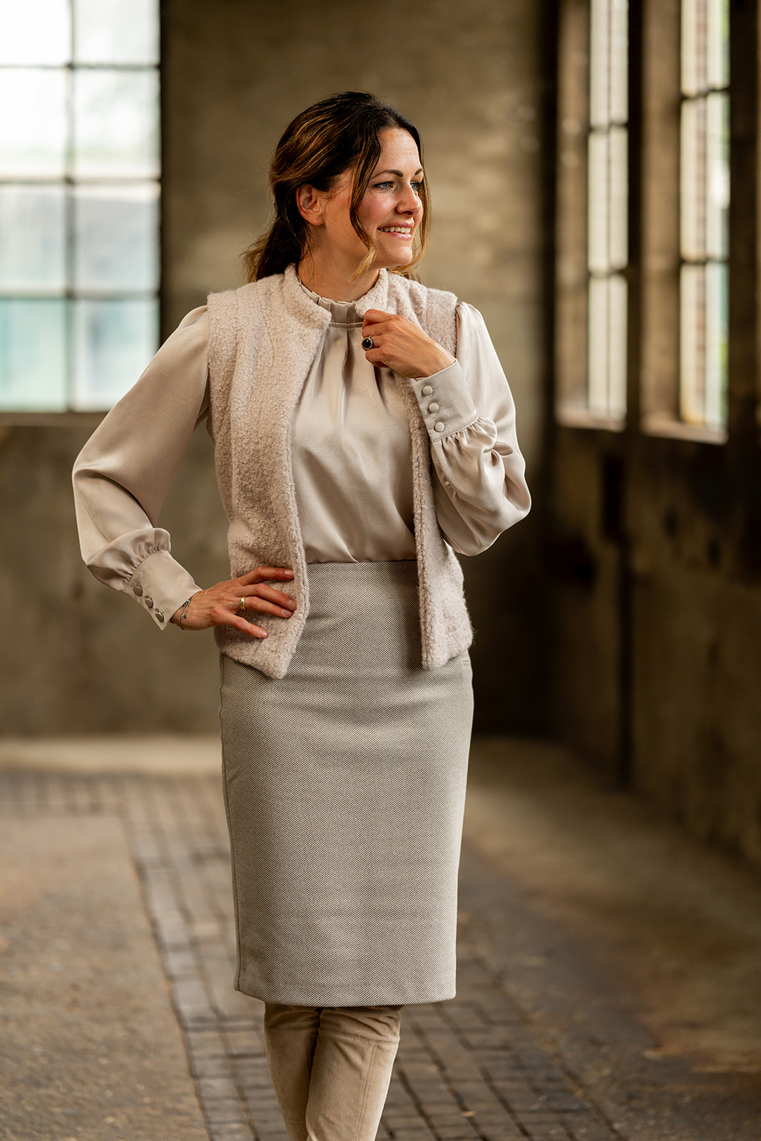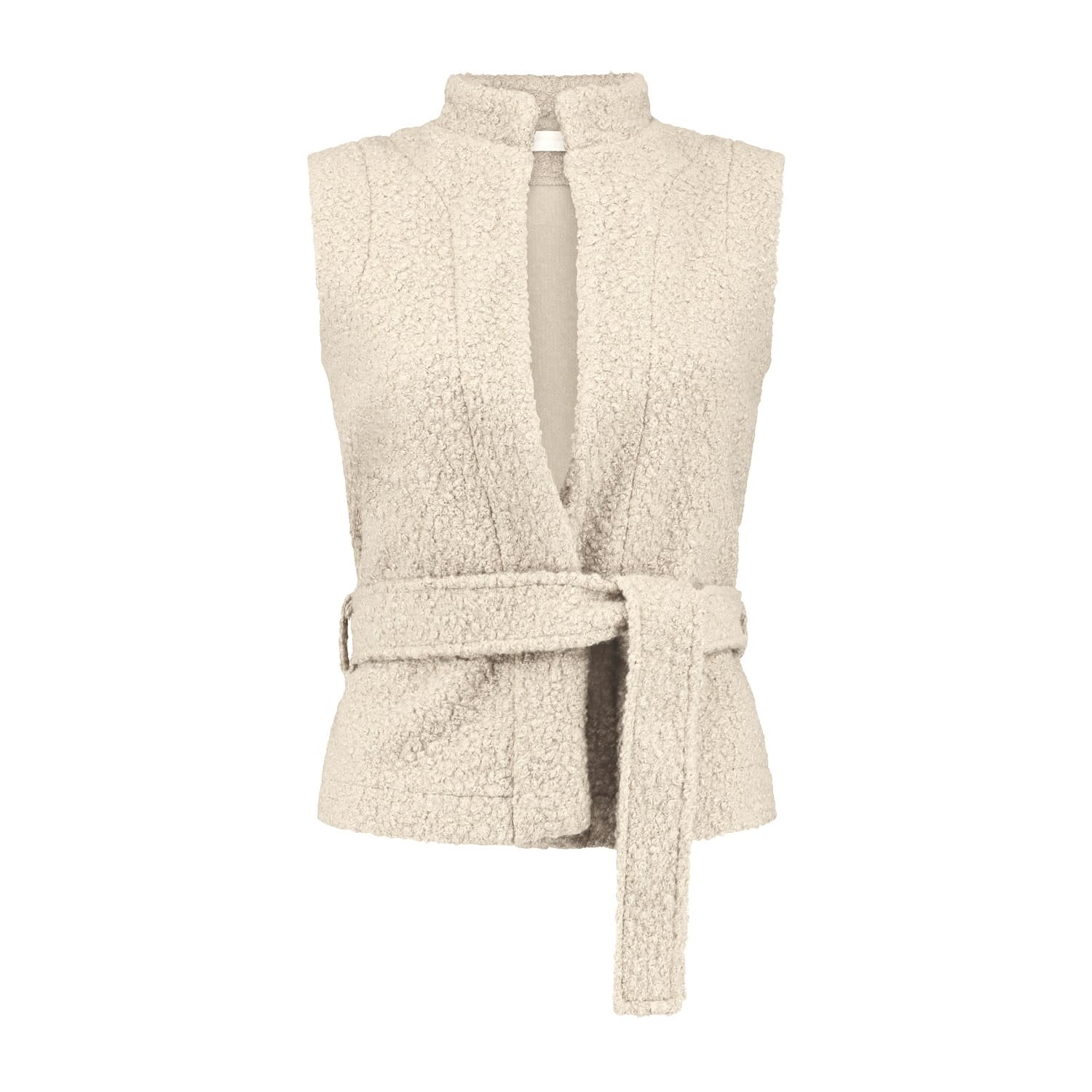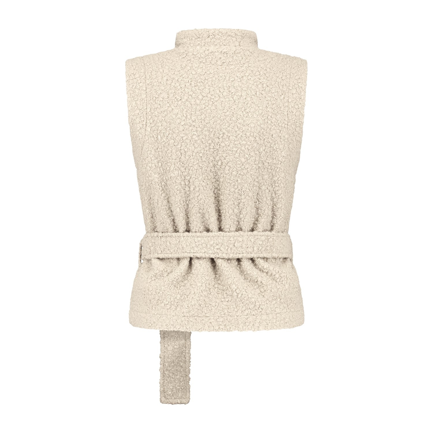 Gilet met overslag en strikceintuur om de taille. Het gilet is gemaakt in een luxe boucle kwaliteitsstof.