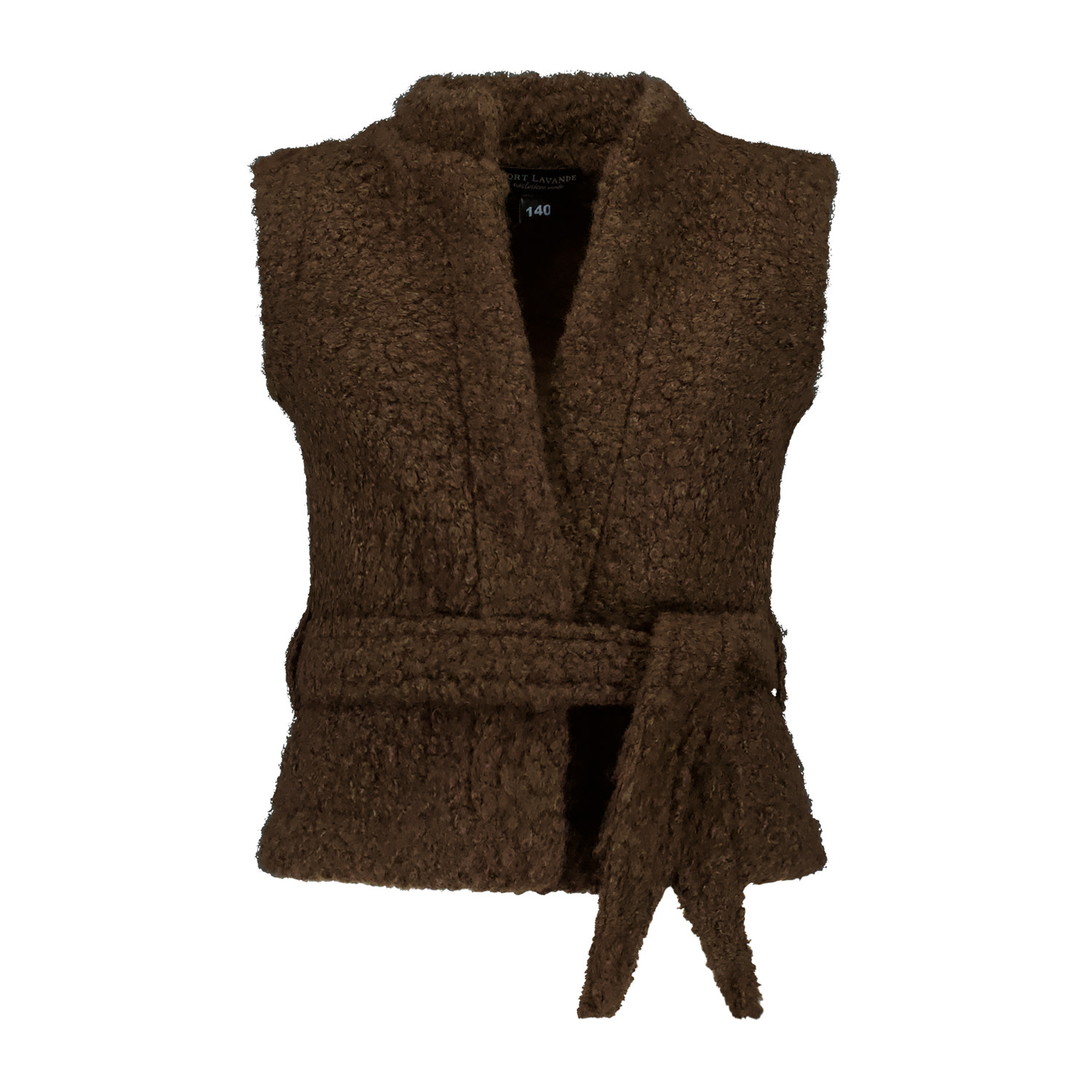 Gilet met overslag en strikceintuur om de taille. Het gilet is gemaakt in een luxe boucle kwaliteitsstof.