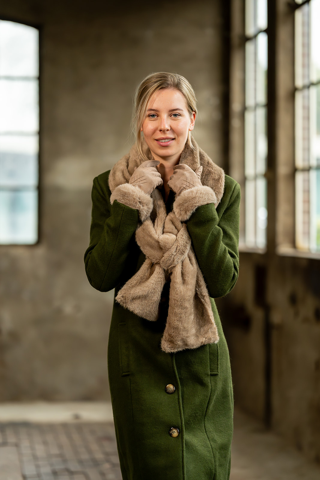 Handschoen in zwart suedine met bontrand. Kleur zandkleur Materiaal 70% viscose 30% katoen Afmeting (bxdxh) één maat ...Handschoen in zwart suedine met bontrand.KleurzandkleurMateriaal70% viscose 30% katoenAfmeting (bxdxh)één maatToon meerToon minder