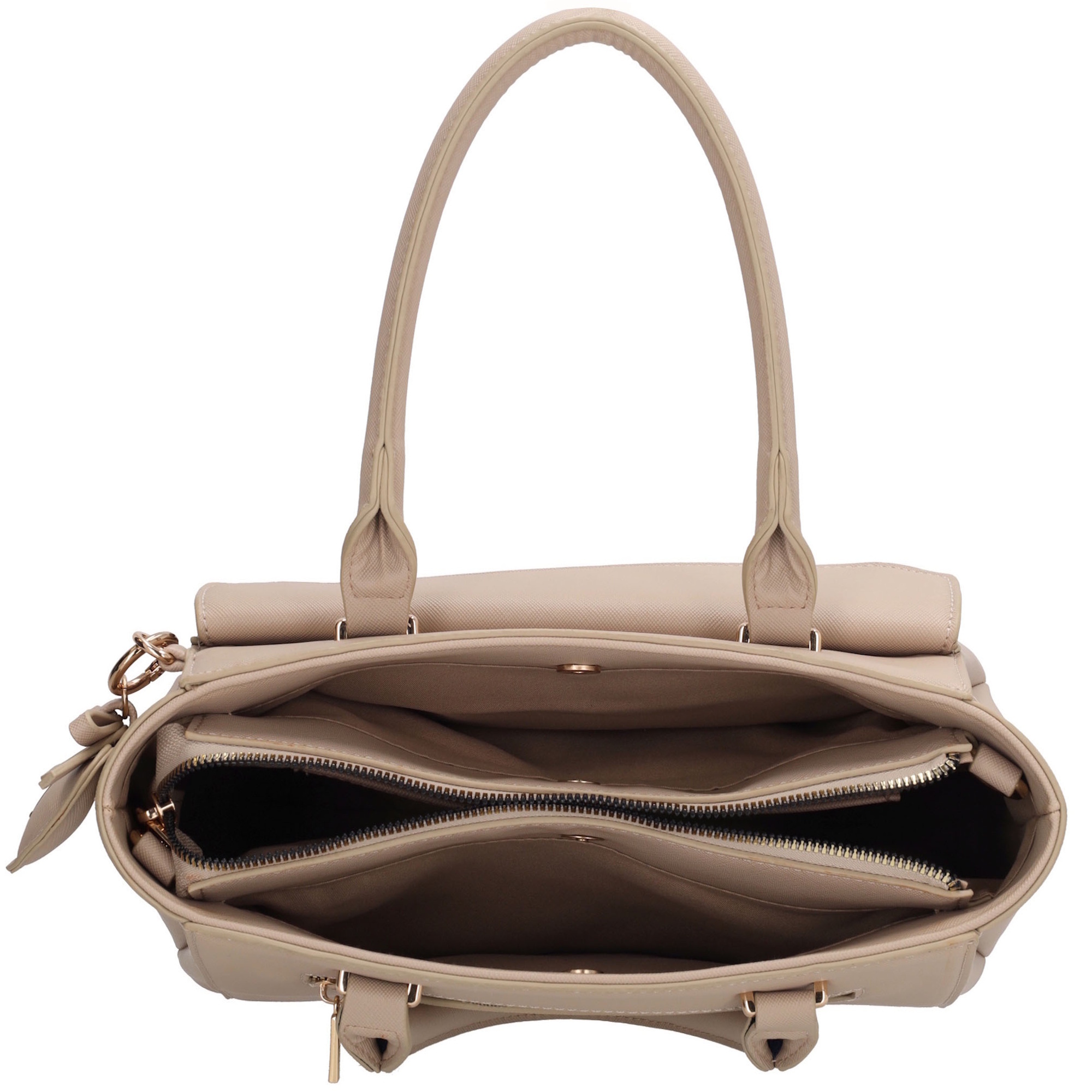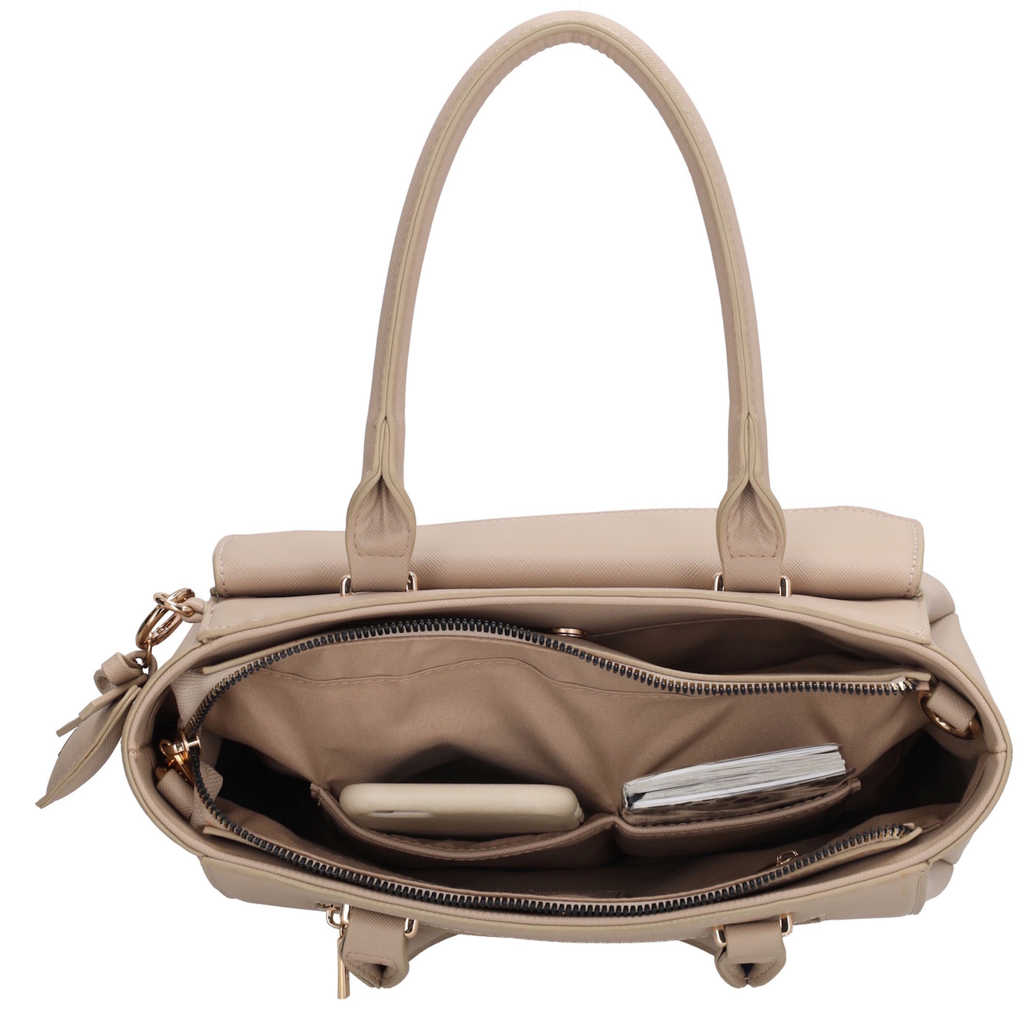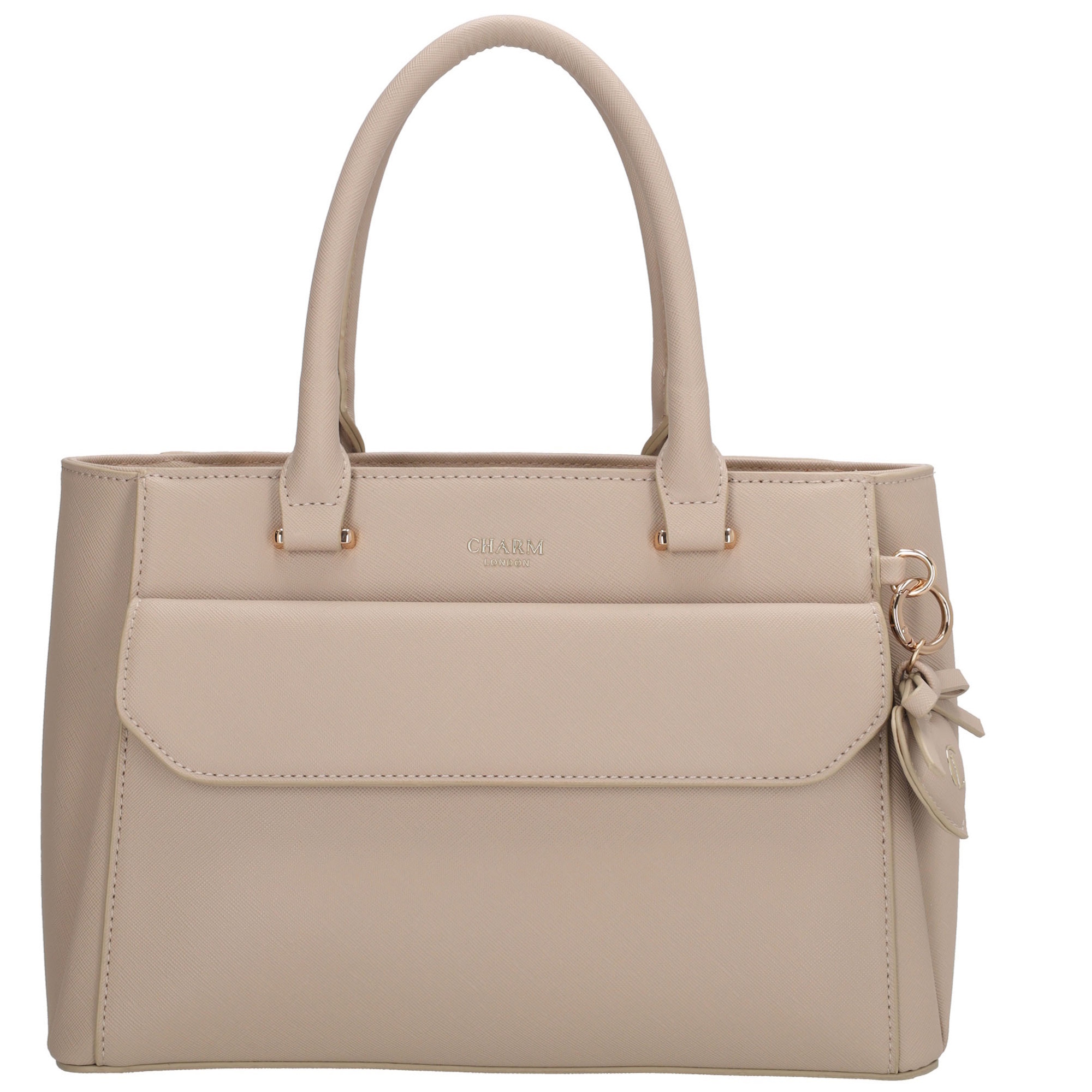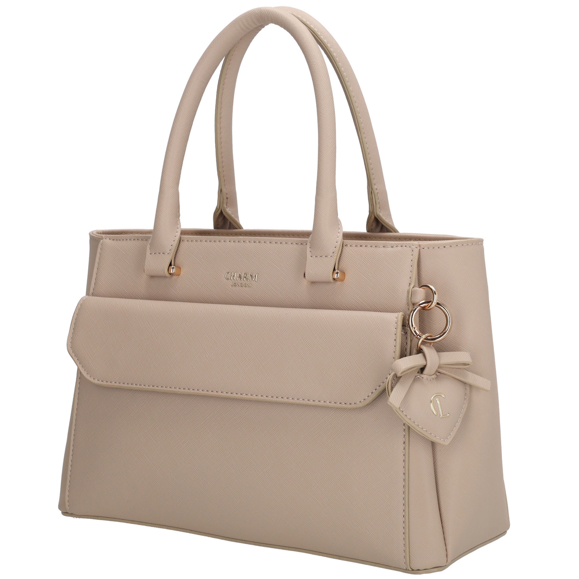 De Charm London Cambridge Handtas is een stijlvolle en functionele tas met een klassieke uitstraling. De tas heeft een slimme indeling met een hoofdritsvak en twee extra vakken die sluiten...De Charm London Cambridge Handtas is een stijlvolle en functionele tas met een klassieke uitstraling. De tas heeft een slimme indeling met een hoofdritsvak en twee extra vakken die sluiten met een drukknoop – ideaal om je spullen overzichtelijk op te bergen. Aan de binnenkant vind je een ritsvak en twee insteekvakken voor je kleinere essentials. Aan de voorkant bevindt zich een extra vak met een klep en twee drukkers, perfect voor items die je snel bij de hand wilt hebben. Aan de achterkant zit bovendien nog een ritsvak voor extra opbergruimte. De tas is voorzien van een verstelbare en afneembare schouderband, zodat je haar zowel in de hand als over de schouder kunt dragen. De goudkleurige hardware geeft de tas een elegante finishing touch.KleurlichttaupeMateriaalimitatielederMerkCharm LondonAfmeting (bxdxh)30 x 12 x 21Toon meerToon minder