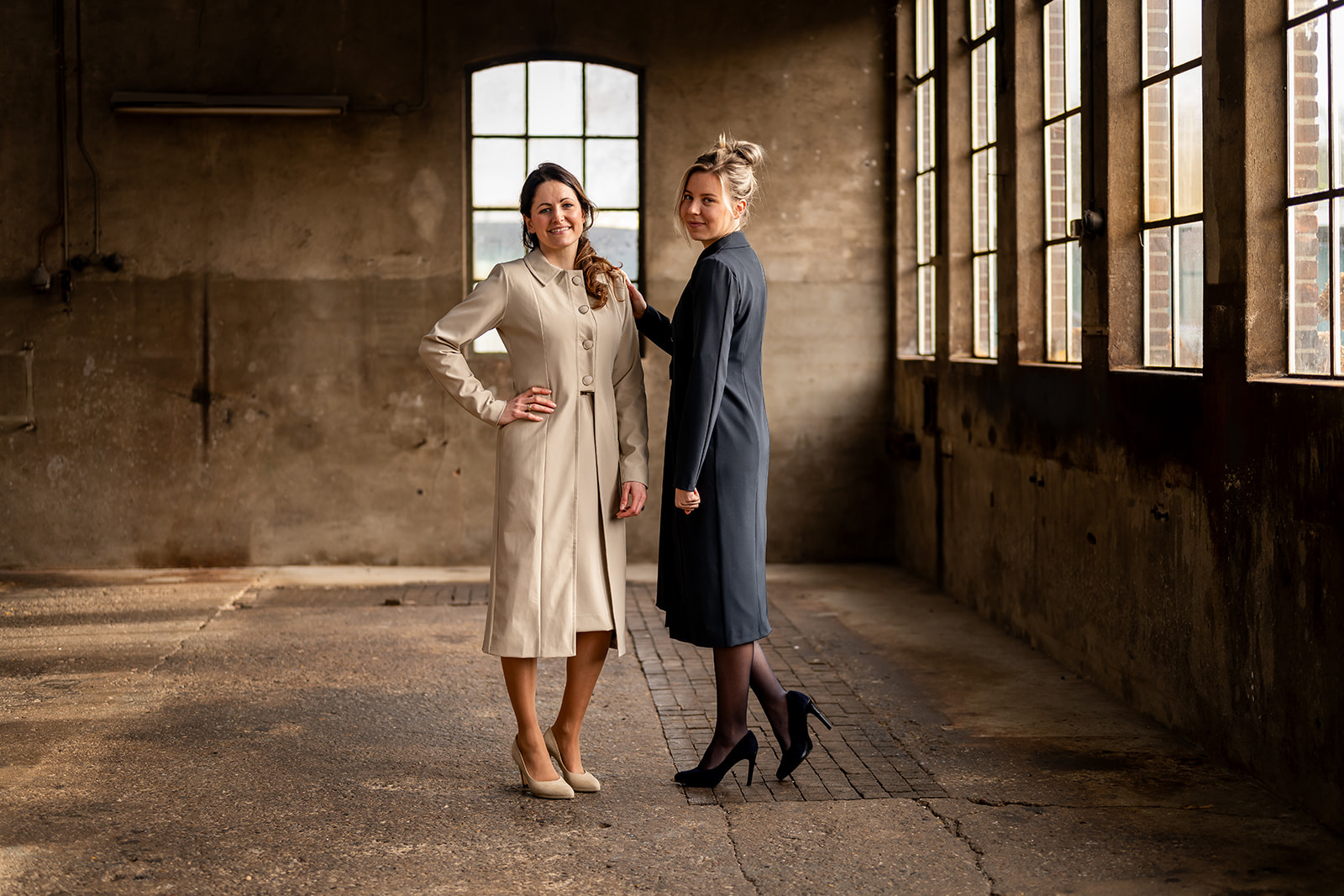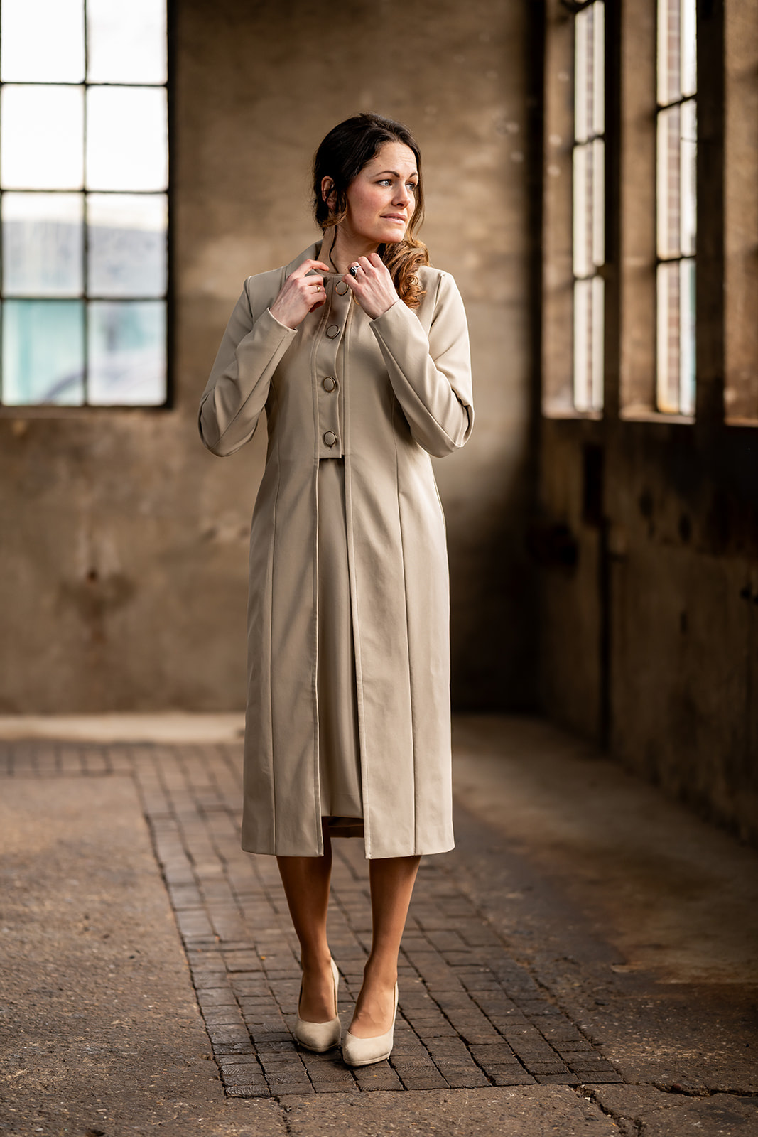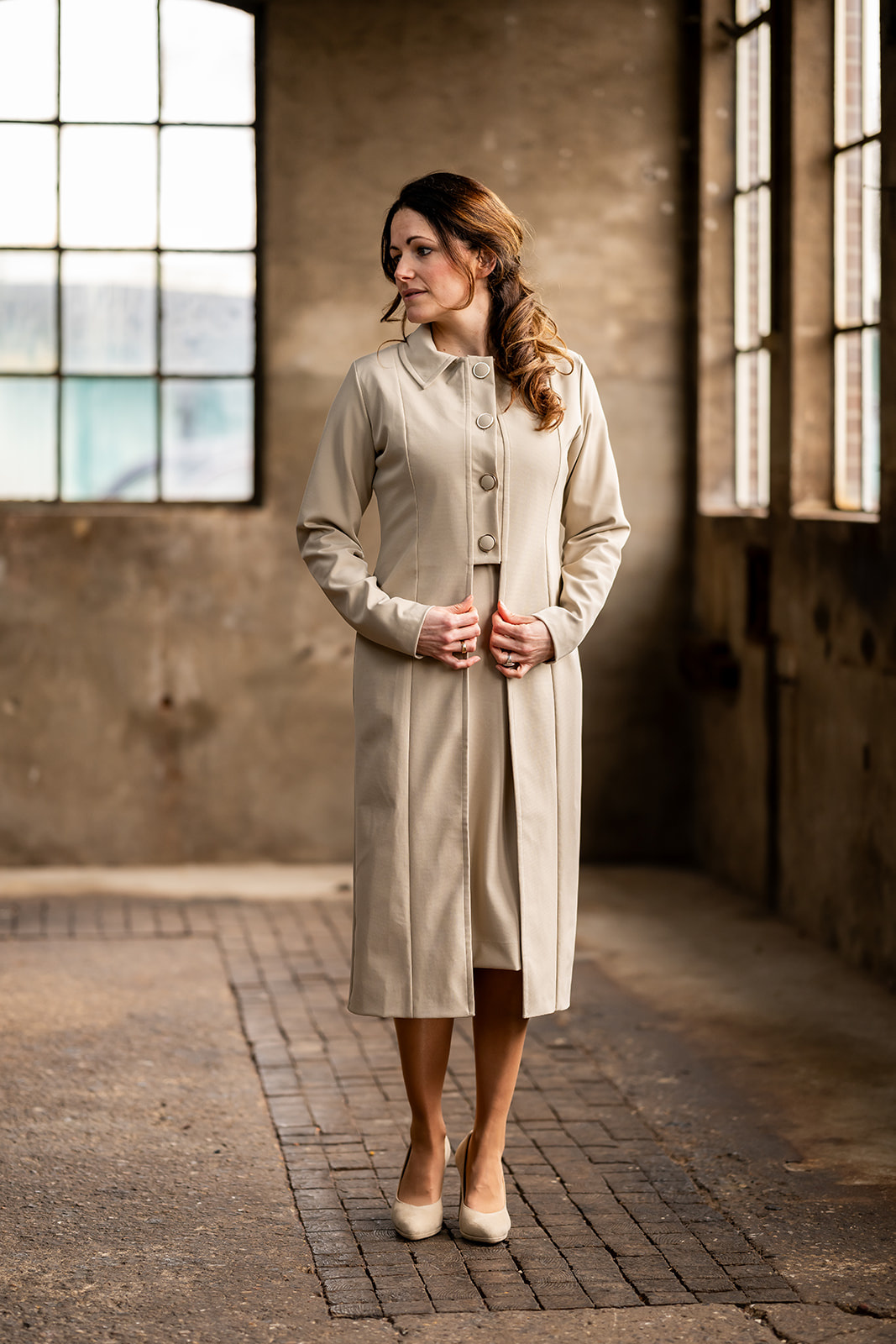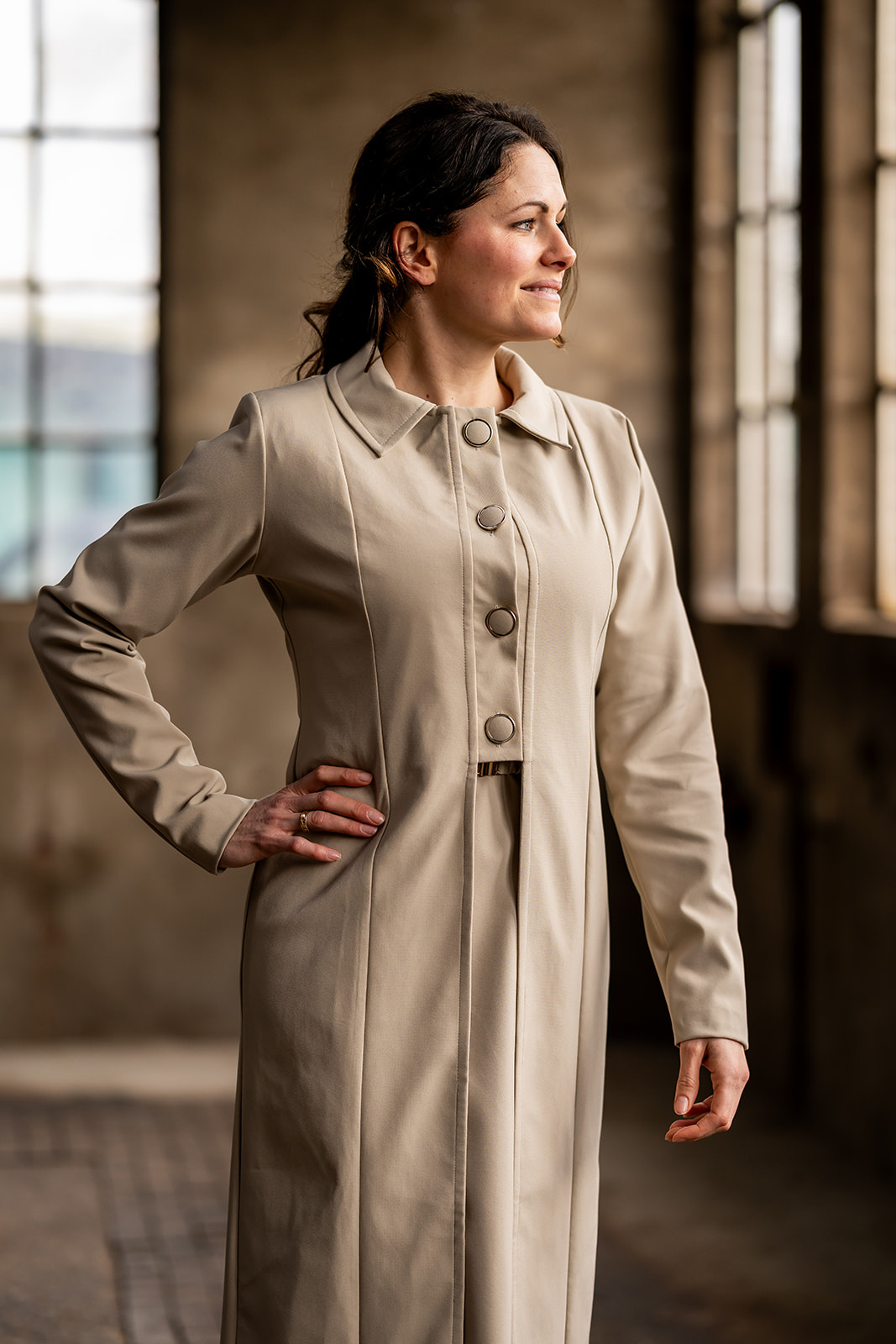 Lange jas met kraag en diverse figuur- deelnaden rondom. De jas heeft voorraan een kort smal pasje met knoopsluiting. De jas is voorzien van een voeringstof en is gemaakt in een stevige double wave kwaliteitsstof.