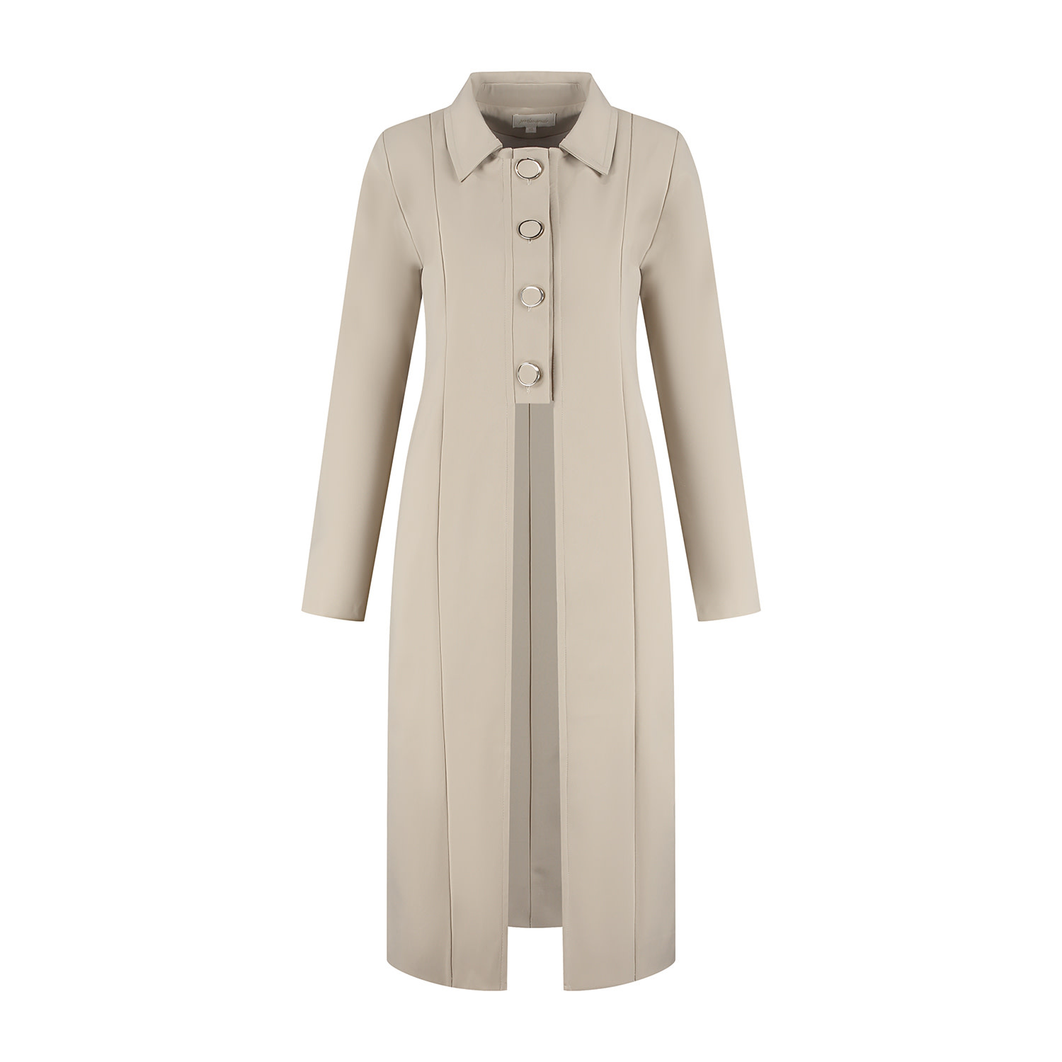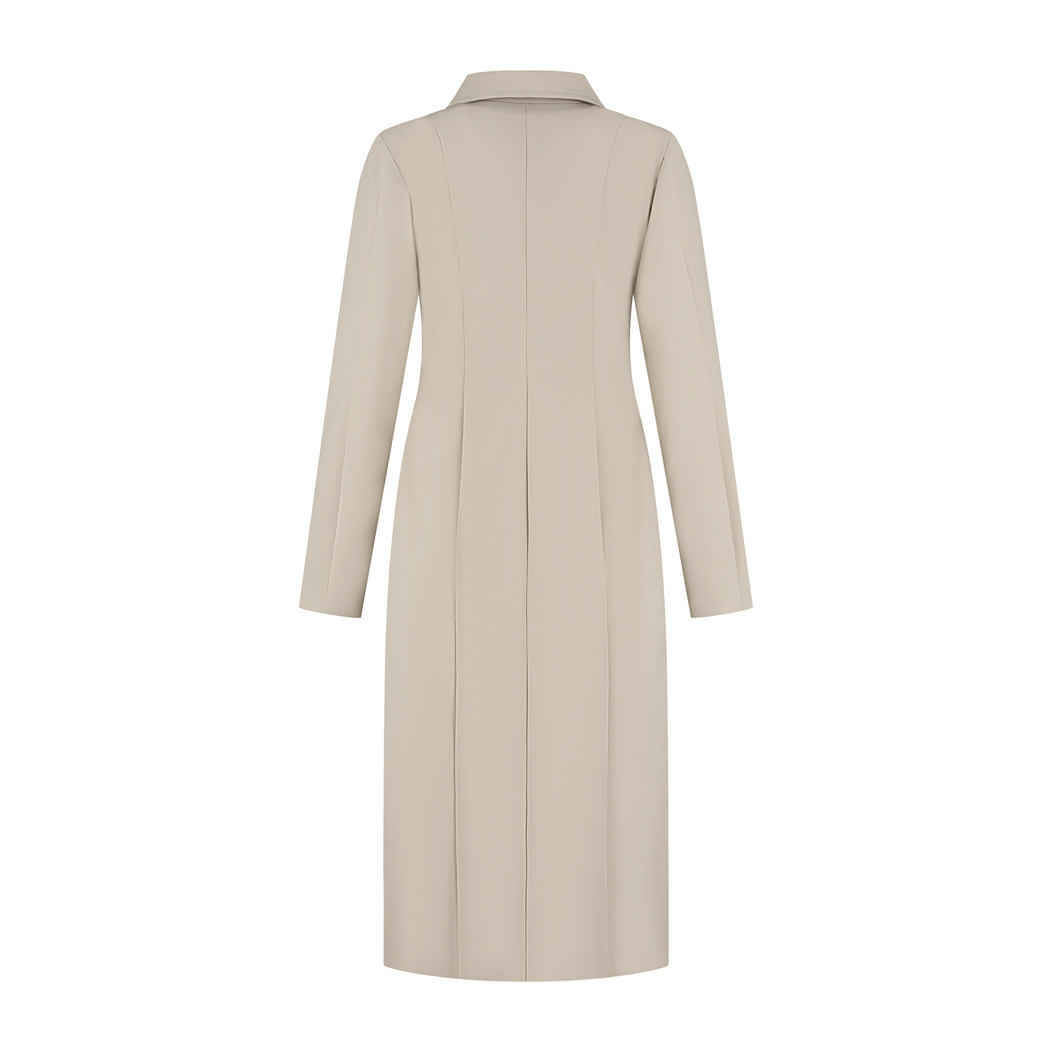 Lange jas met kraag en diverse figuur- deelnaden rondom. De jas heeft voorraan een kort smal pasje met knoopsluiting. De jas is voorzien van een voeringstof en is gemaakt in een stevige double wave kw...