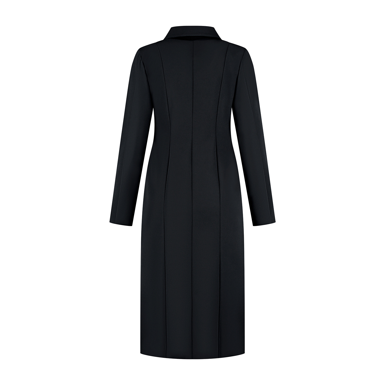 Lange jas met kraag en diverse figuur- deelnaden rondom. De jas heeft voorraan een kort smal pasje met knoopsluiting. De jas is voorzien van een voeringstof en is gemaakt in een stevige double wave kw...