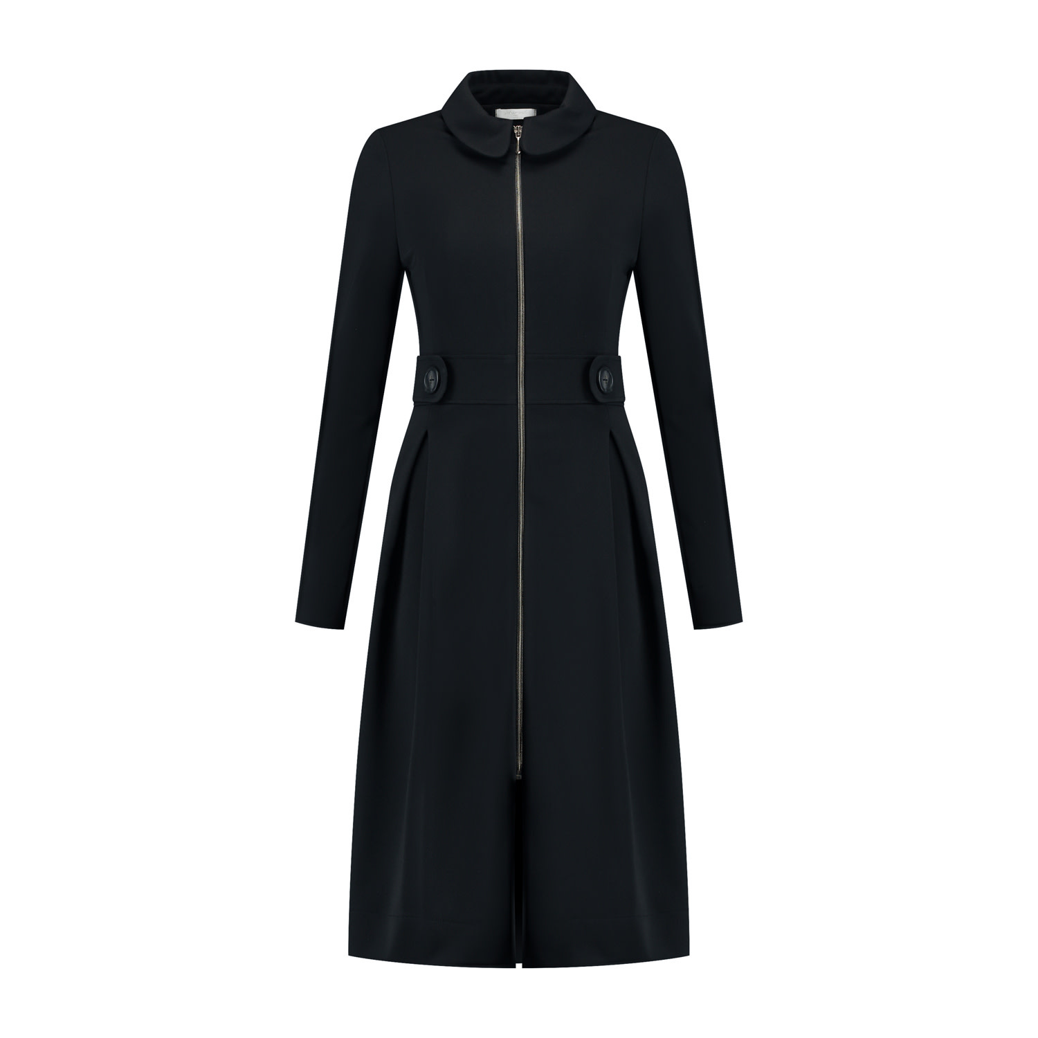 Licht getailleerde 3/4 jas met ritssluiting en mooi boordkraagje. Deze jas/mantel heeft een brede taillepas voorzien van lummels en knopen. Vanuit de taille heeft de jas een aantal plooien en in de zijnaad steekzakken. Deze jas is voorzien van voering, maar niet gewatteerd (dus niet geschikt als echt een 'winterjas') en verder gemaakt in een mooie twill kwaliteitsstof.