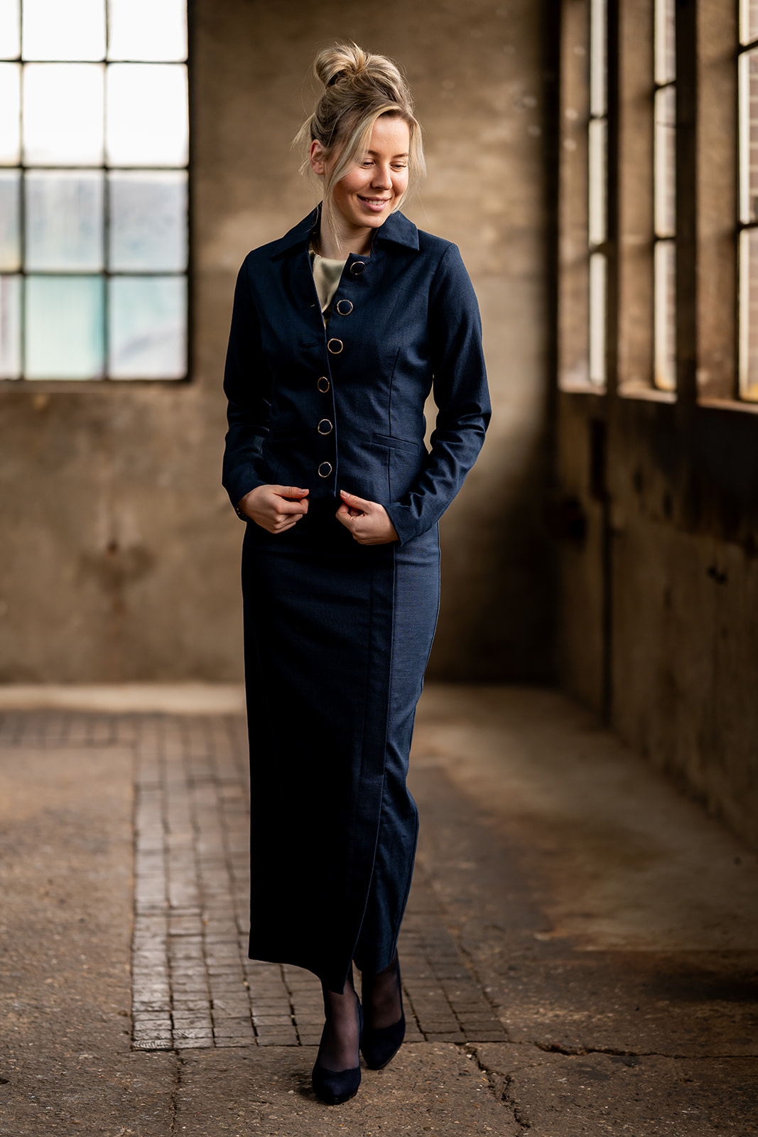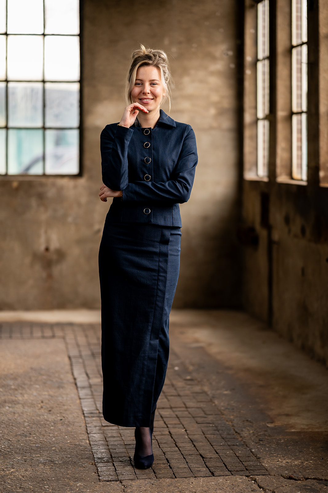 Getailleerd jasje met staander en kraag. Het jasje heeft paspels vooraan en sluit d.m.v. een knopenlijst met stofknopen voorzien van een licht goudkleurig randje. Het jasje is voorzien van een voeringstof en is gemaakt in een mooie stevige linnen kwaliteitsstof.