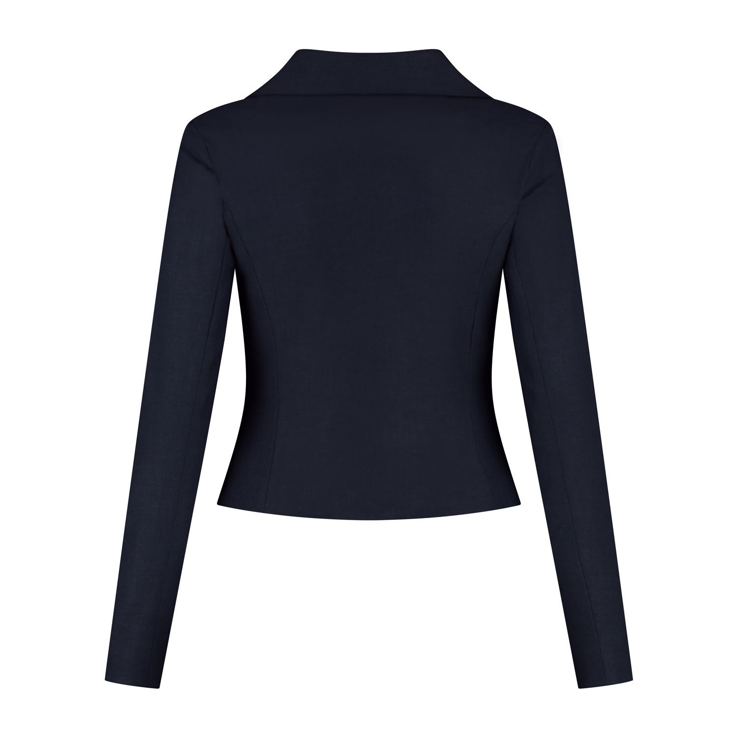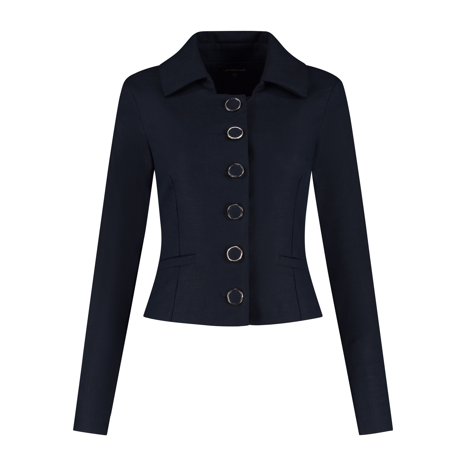 Getailleerd jasje met staander en kraag. Het jasje heeft paspels vooraan en sluit d.m.v. een knopenlijst met stofknopen voorzien van een licht goudkleurig randje. Het jasje is voorzien van een voering...