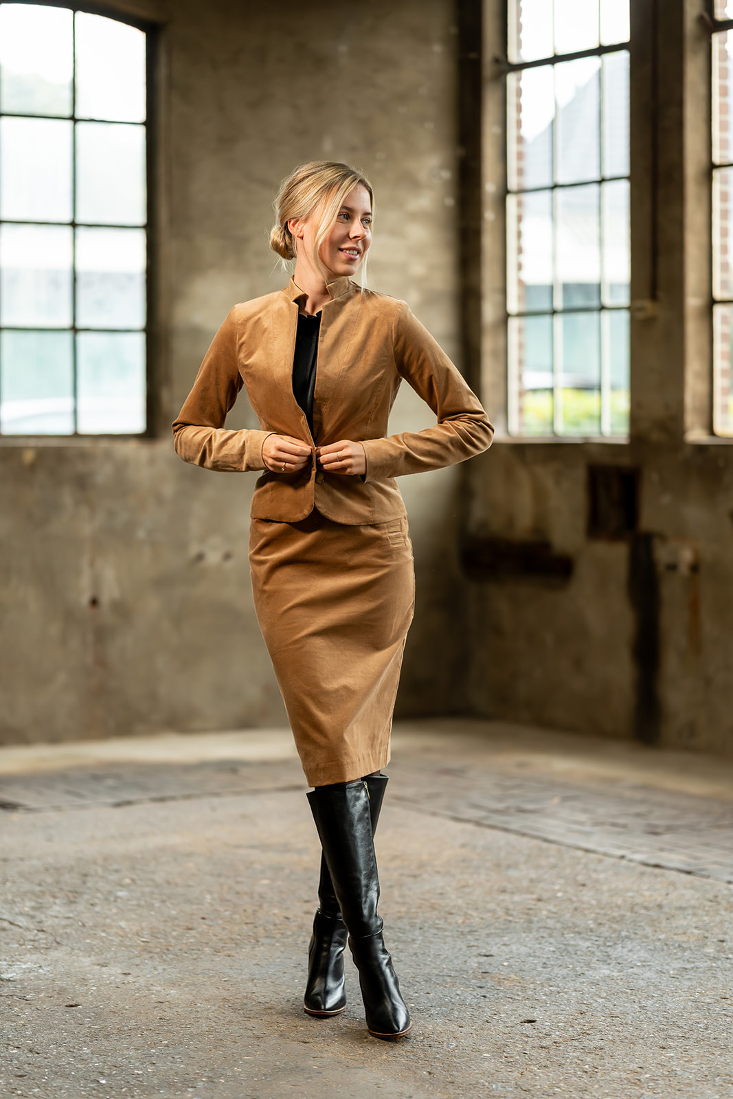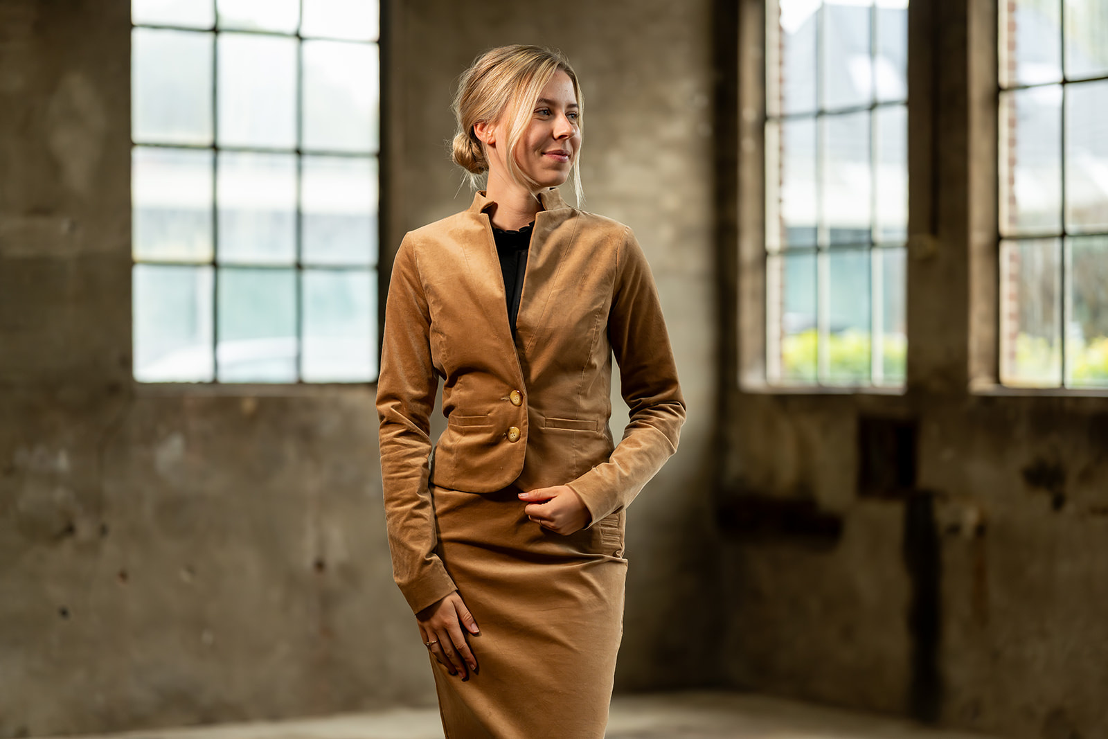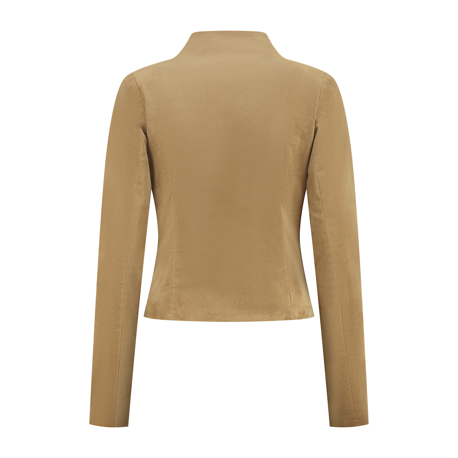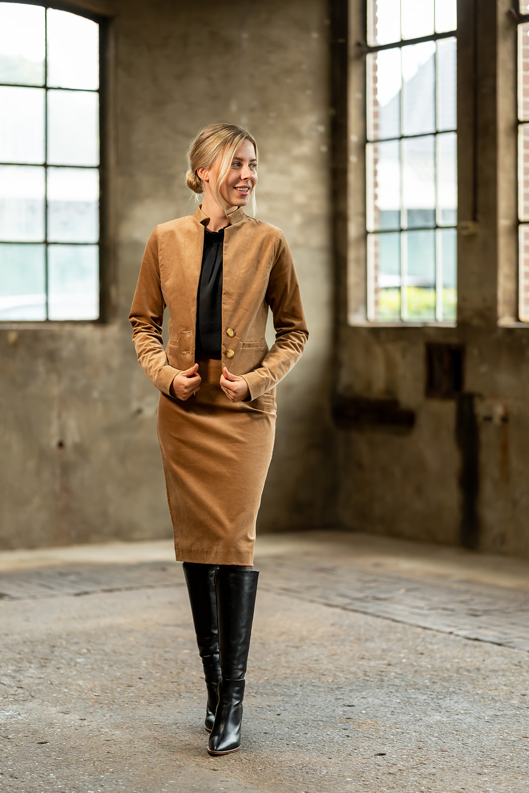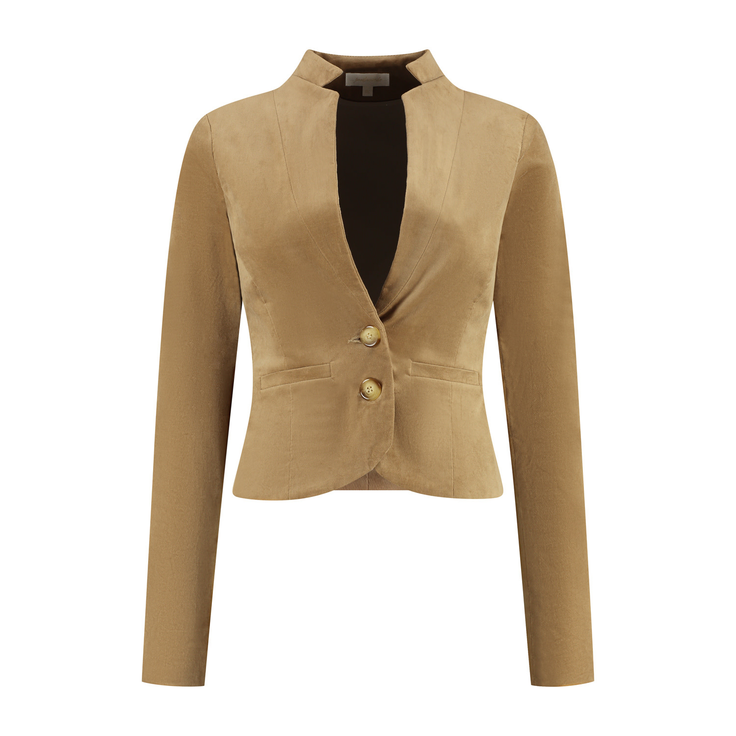 Stijlvol en chique getailleerd damesjasje met een opstaande kraag en aangeknipte liggende reverkraag. Het jasje sluit d.m.v van 2 knopen en heeft 2 kleine paspels op het voorpand. Gemaakt van heerlijk zachte velourse kwaliteitsstof met een klein beetje elastan erin voor een fijne pasvorm. Dit jasje is voorzien van een voering en gemaakt in dezelfde stof als de rokken Hilde en rokken Judith. Perfect voor zowel casual, zakelijke als feestelijke en speciale gelegenheden.