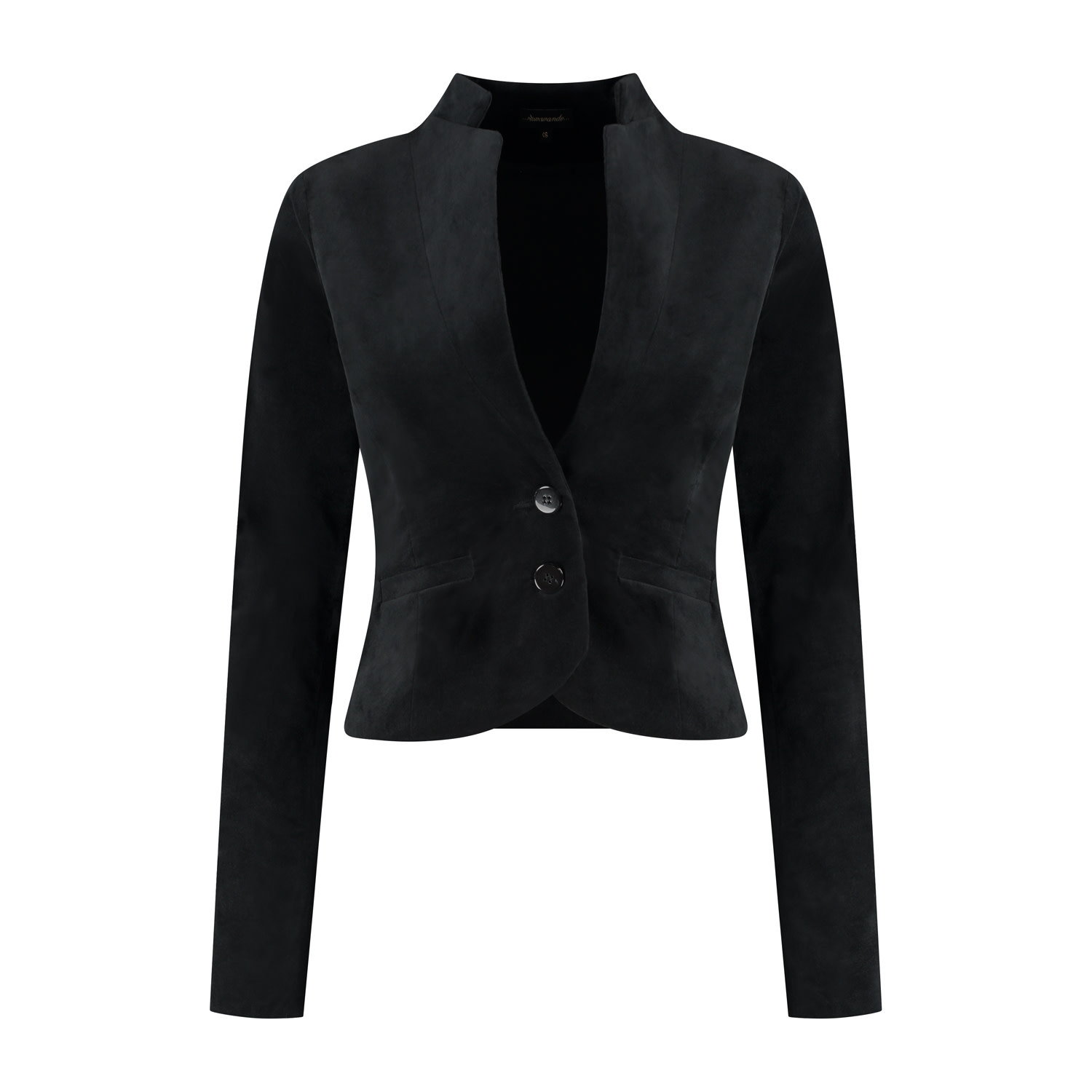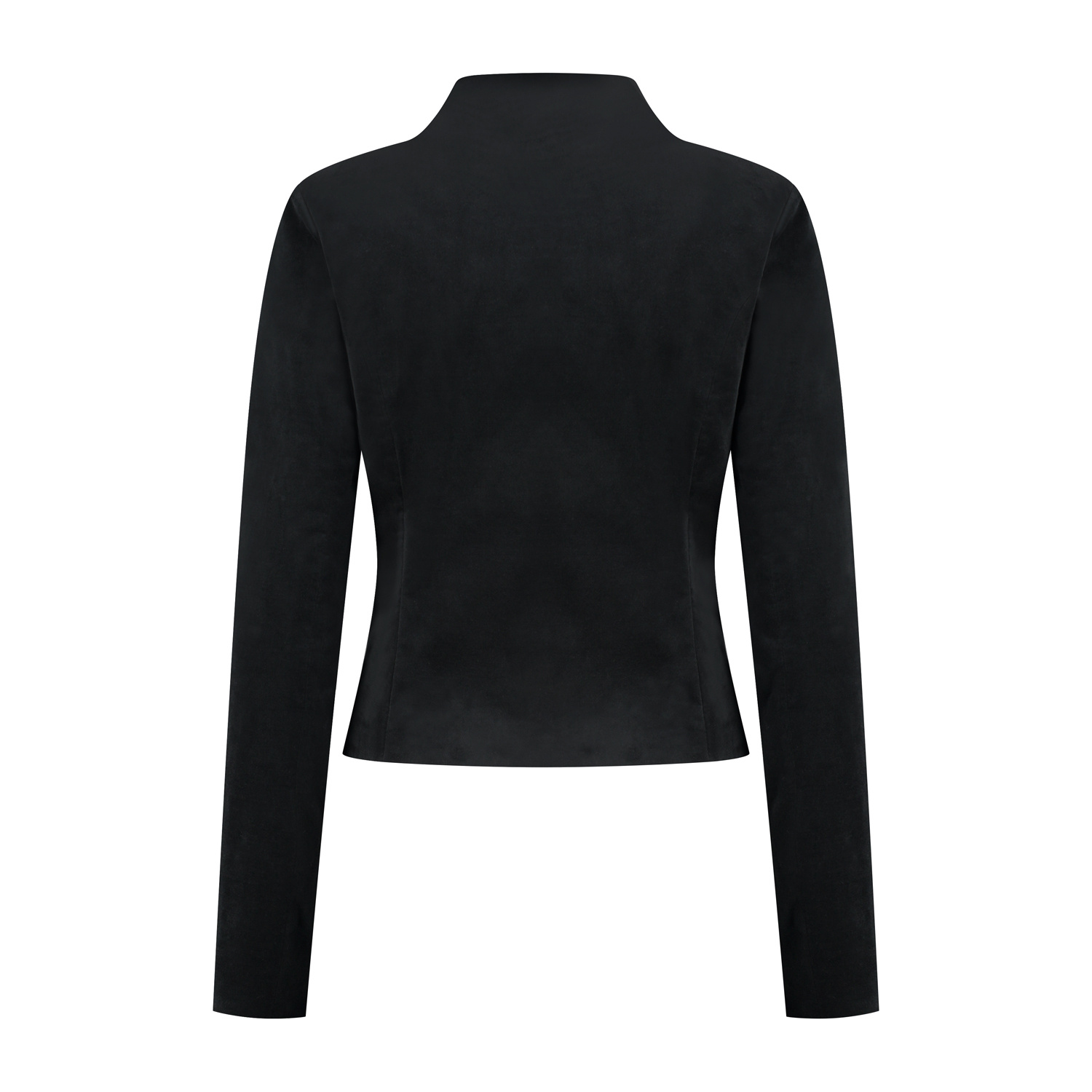 Stijlvol en chique getailleerd damesjasje met een opstaande kraag en aangeknipte liggende reverkraag. Het jasje sluit d.m.v van 2 knopen en heeft 2 kleine paspels op het voorpand. Gemaakt van heerlijk zachte velourse kwaliteitsstof met een klein beetje elastan erin voor een fijne pasvorm. Dit jasje is gemaakt in dezelfde stof als de rokken Hilde en rokken Judith. Perfect voor zowel casual, zakelijke als feestelijke en speciale gelegenheden.