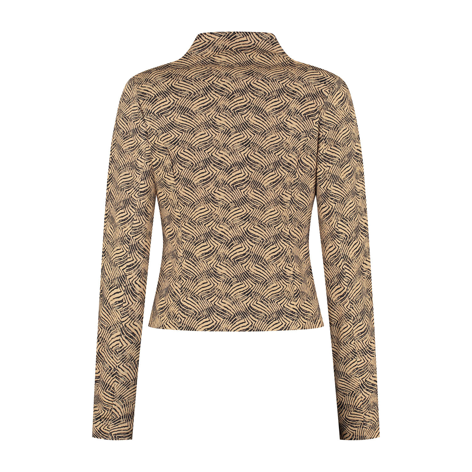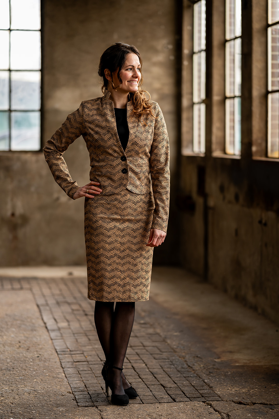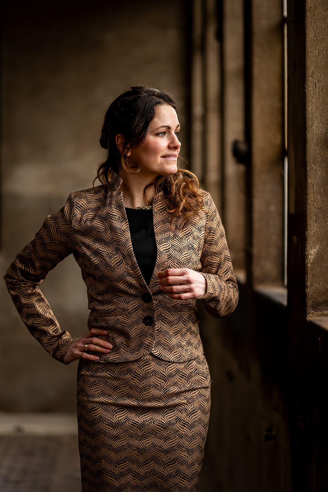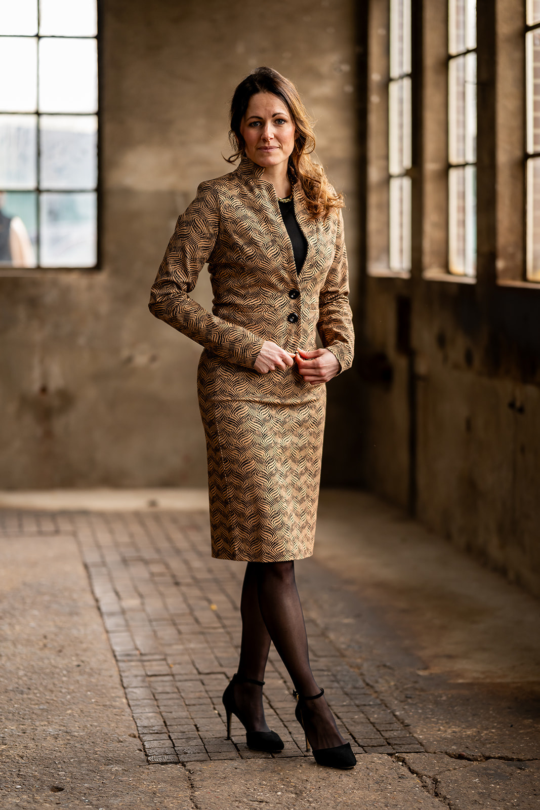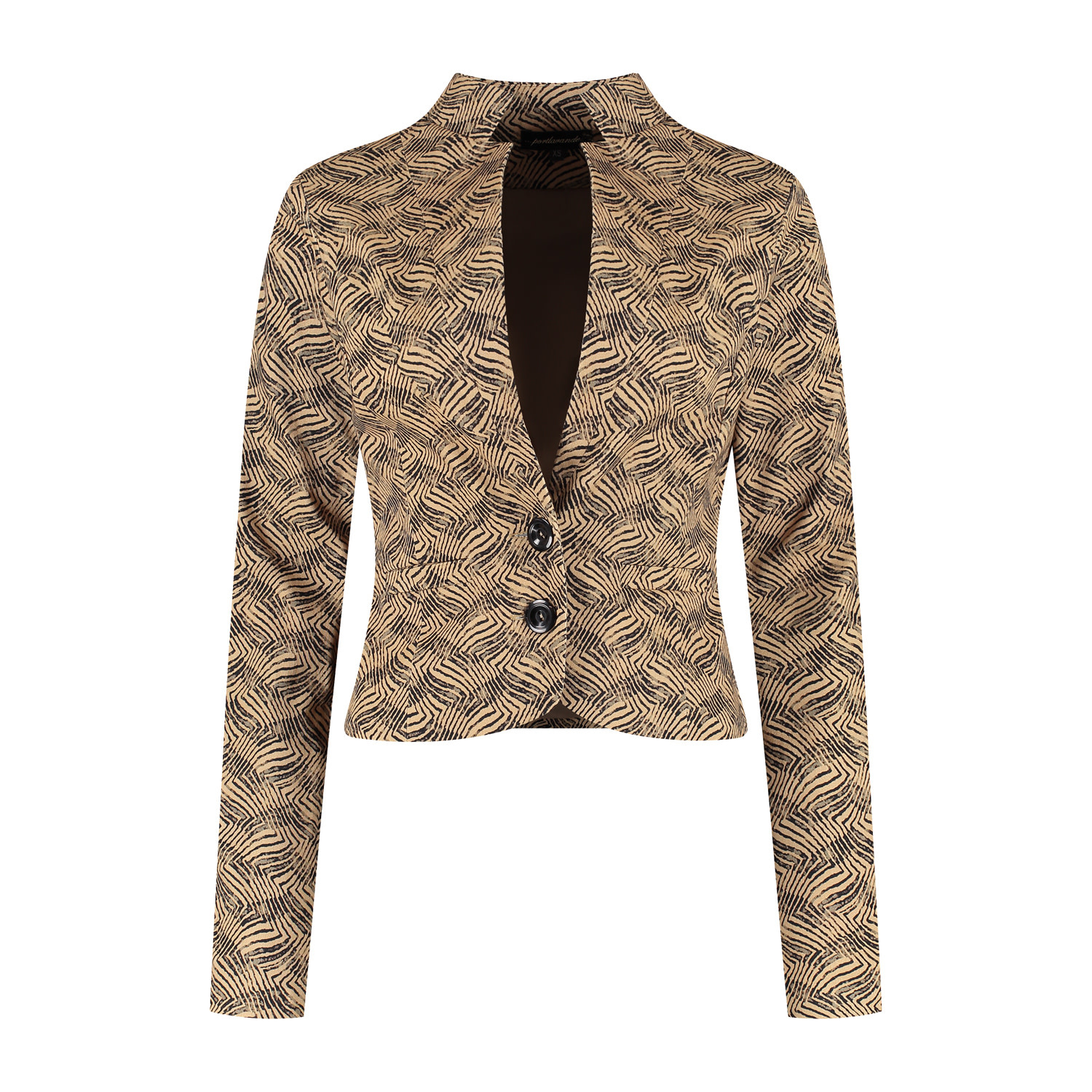 Kort getailleerd jasje met opstaande boordkraag en paspels op het voorpand. Het jasje heeft een twee knoopsluiting vooraan en is gemaakt in een stevige kwaliteitsstof met dessin.