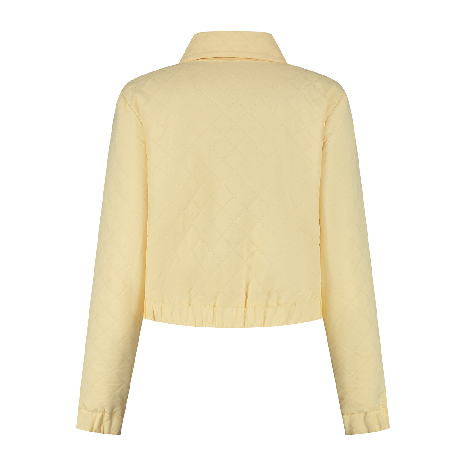 Dit stijlvolle, licht gewatteerde jasje heeft een gestikt ruitpatroon dat zorgt voor een speelse maar elegante uitstraling. De cropped pasvorm en licht getailleerde elastische boorden geven het een mo...