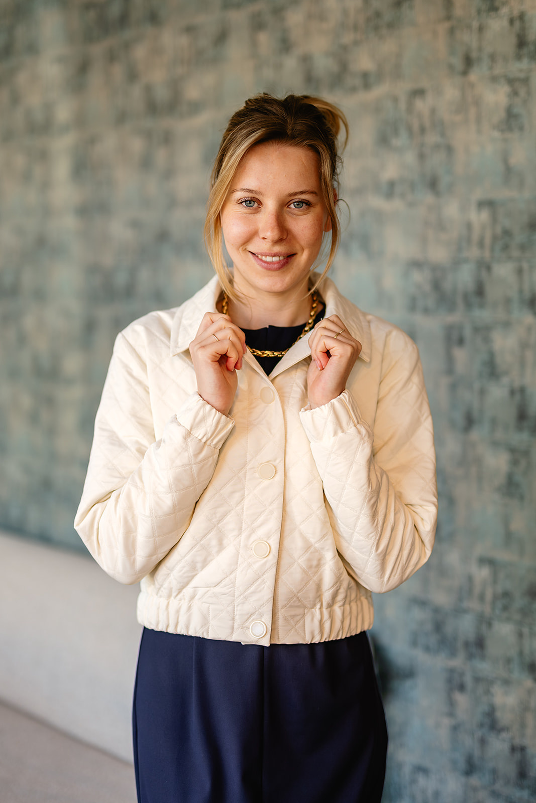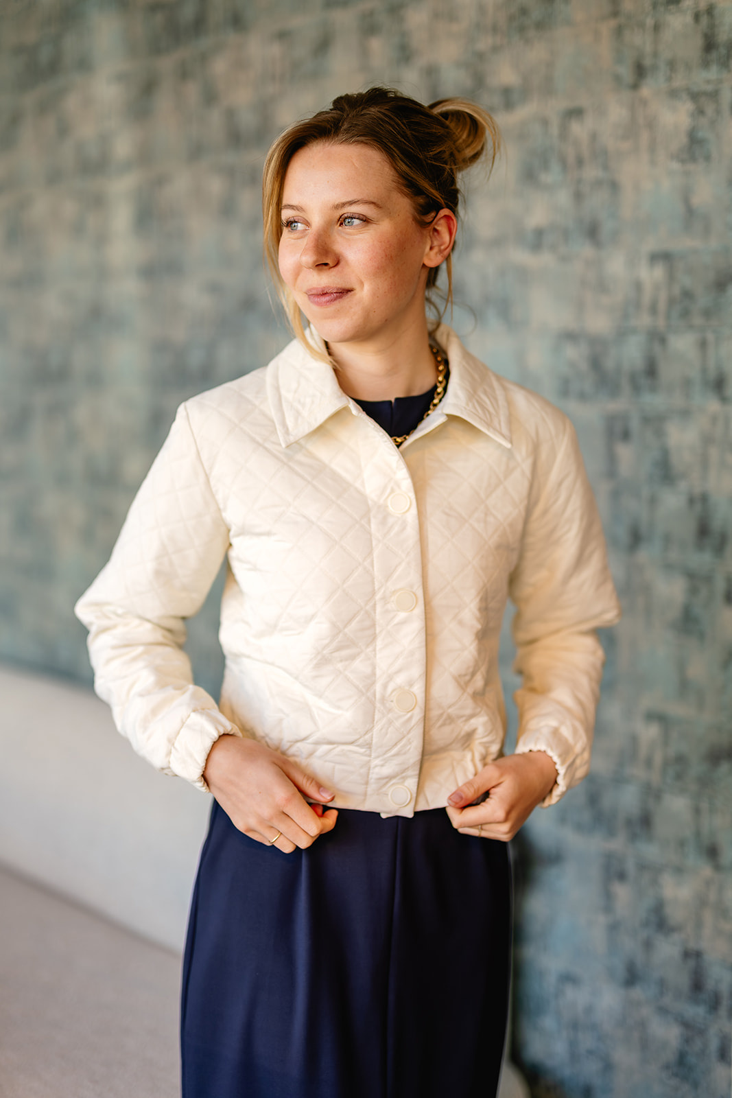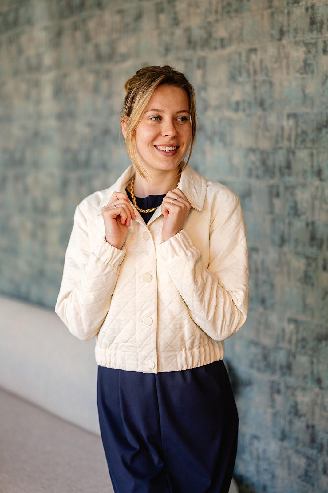 Dit stijlvolle, licht gewatteerde jasje heeft een gestikt ruitpatroon dat zorgt voor een speelse maar elegante uitstraling. De cropped pasvorm en licht getailleerde elastische boorden geven het een moderne, vrouwelijke touch. De klassieke kraag en ton-sur-ton knoopsluiting maken het ontwerp veelzijdig. Draag jasje Maria als stijlvolle tussenjas in het voorjaar of als chique laagje op koelere zomeravonden. Dit exclusieve jasje is voorzien van een voeringstof en is gemaakt in een mooie geweven kwaliteitsstof.