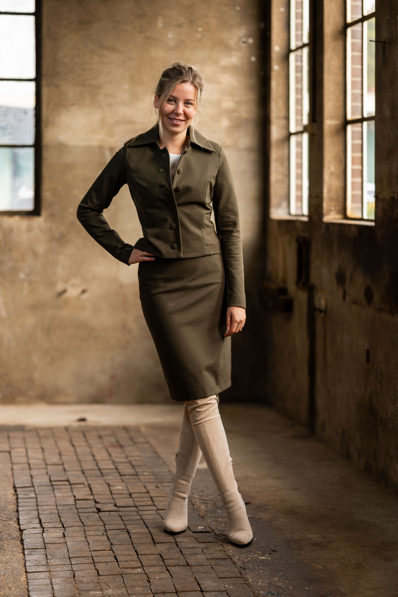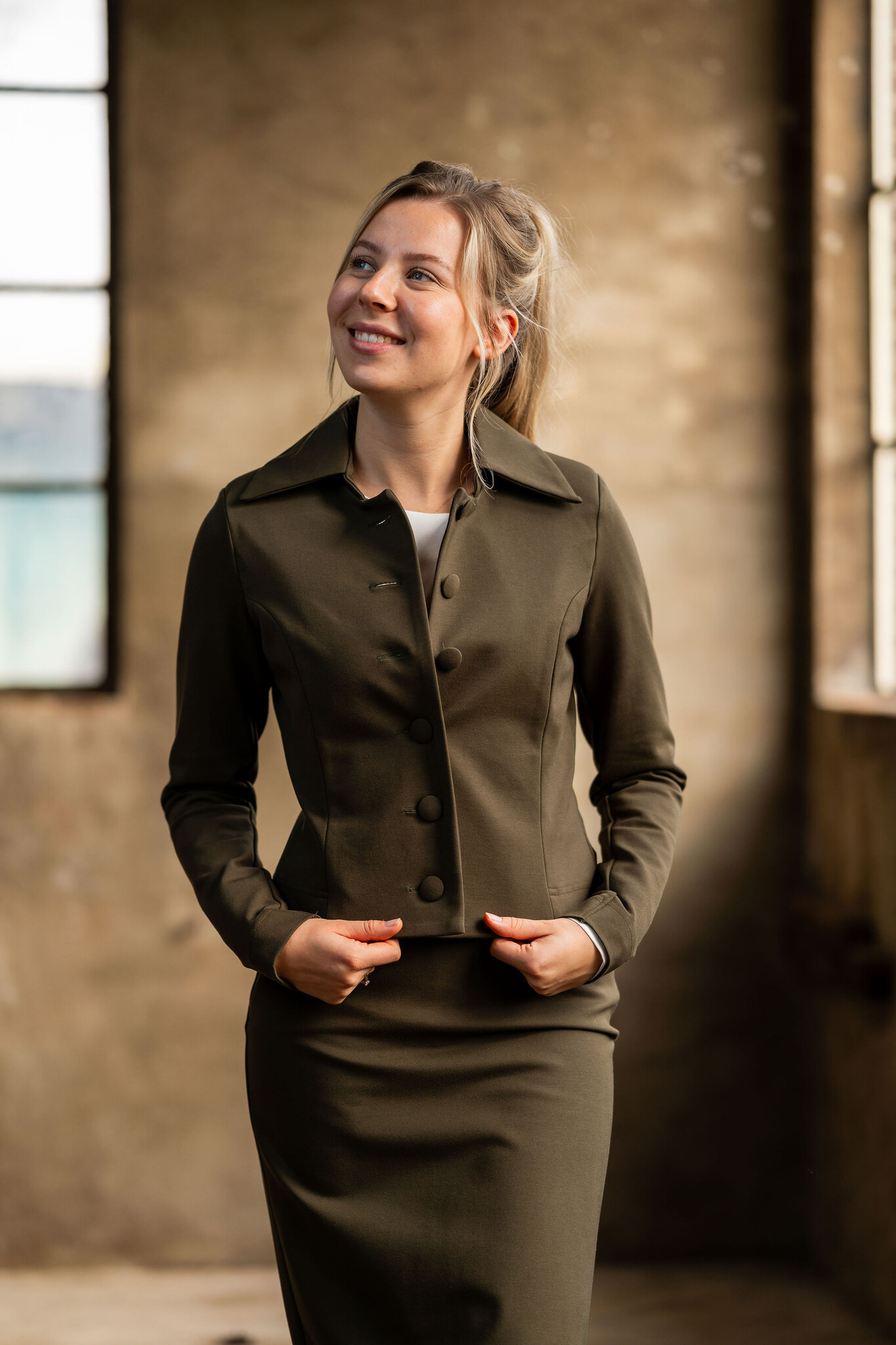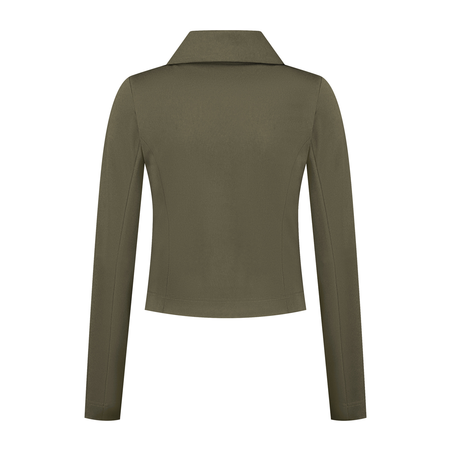 Jasje met staander en royale kraag en een stofknopen sluiting. Het jasje is kort van model en heeft een getailleerde pasvorm en is gemaakt in een luxe tricotpunto kwaliteitsstof.