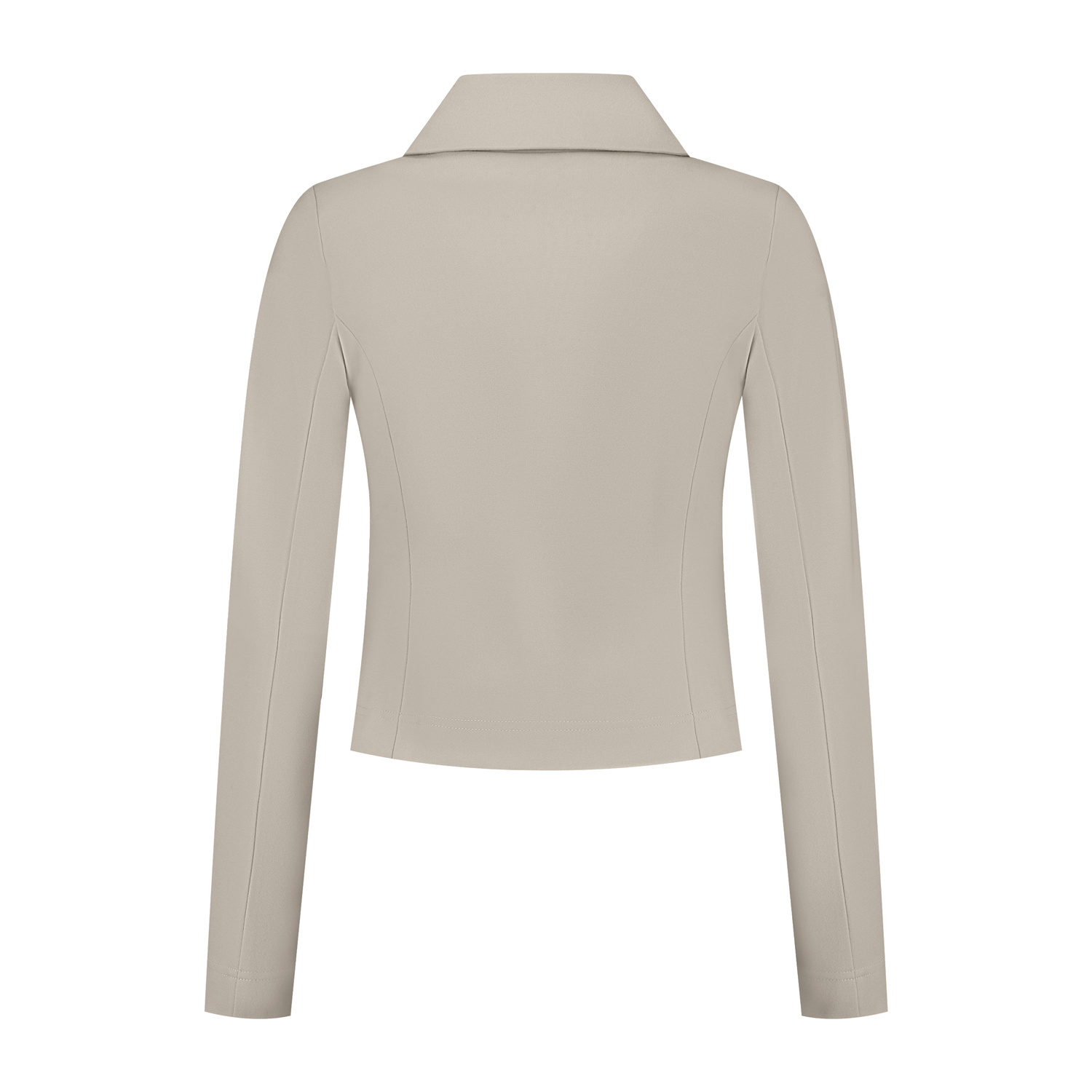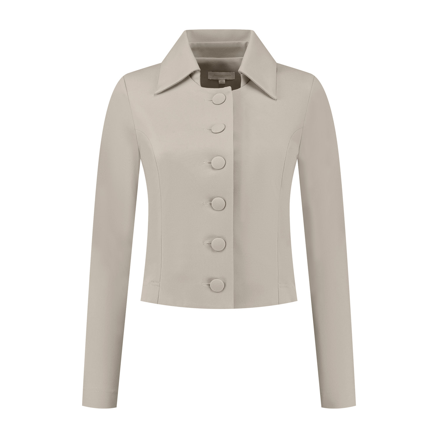 Jasje met staander en royale kraag en een stofknopen sluiting. Het jasje is kort van model en heeft een getailleerde pasvorm en is gemaakt in een luxe tricotpunto kwaliteitsstof.