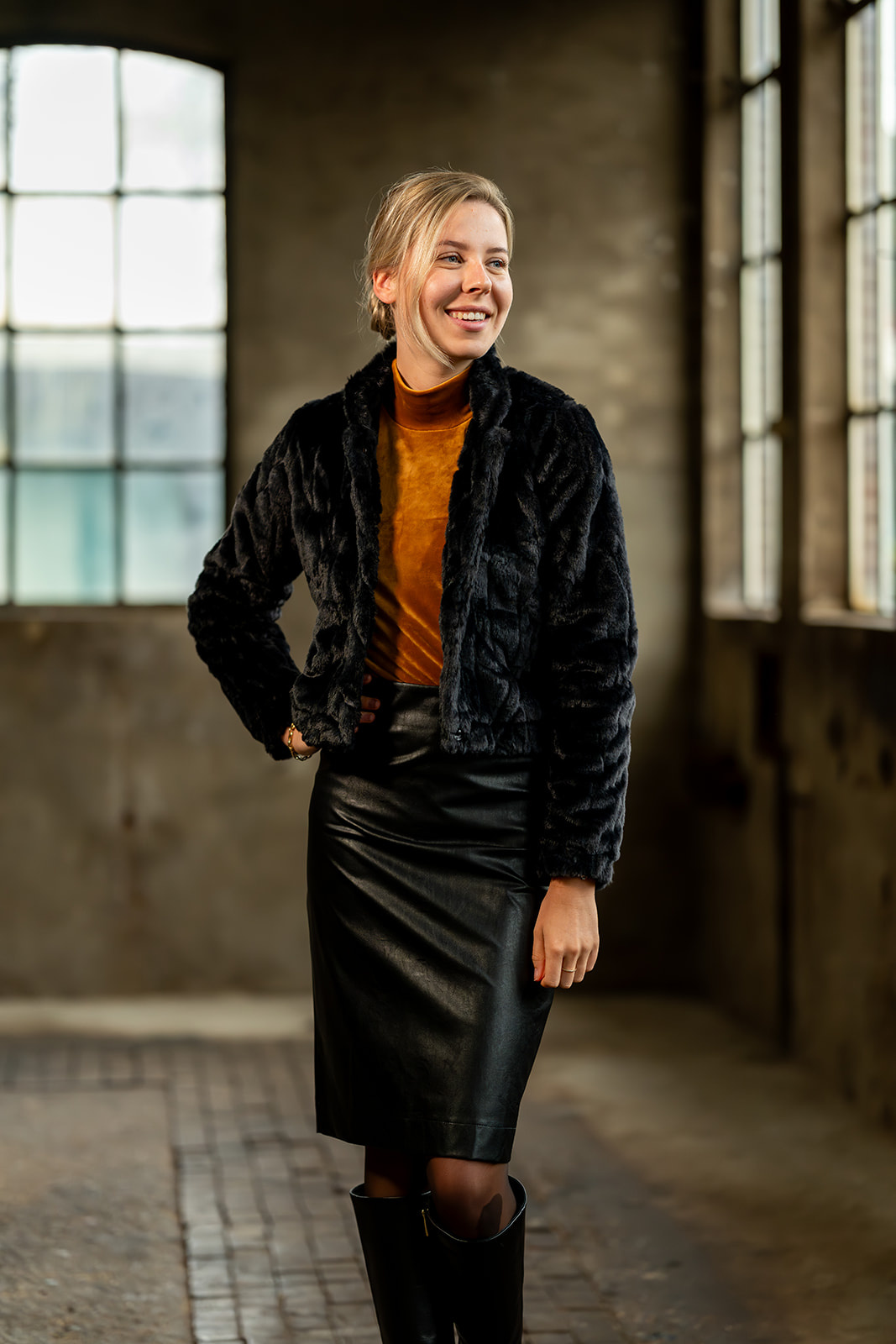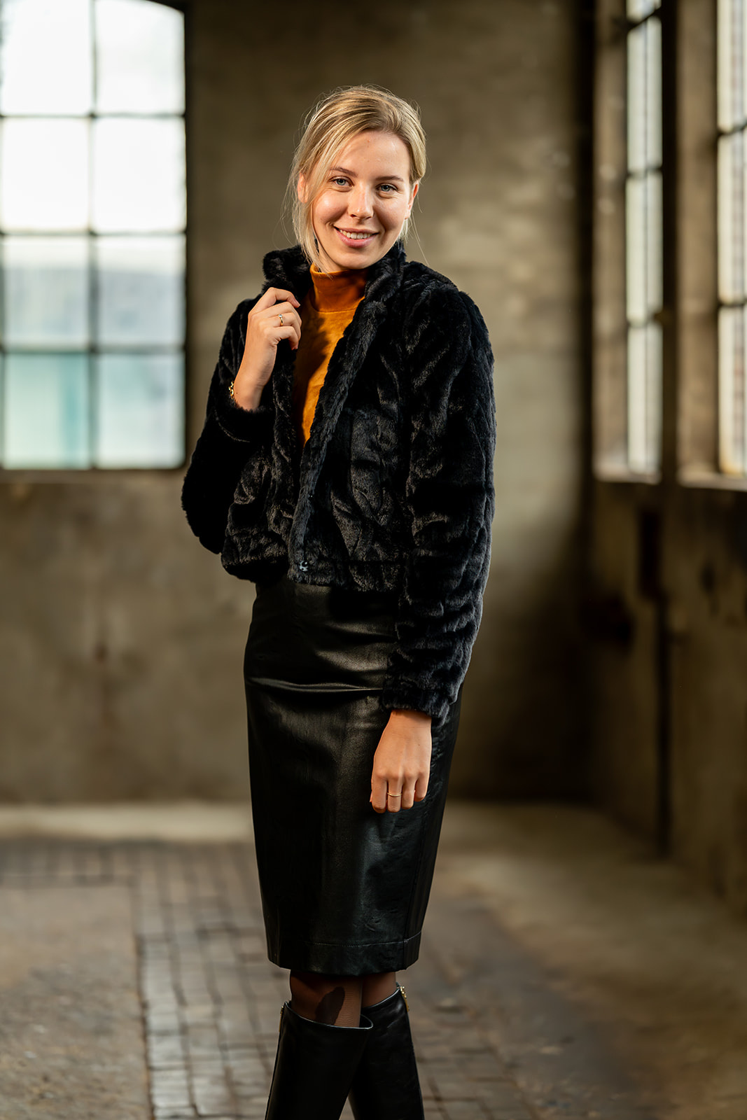 Stijlvol en chique dames imitatiebontjasje met een opstaande boordkraag en een blinde drukknopen sluiting. Gemaakt van heerlijk zachte weelderige imitatiebont voorzien van een voeringstof, biedt dit korte moderne jasje niet alleen warmte, maar ook een elegante uitstraling. Perfect voor zowel casual als feestelijke en speciale gelegenheden. Een echte aanrader voor elke gaderobe.