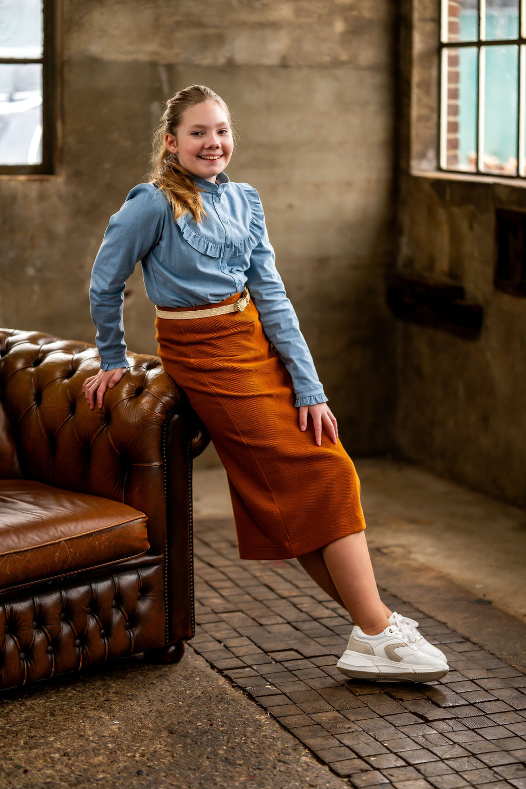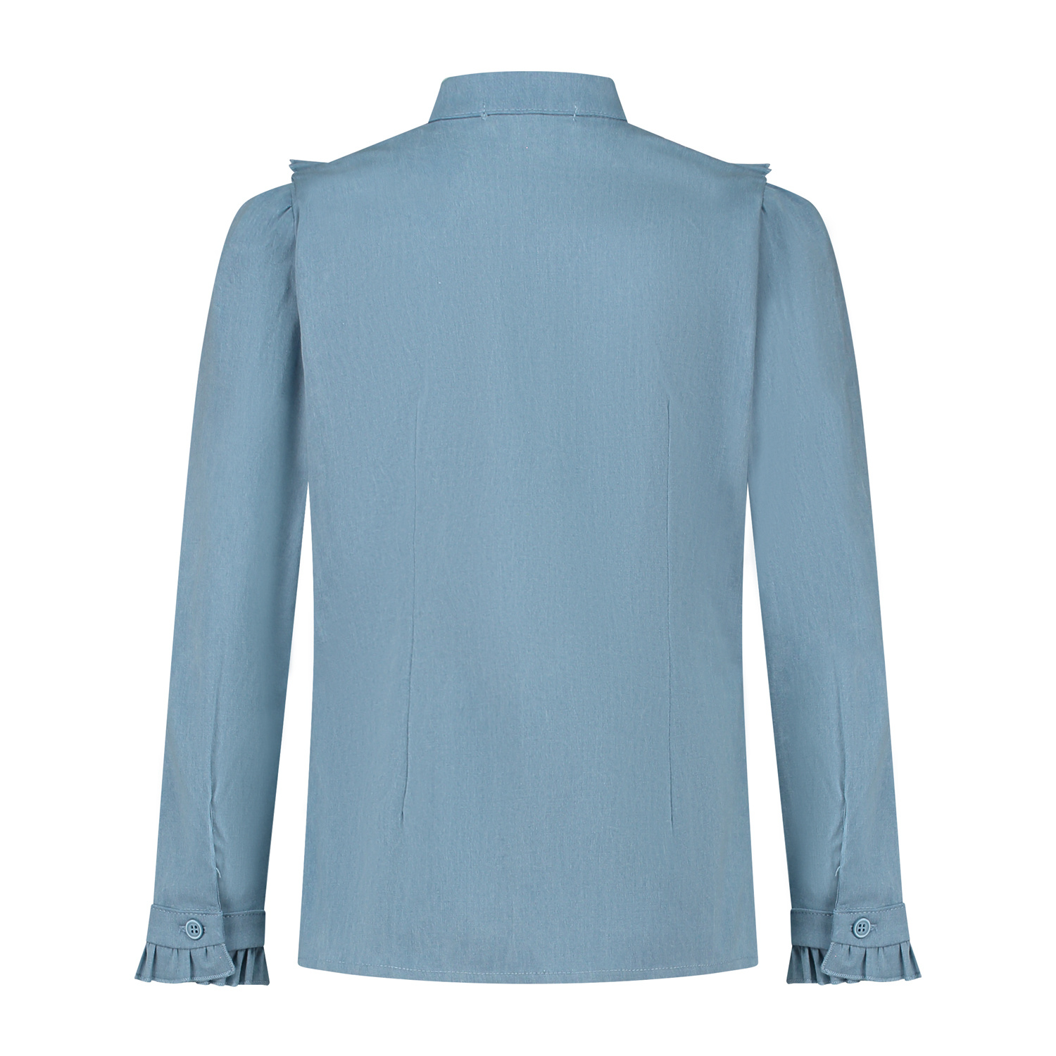Jeansblouse met opstaande boordje en roezelstrook op het voorpand en langs de mouwen. Deze blouse is gemaakt in een katoenen jeans kwaliteitsstof.