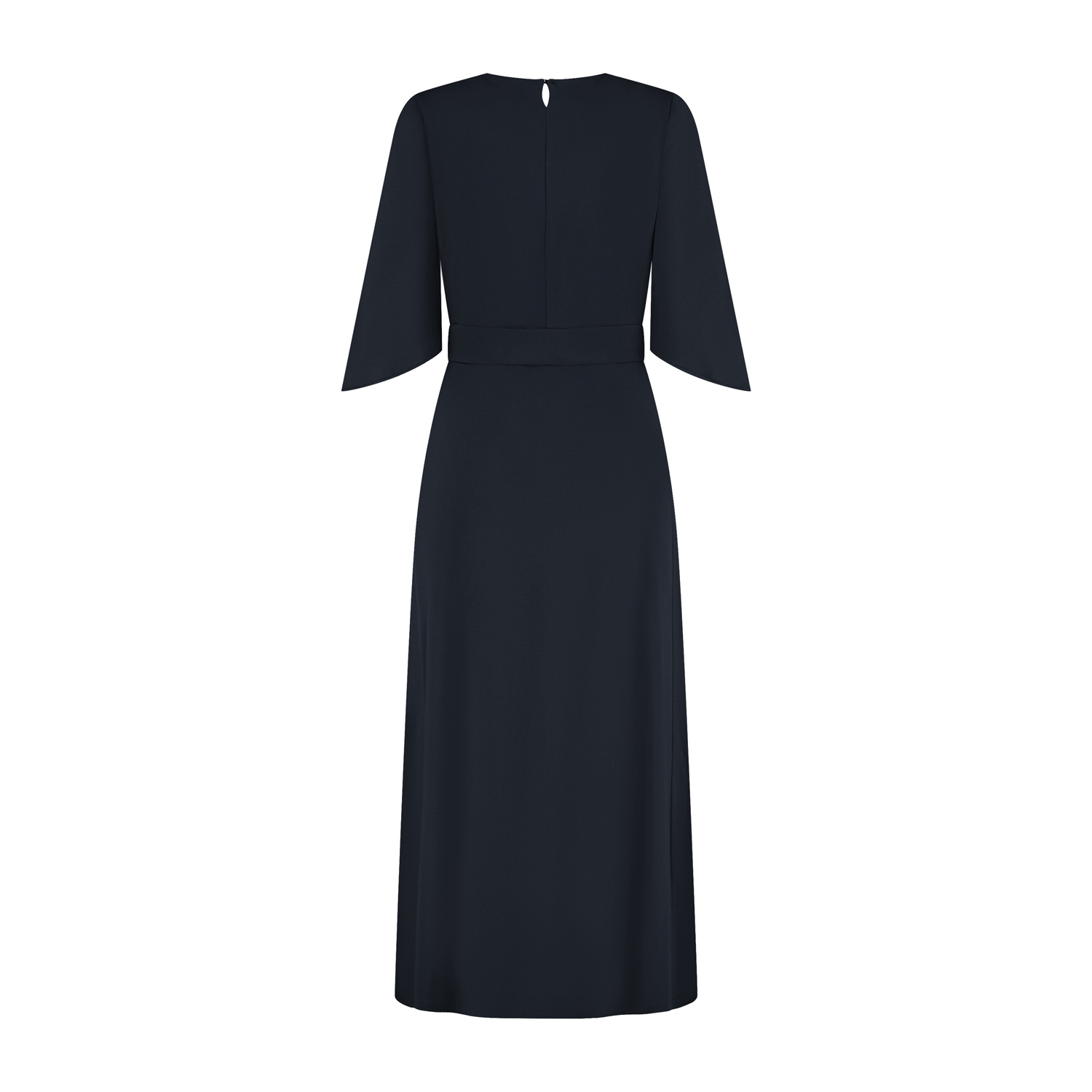 De jurk Alexia in donkerblauw is ontworpen voor vrouwen die houden van een krachtige, ingetogen uitstraling met een vrouwelijke touch. Perfect voor bijzondere gelegenheden, zakelijke events of er gewoon altijd netjes uit willen zien. De jurk heeft een ronde halslijn en verfijnde halflange mouwen met een lichte flair, wat zorgt voor een chique uitstraling. De tailleband met stofknoop accentueert het silhouet op subtiele wijze en geeft de jurk haar karakteristieke, elegante vorm. De lengte tot op de kuit maakt het ontwerp klassiek én eigentijds. Dankzij de minimalistische afwerking en de mooie donkerblauwe kleur is de Alexia jurk veelzijdig te combineren. Deze jurk Alexia sluit middenachter d.m.v. een splitje met blind knoopje en is gemaakt in een mooie luxe tricot kwaliteitsstof.