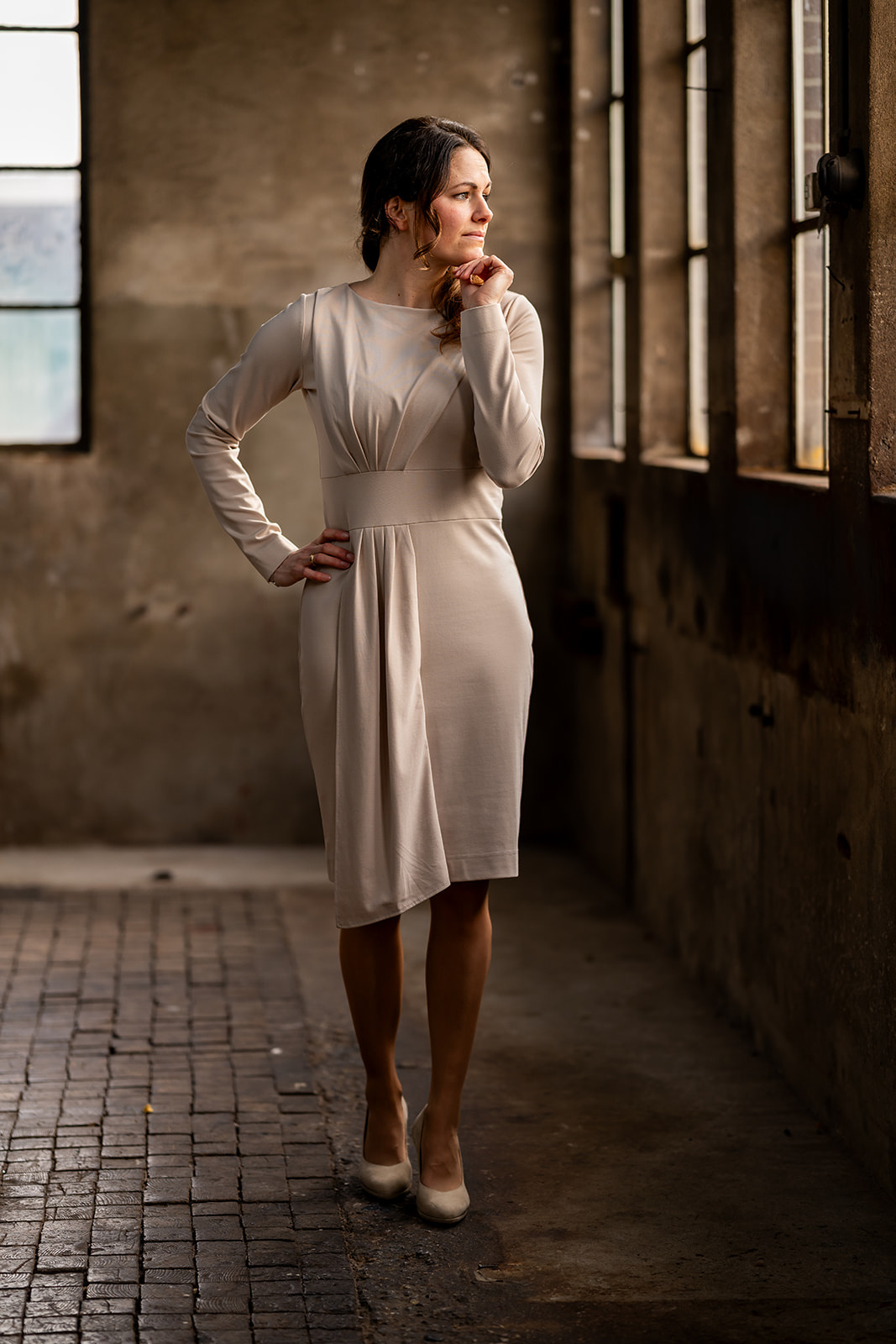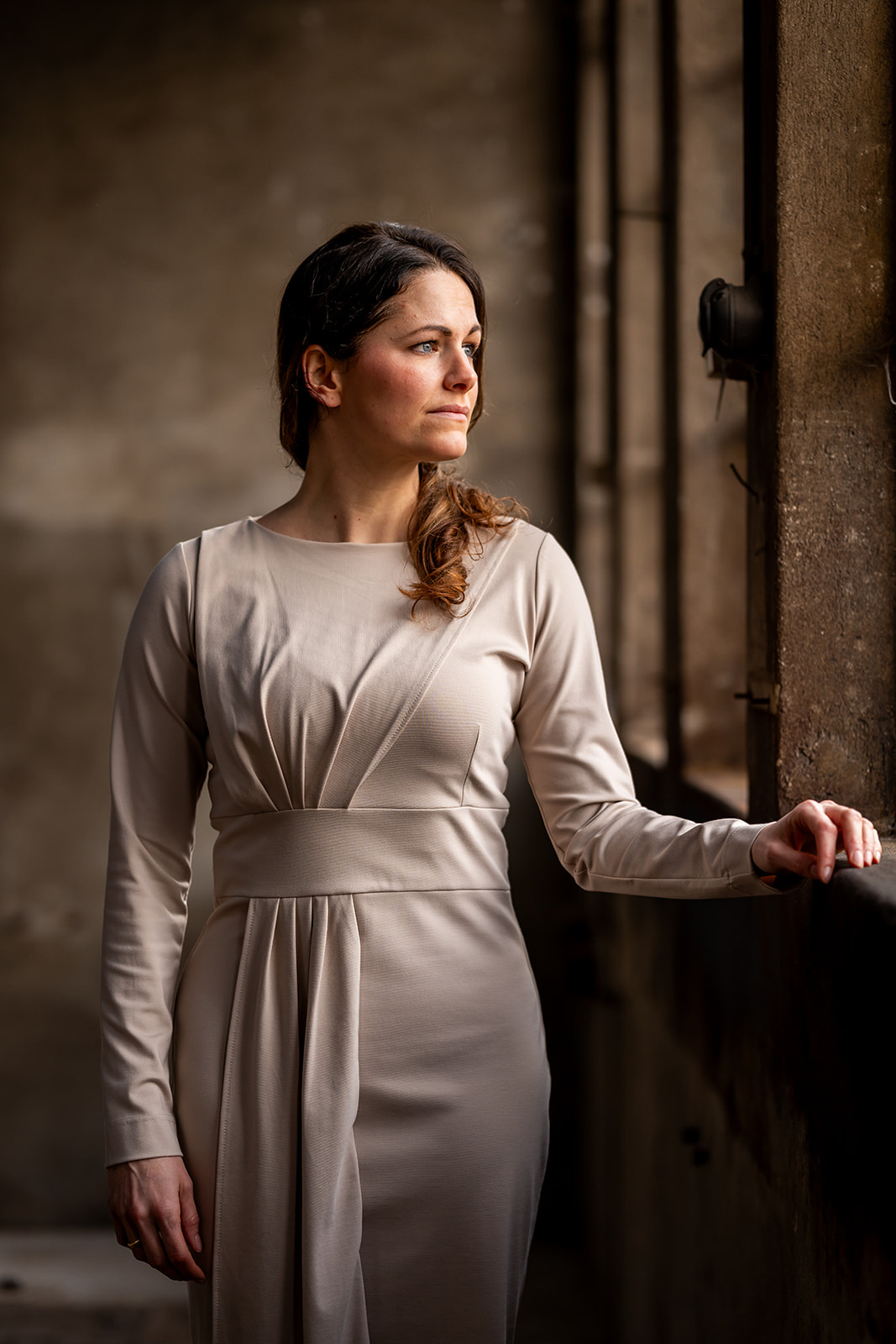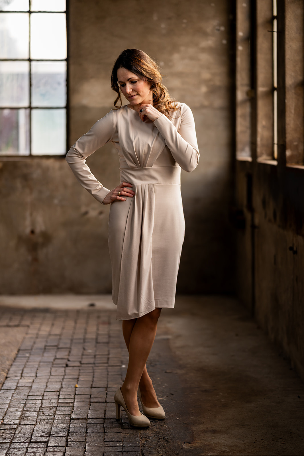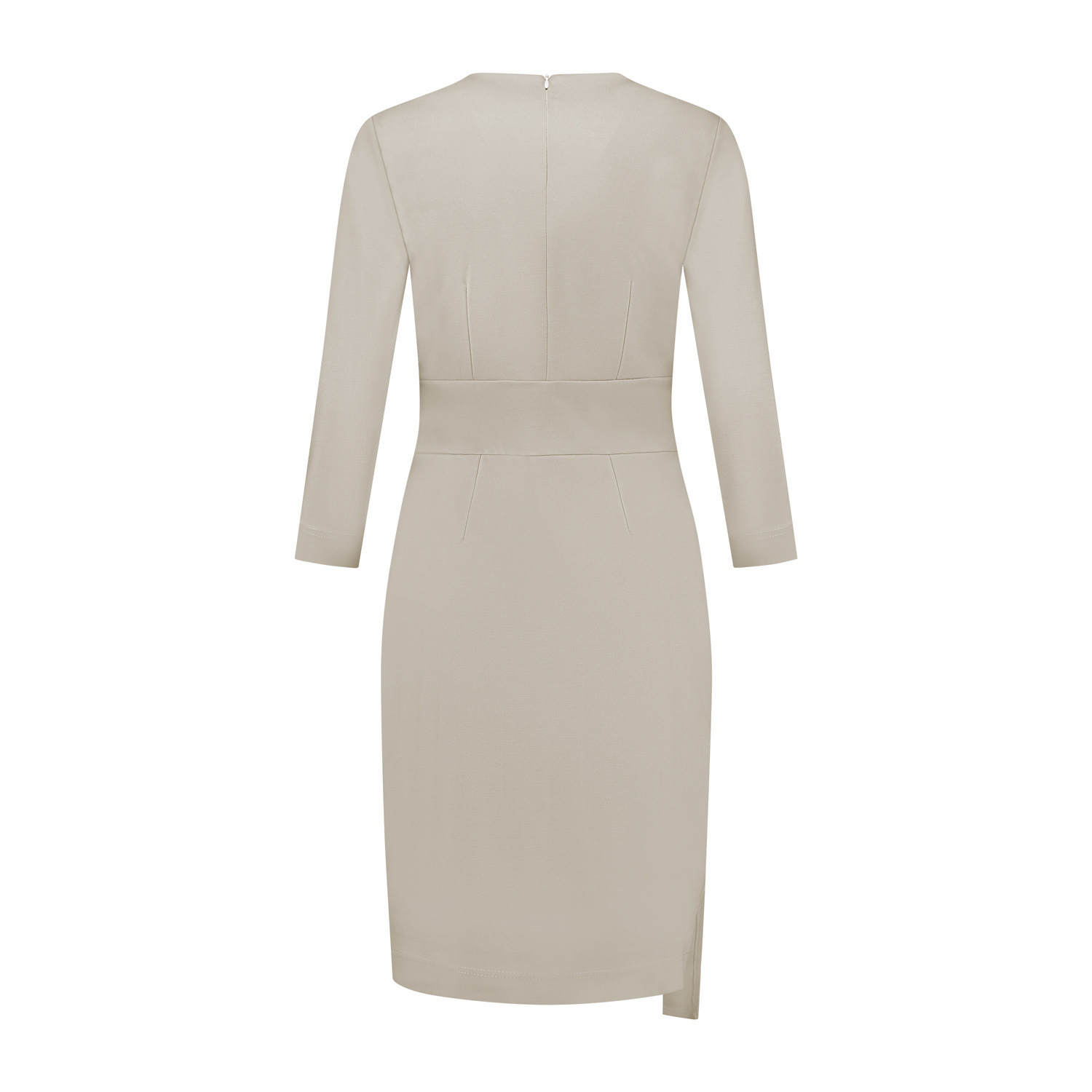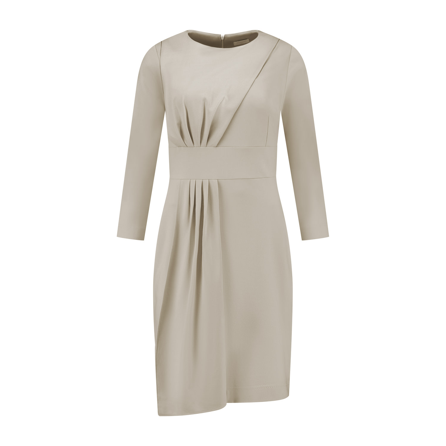 Jurk met een ronde halslijn en lange mouwen. Het bovenpand heeft en overslag en vanuit de brede taillepas een geplooide sjerp over het rokgedeelte. De jurk sluit middenachter d.m.v. een blinde rits en is gemaakt in een mooie luxe tricot kwaliteitsstof.