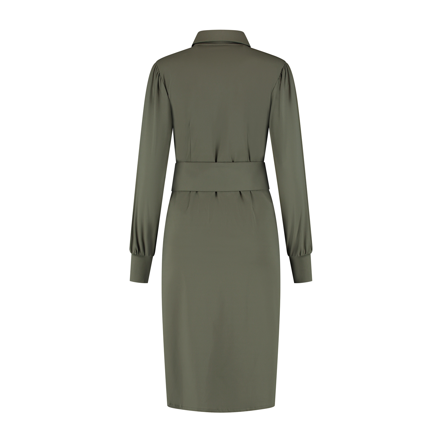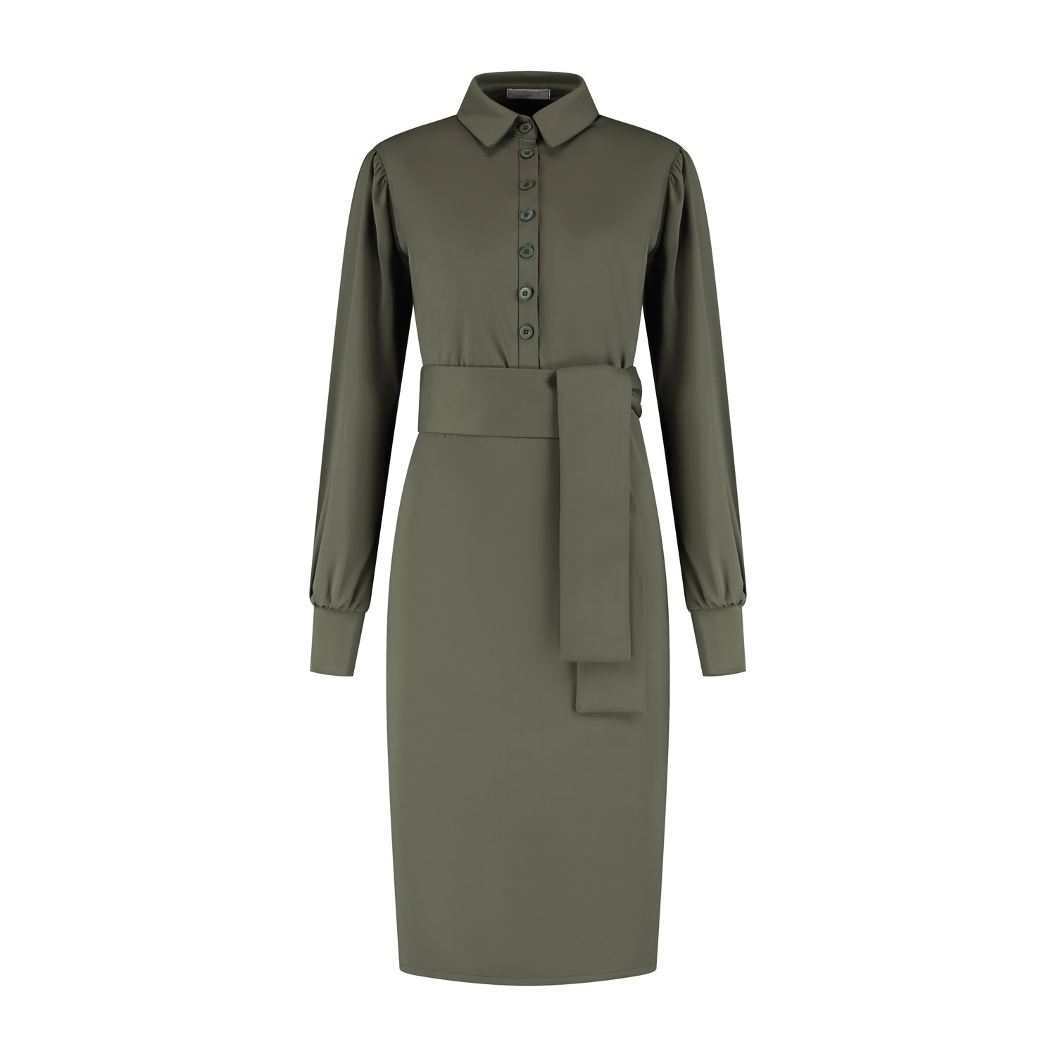 Jurk met staander en blousekraag en lange wijde mouw met brede aansluitende manchet. De jurk is licht 'oversized' van model. De jurk heeft in het bovenpand een knopenlijst en een strikceintuur om de t...