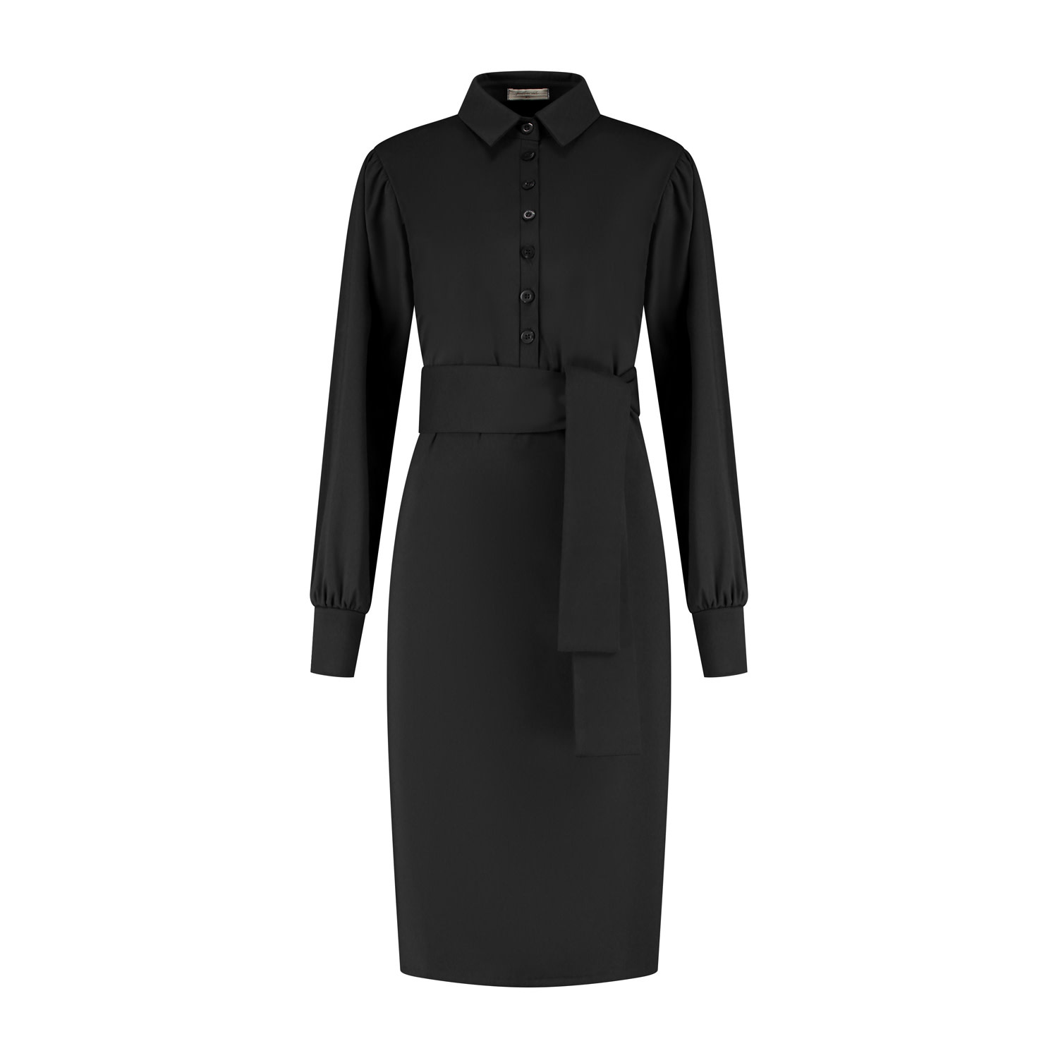 Jurk met staander en blousekraag en lange wijde mouw met brede aansluitende manchet. De jurk is licht 'oversized' van model. De jurk heeft in het bovenpand een knopenlijst en een strikceintuur om de taille. Het rokgedeelte is recht van model. Deze jurk is gemaakt in een mooie stevige travel kwaliteitsstof.