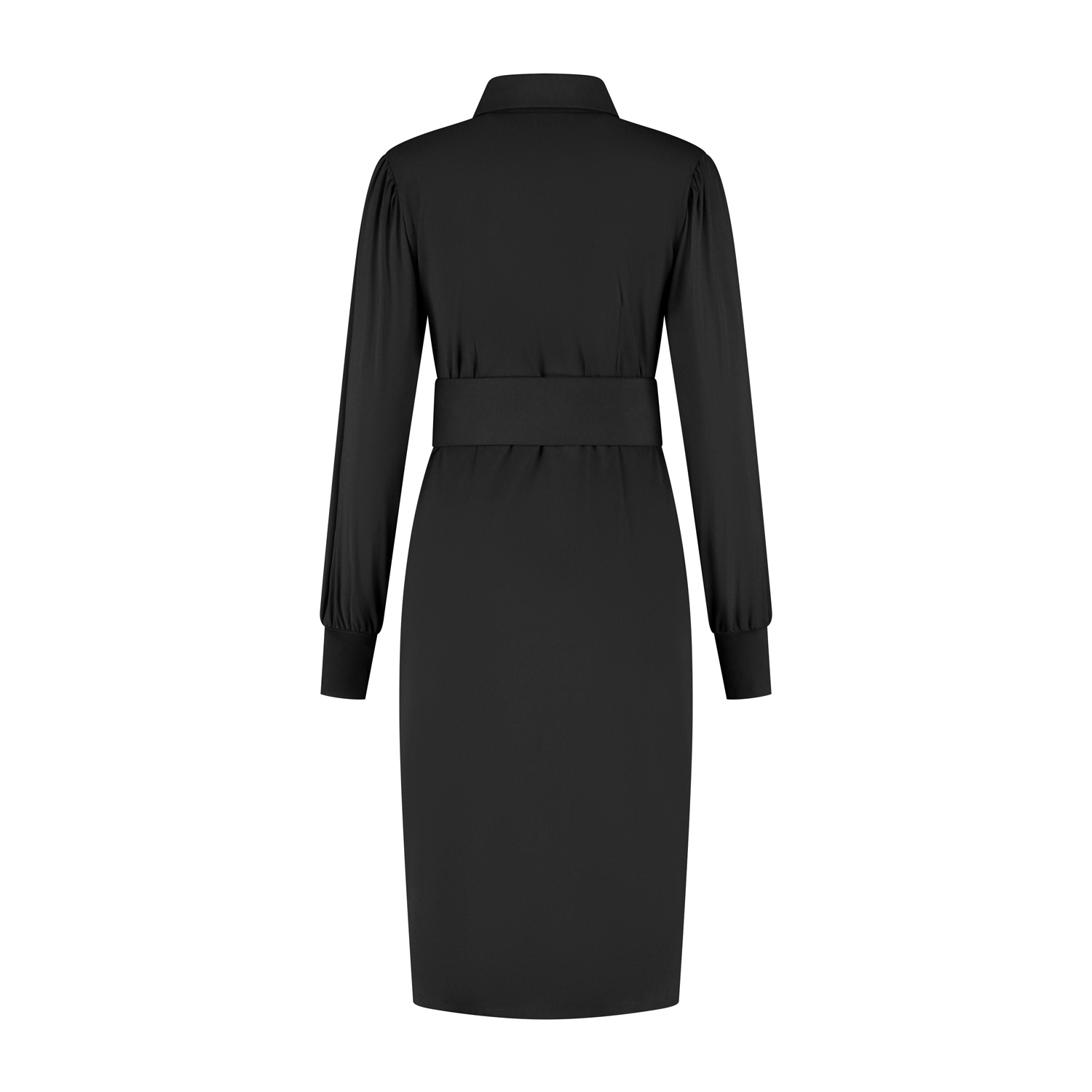 Jurk met staander en blousekraag en lange wijde mouw met brede aansluitende manchet. De jurk is licht 'oversized' van model. De jurk heeft in het bovenpand een knopenlijst en een strikceintuur om de t...