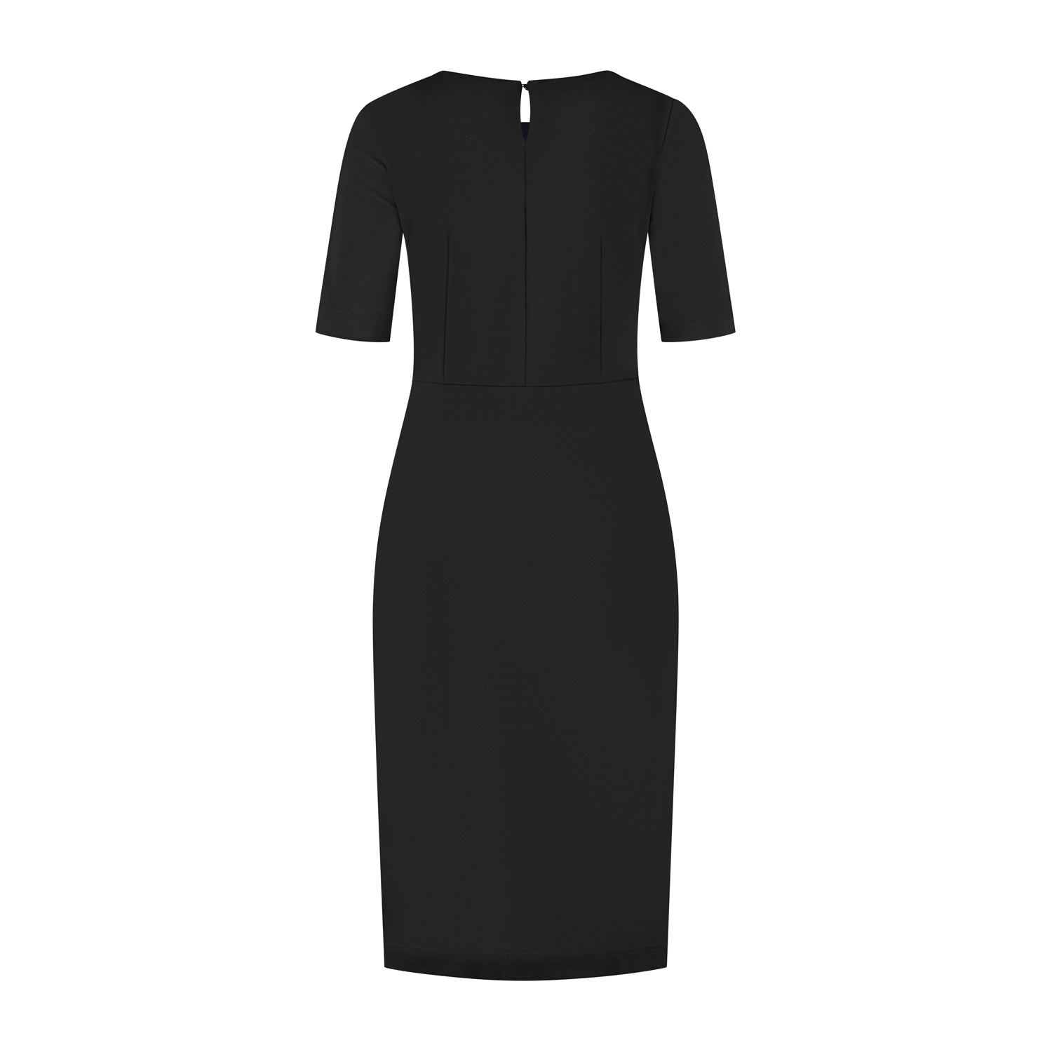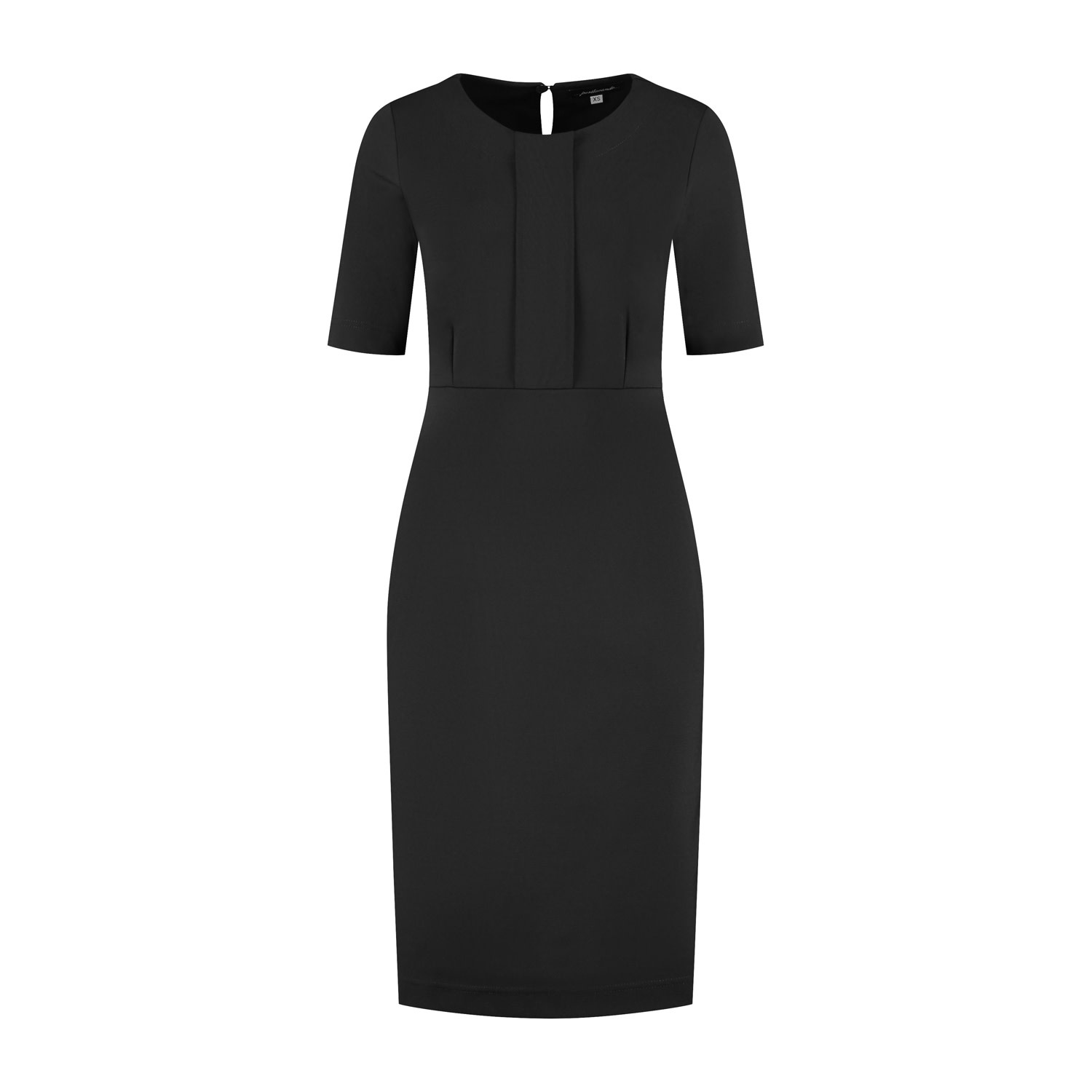 Jurk Anneke met een korte mouw en een fake pasje op de voorkant is een echte essential voor elke garderobe. De jurk heeft een mooie ronde halslijn en sluit middenachter d.m.v. een knoopje/lusje. De ju...