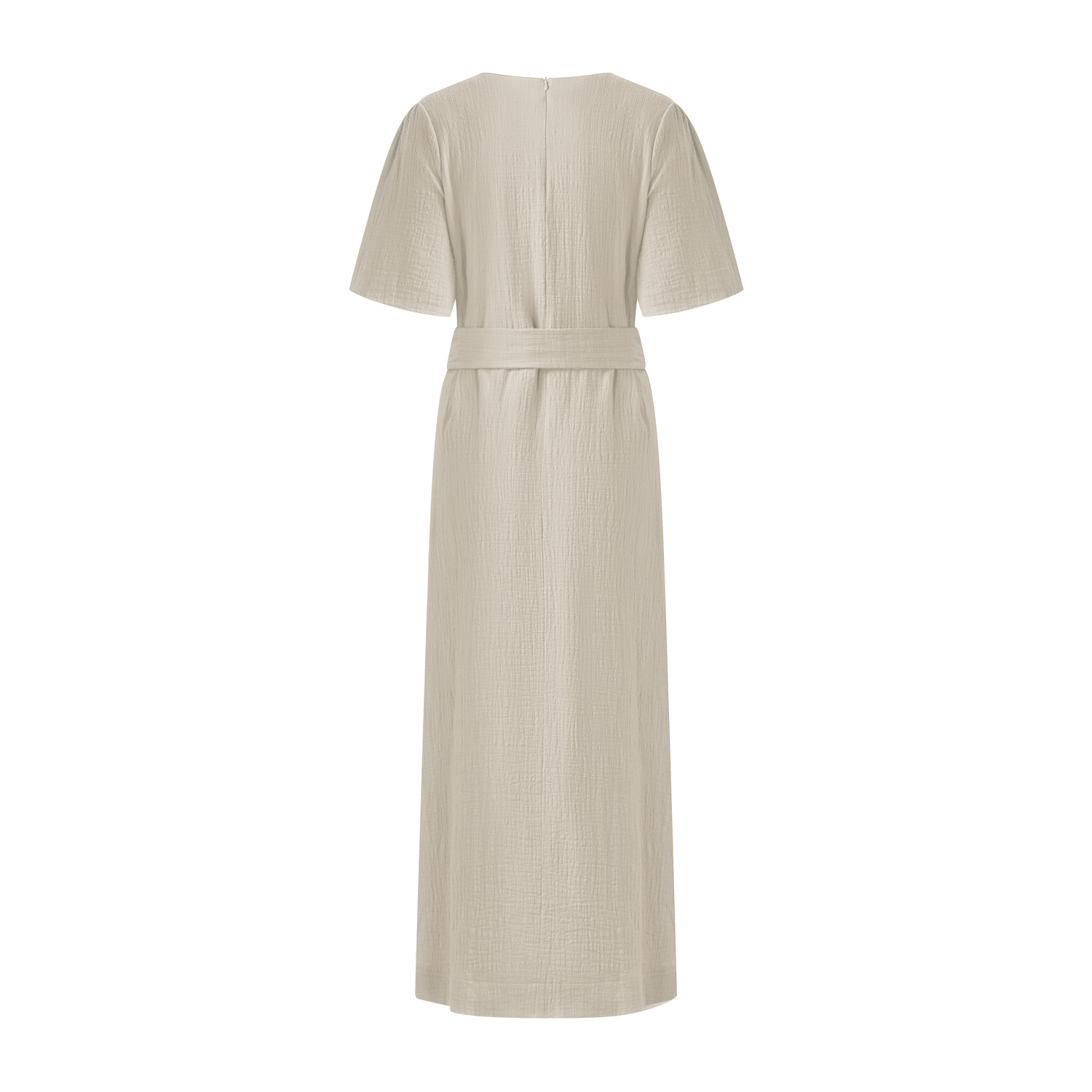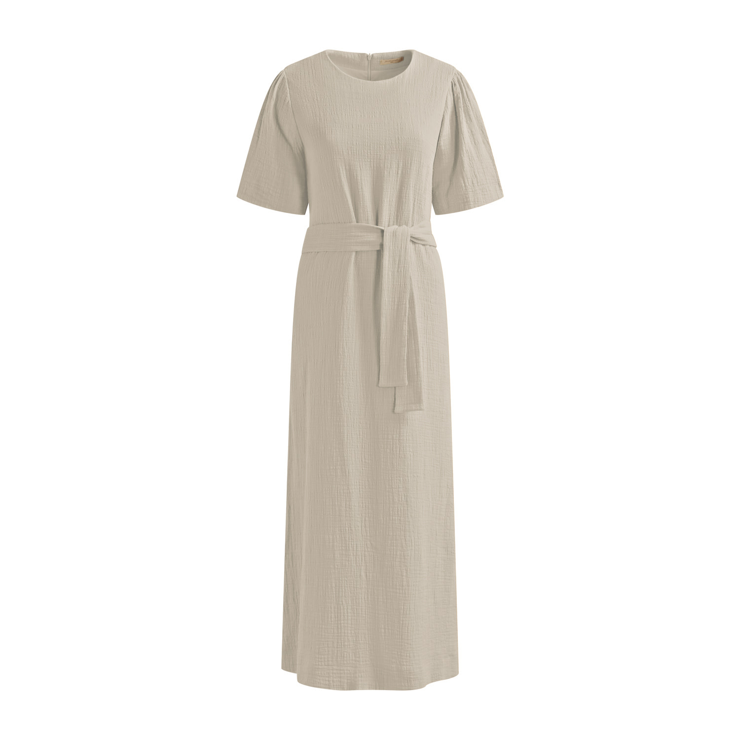 Jurk met ronde halsijn en korte ballonmouw. De jurk is licht 'oversized' van model en heeft een strikceintuur om de taille. De jurk is zoorzien van een voeringstof en sluit middenachter d.m.v. een blinde rits. Deze jurk is gemaakt in een luchtige katoenen kwaliteitsstof met een soort bubbeltjes relief.