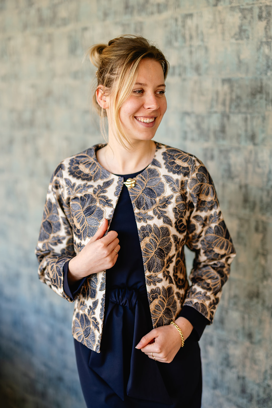 Jurk Doortje straalt rust en eenvoud uit. De donkerblauwe kleur, rechte belijning en de mooie rondehalslijn geven de jurk een exclusief en verfijnde uitstraling. De jurk heeft een strikceintuur om de ...