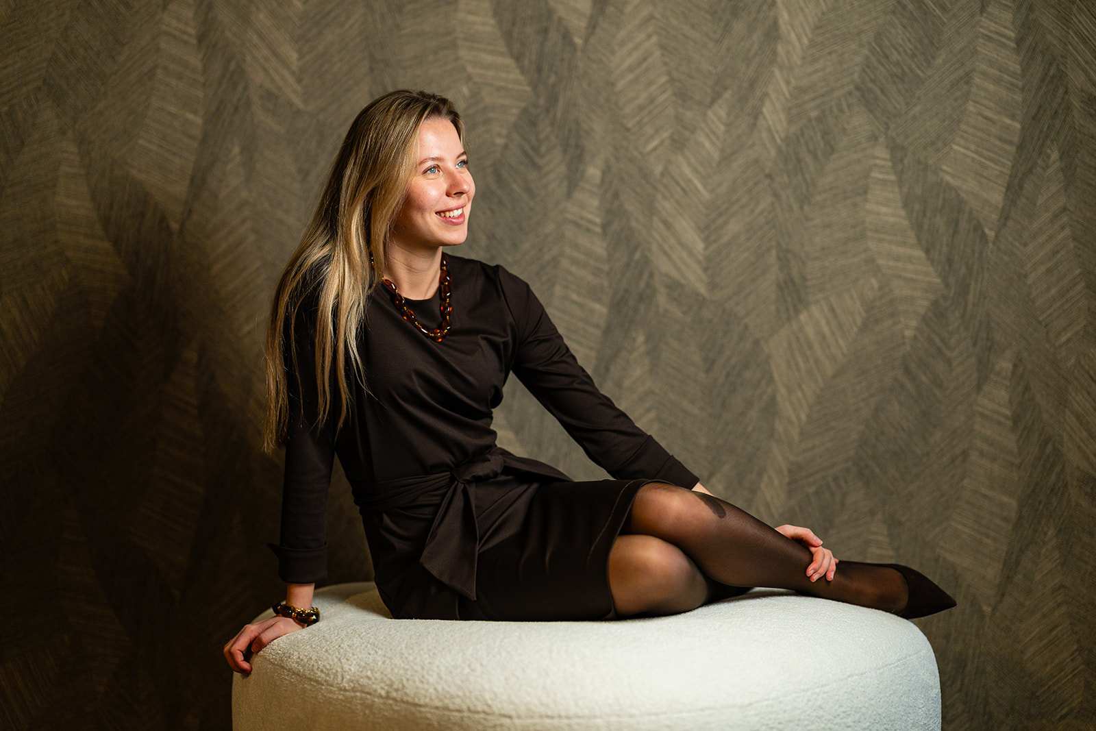 Jurk Doortje straalt rust en eenvoud uit. De donkerbruine kleur, rechte belijning en de mooie rondehalslijn geven de jurk een exclusief en verfijnde uitstraling. De jurk heeft een strikceintuur om de ...