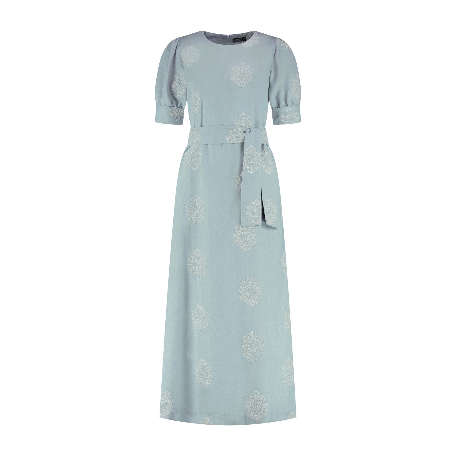 Jurk Elga is een elegante lange damesjurk in ijsblauw met een verfijnde offwhite ingeweven motief. De jurk heeft korte pofmouwen met een brede bies, een ronde halslijn en een bijpassende strikceintuur...