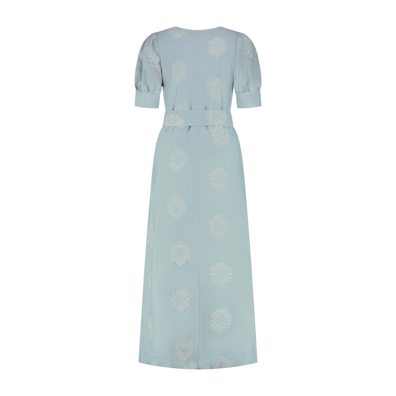 Jurk Elga is een elegante lange damesjurk in ijsblauw met een verfijnde offwhite ingeweven motief. De jurk heeft korte pofmouwen met een brede bies, een ronde halslijn en een bijpassende strikceintuur om de taille. De jurk is gemaakt in een mooie geweven kwaliteitsstof en voorzien van een voeringstof en sluit middenachter d.m.v. een blinde rits. Dankzij de ideale pasvorm en zachte kleur is deze jurk geschikt voor zowel casual als speciale gelegenheden. Kortom een stijlvolle keuze voor het voorjaar- en zomerseizoen.
