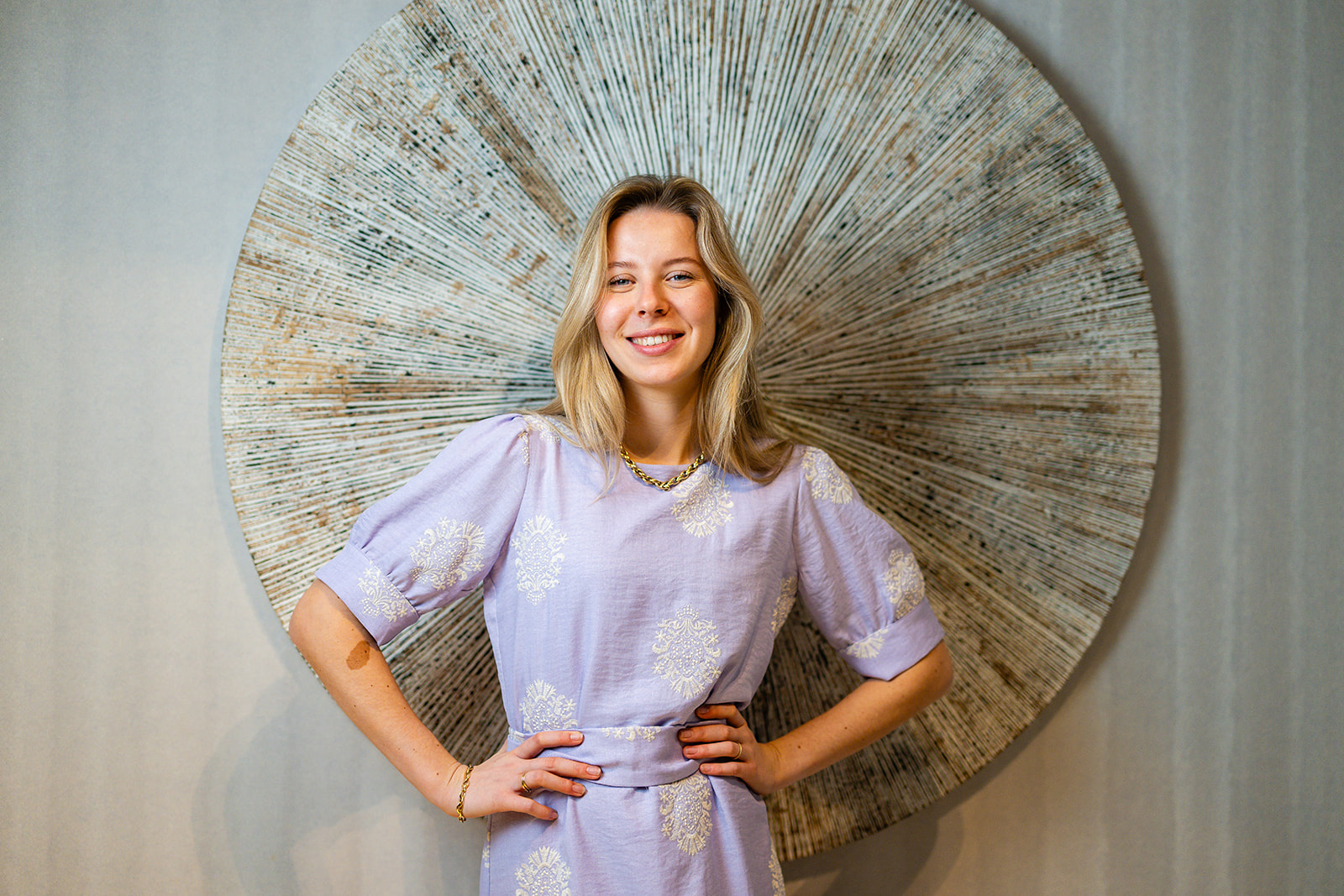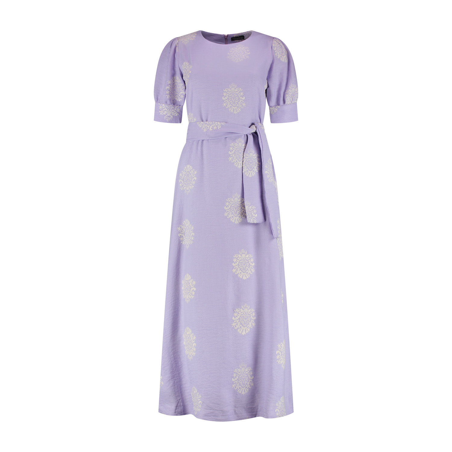 Jurk Elga is een elegante lange damesjurk in een mooie lila tint met een verfijnde offwhite ingeweven motief. De jurk heeft korte pofmouwen met een brede bies, een ronde halslijn en een bijpassende strikceintuur om de taille. De jurk is gemaakt in een mooie geweven kwaliteitsstof en voorzien van een voeringstof en sluit middenachter d.m.v. een blinde rits. Dankzij de ideale pasvorm en zachte kleur is deze jurk geschikt voor zowel casual als speciale gelegenheden. Kortom een stijlvolle keuze voor het voorjaar- en zomerseizoen.