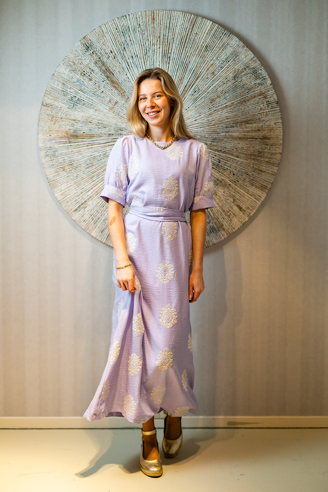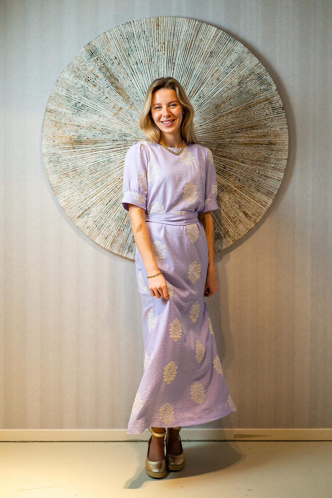 Jurk Elga is een elegante lange damesjurk in een mooie lila tint met een verfijnde offwhite ingeweven motief. De jurk heeft korte pofmouwen met een brede bies, een ronde halslijn en een bijpassende st...