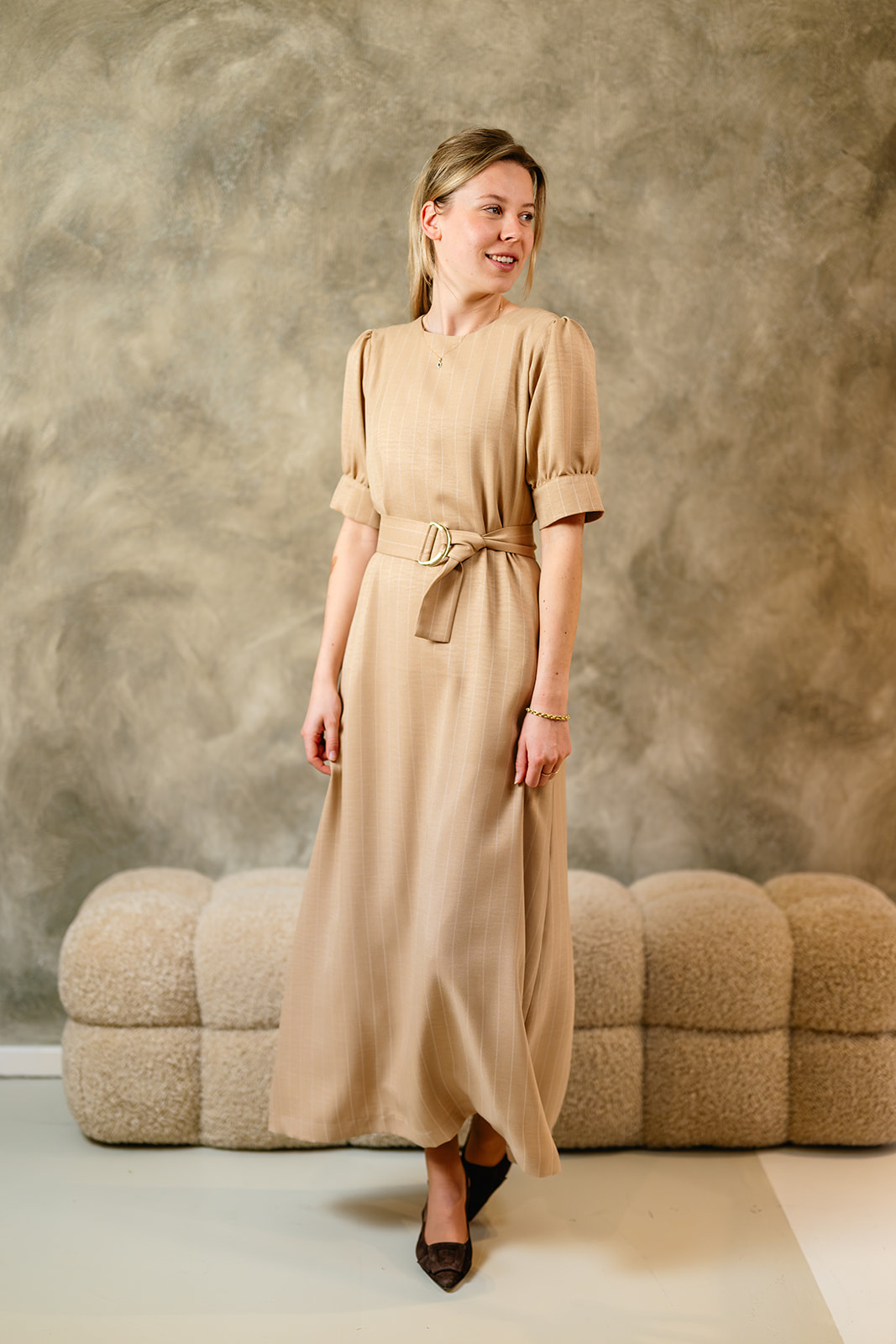 Jurk Erika van Port Lavande is een stijlvolle maxi jurk met een vrouwelijke, chique uitstraling. Perfect voor dagen waarop je moeiteloos stijlvol voor de dag wilt komen. De zachte krijtstreep geeft een verfijnd en licht verlengend effect, terwijl de licht gepofte mouwen met brede manchet zorgen voor een moderne, elegante touch. De taille wordt geaccentueerd met een bijpassende ceintuur met gesp-ringen, waarmee je eenvoudig jouw silhouet benadrukt. Dankzij de soepel vallende stof beweegt de jurk prachtig met je mee. Deze jurk is voorzien van een voeringstof en heeft middenachter een blinde ritssluiting en is gemaakt van een zachte geweven kwaliteitsstof. Kortom, jurk Erika is een veelzijdige toevoeging aan je garderobe.Kleurzand/offwhiteMateriaal100% polyamideMerkPort LavandeWasadviesfijnwasprogramma max. 30°C - hangend drogenMaatadvieszie onderstaande tabel, afmetingen zijn een indicatieMaatBorstwijdteTaille riemAchterlengteMouwlengteXS1007214032S1057614032M1108014032L1158514032XL1209014032XXL1259514032