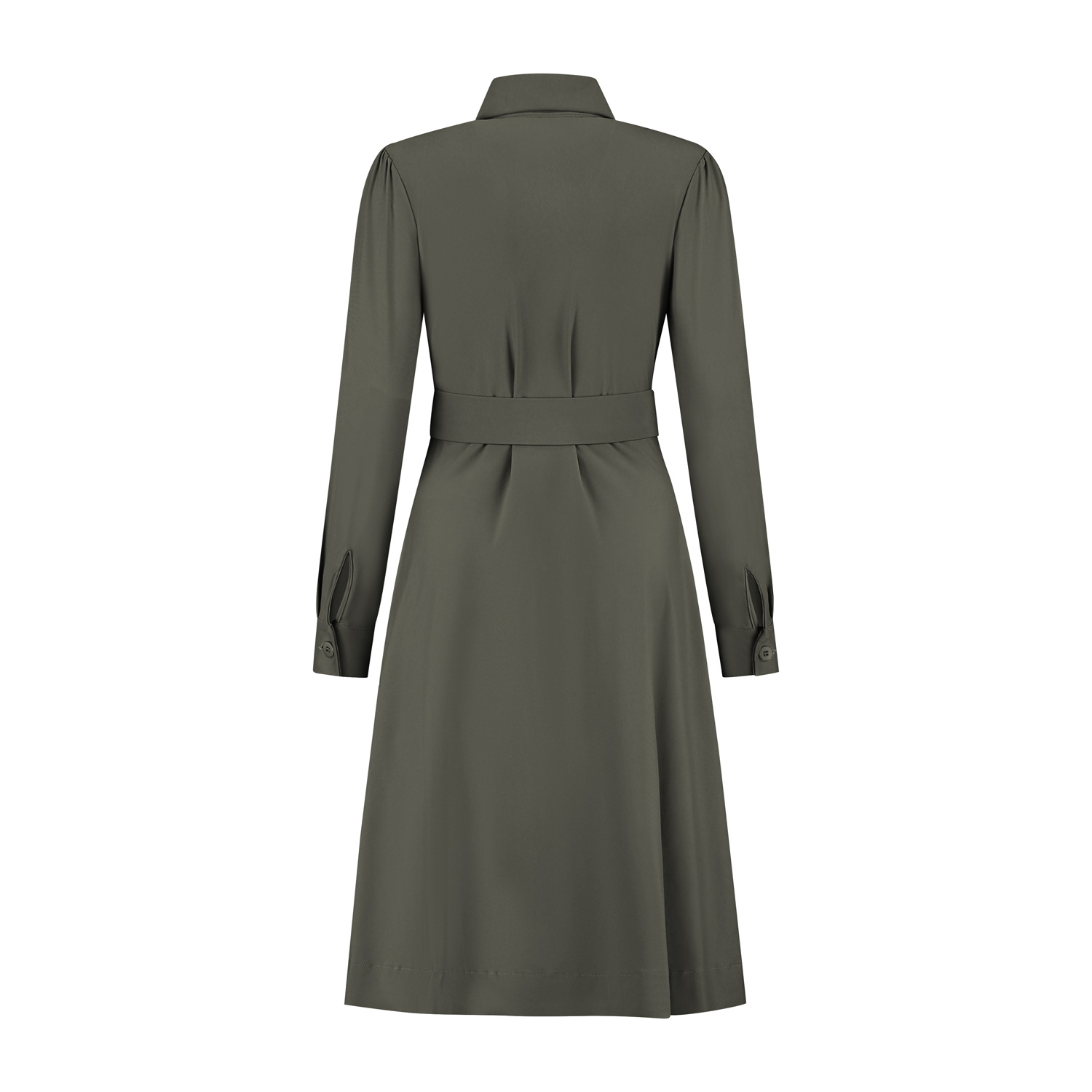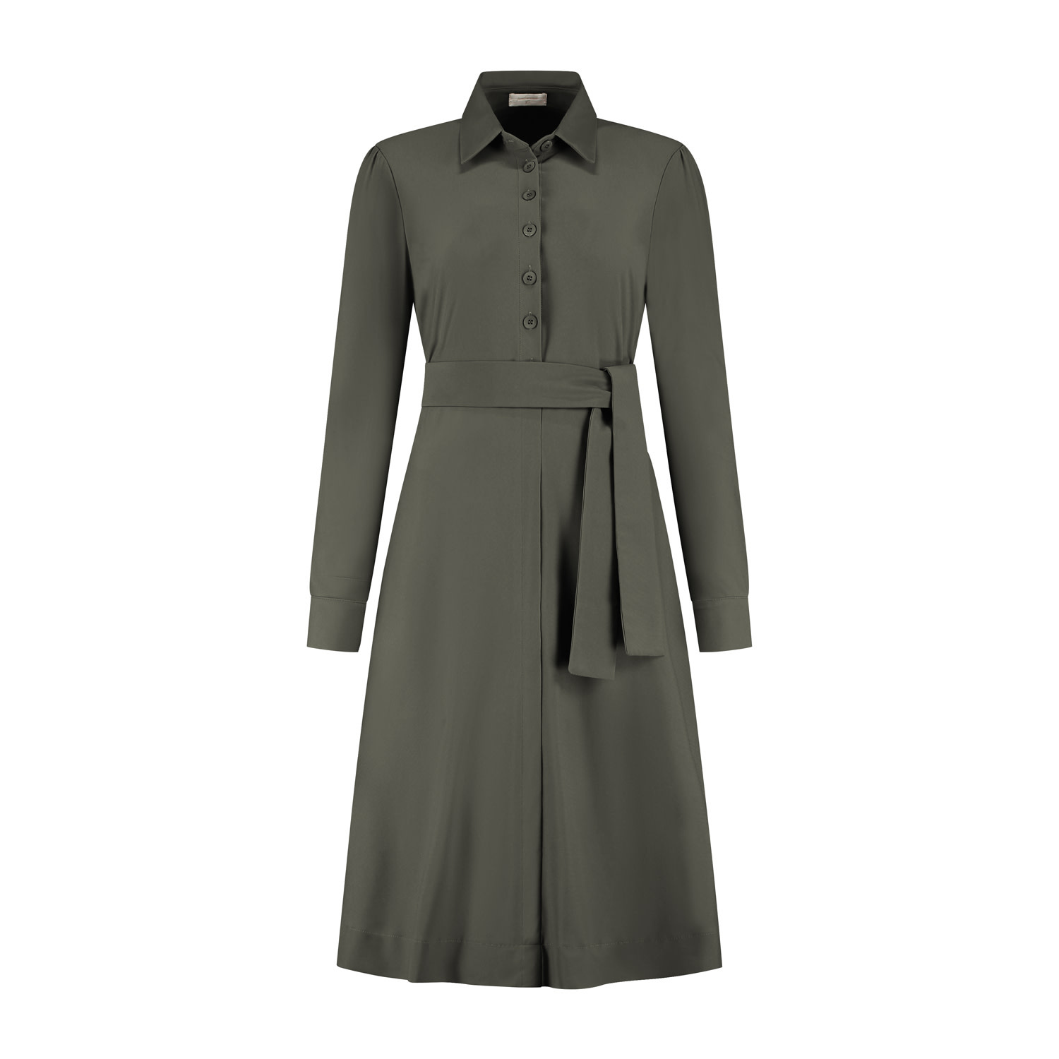 Jurk met blousekraag en lange mouw met manchet. Het bovenpand heeft een knopenlijst en deze lijst loopt fake door in het rokgedeelte. De jurk heeft een brede strikceintuur om de taille en het rokgedeelte is klokkend van model. Deze jurk is gemaakt in een mooie travel kwaliteitsstof.