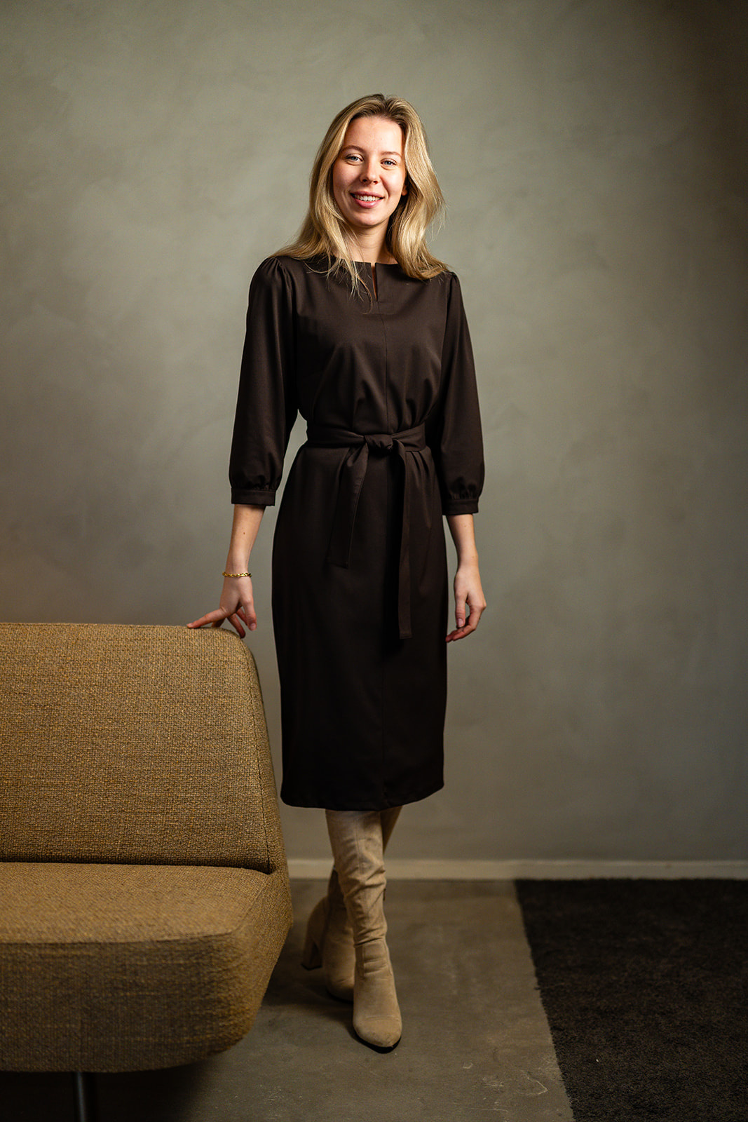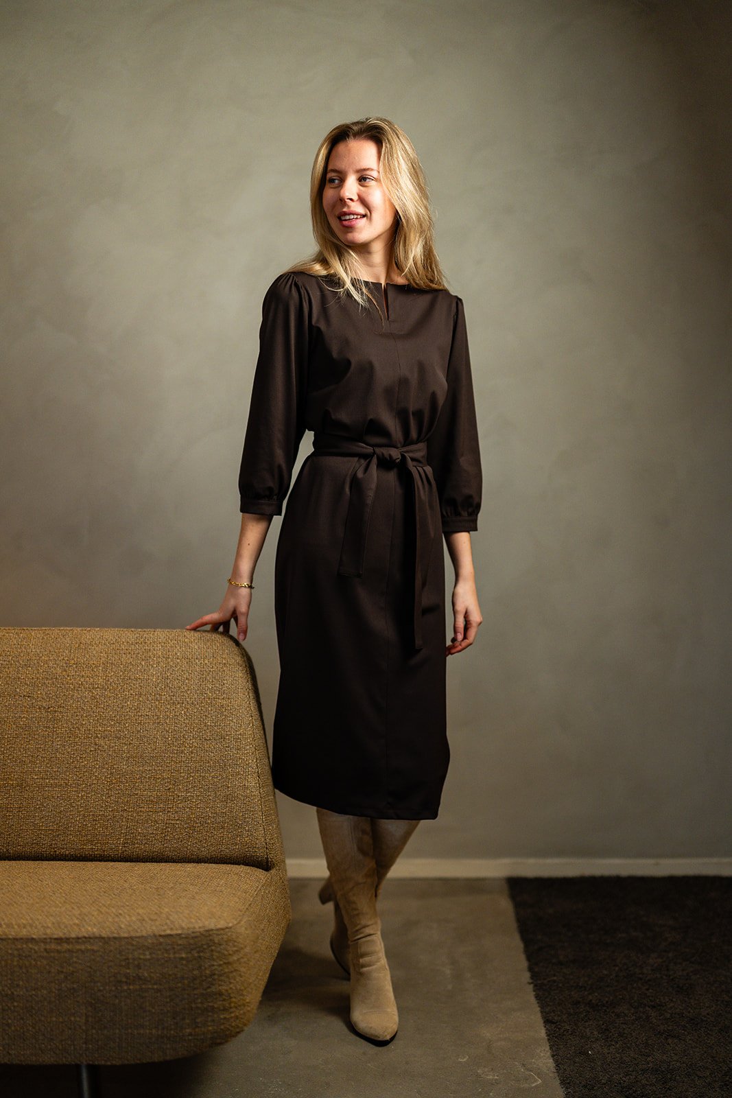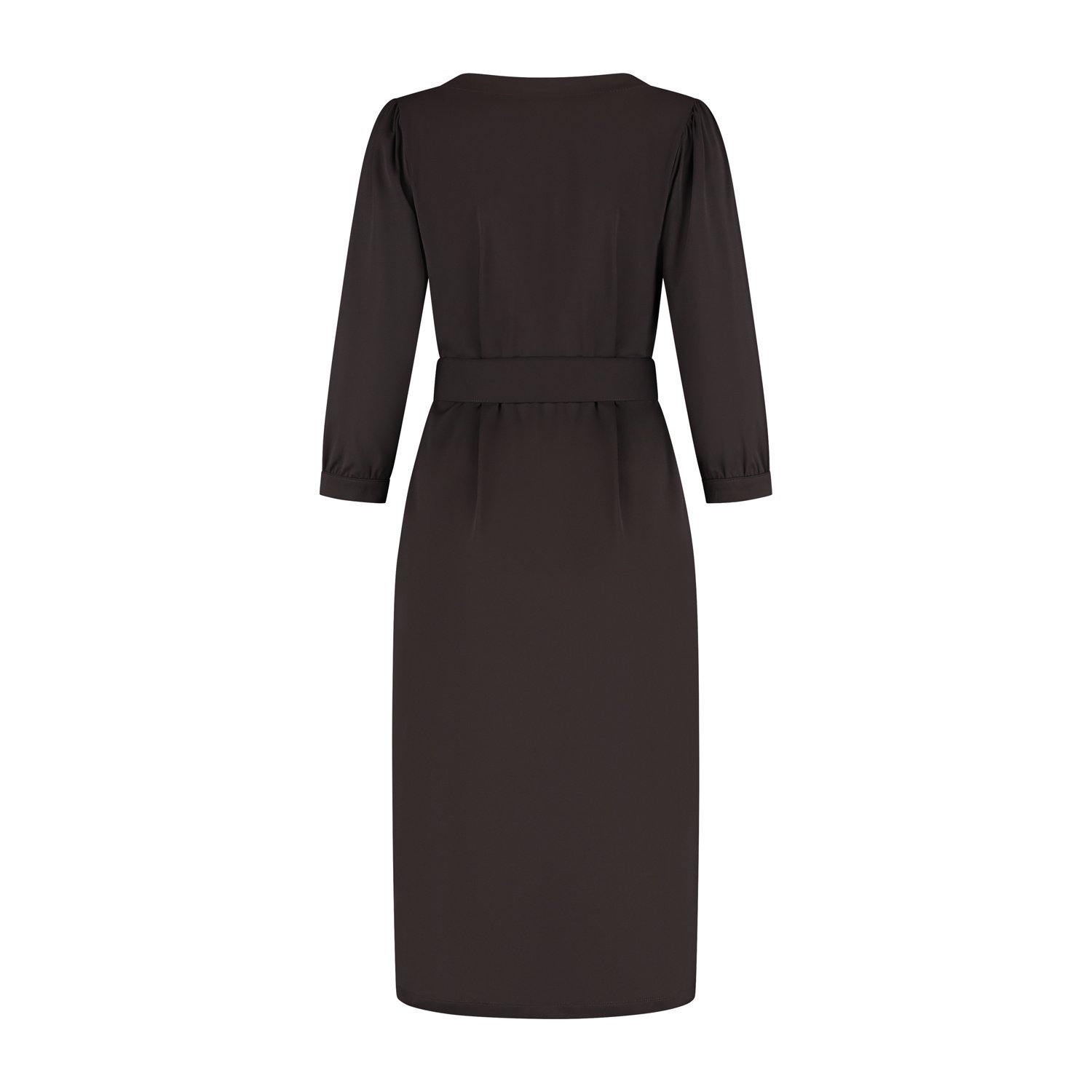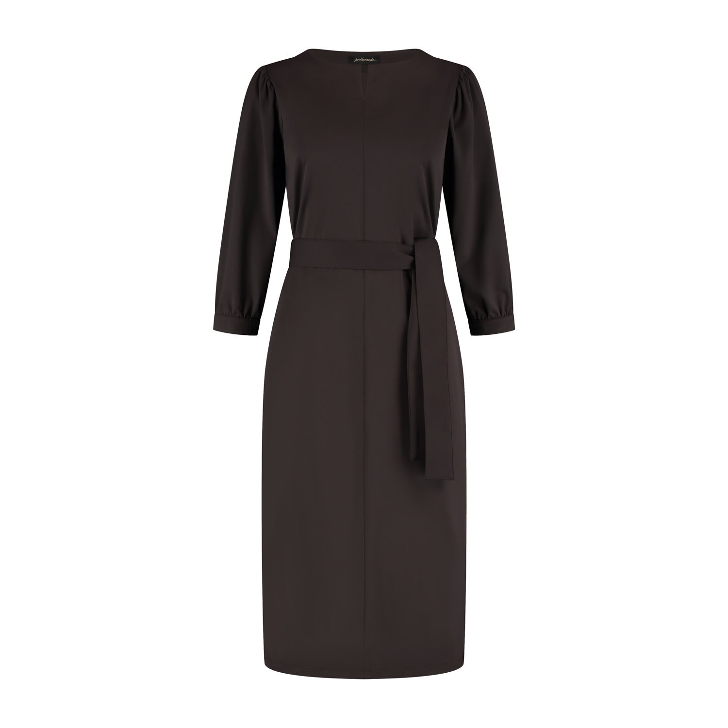 Jurk Fieke is een exclusieve donkerbruine damesjurk met een elegante en vrouwelijke uitstraling. Deze jurk heeft een ronde halslijn met splitje en iets wijdervallende 3/4 mouwen met een smal boordje. Met de brede strikceintuur modelleer je deze jurk perfect in de taille. De donkerbruine kleur geeft de jurk een warme, luxe uitstraling en maakt haar eenvoudig te combineren met zowel lichte als donkere accessoires. Jurk Fieke is ongevoerd en gemaakt in een mooie stevige comfortabele travel kwaliteitsstof.