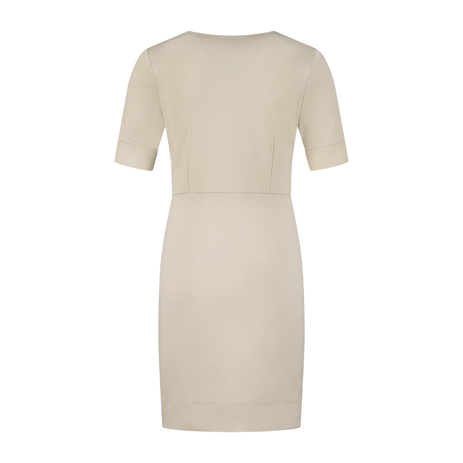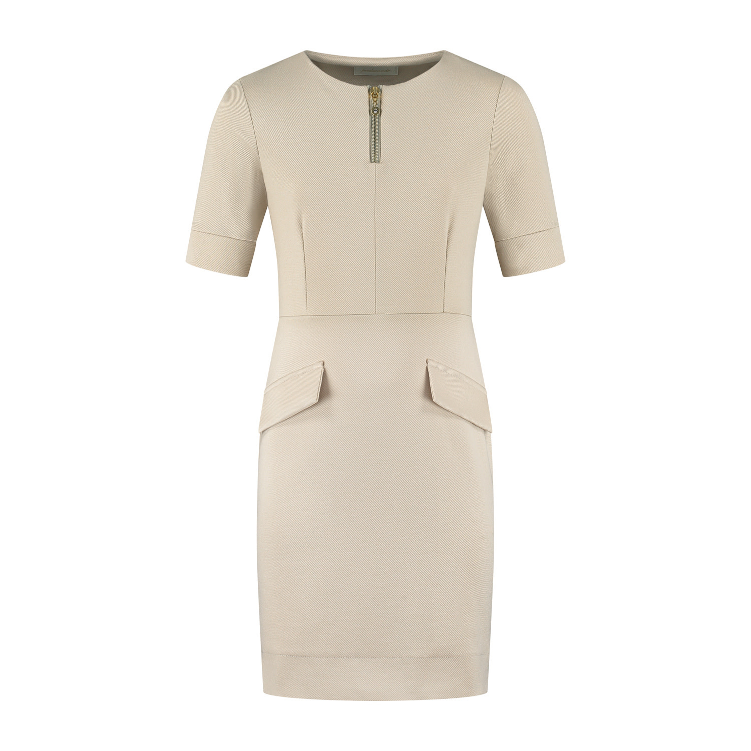 Jurk met ronde kraag en goudkleurig ritsje. De jurk heeft korte mouwen met brede manchetboord. De jurk is licht getailleerd en heeft fake kleppen op het voorpand. Deze jurk is gemaakt in een tricot kwaliteitsstof met een lichte ribstructuur.