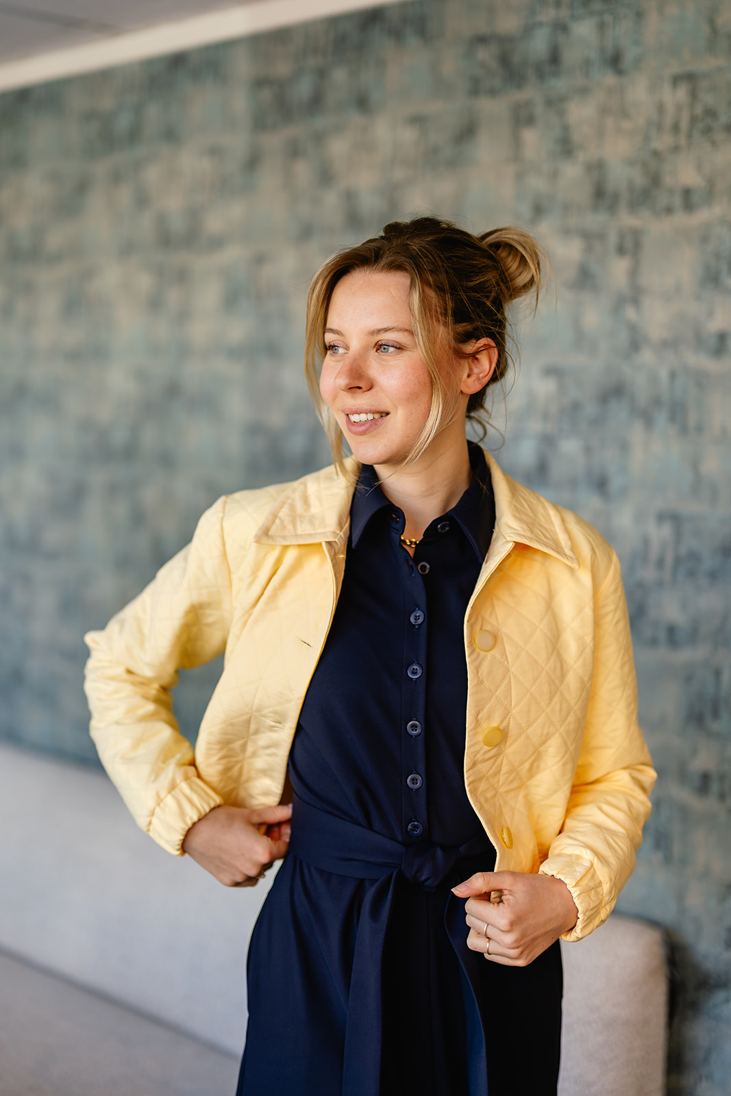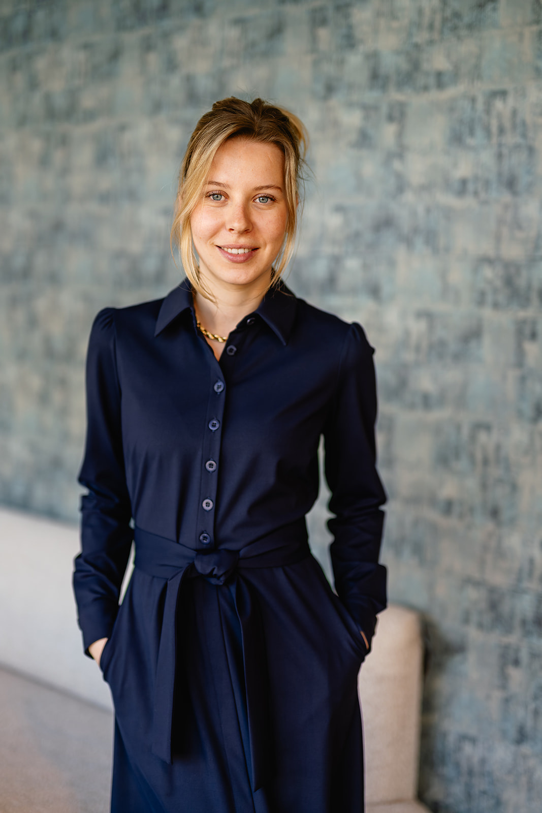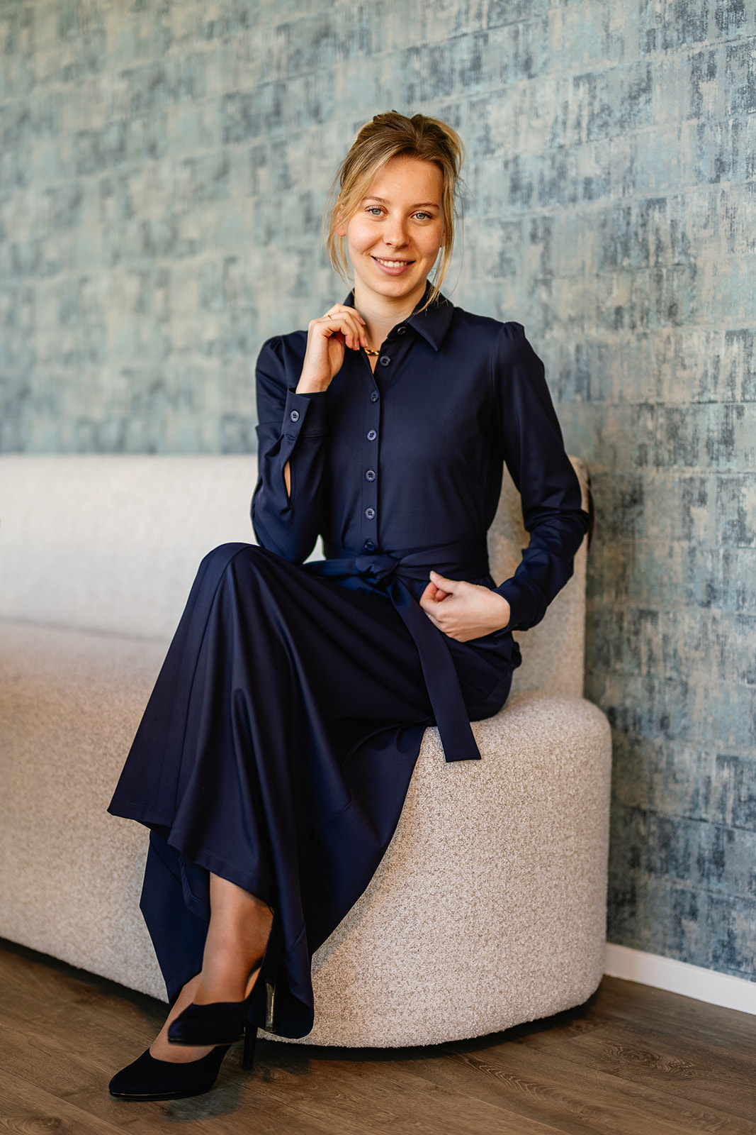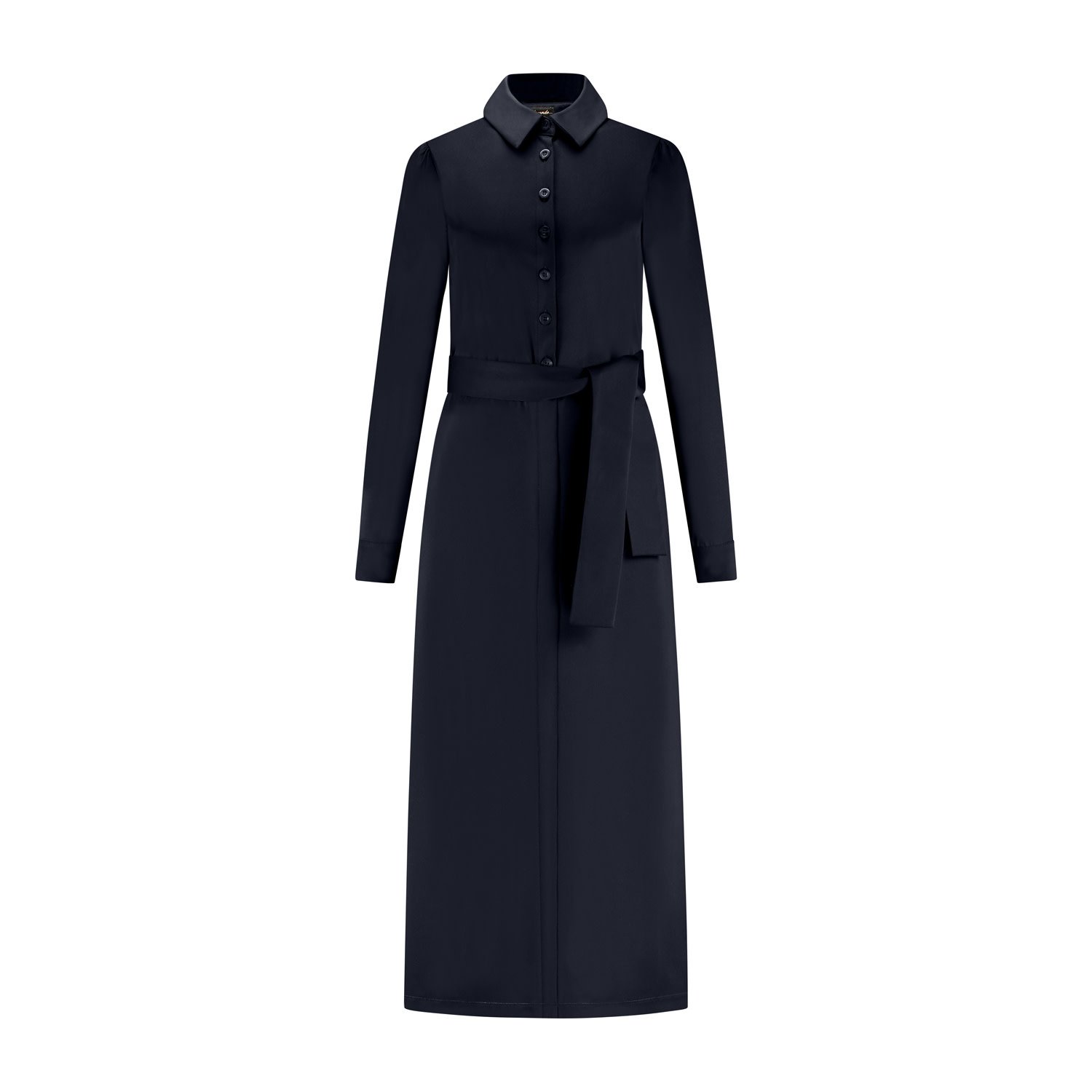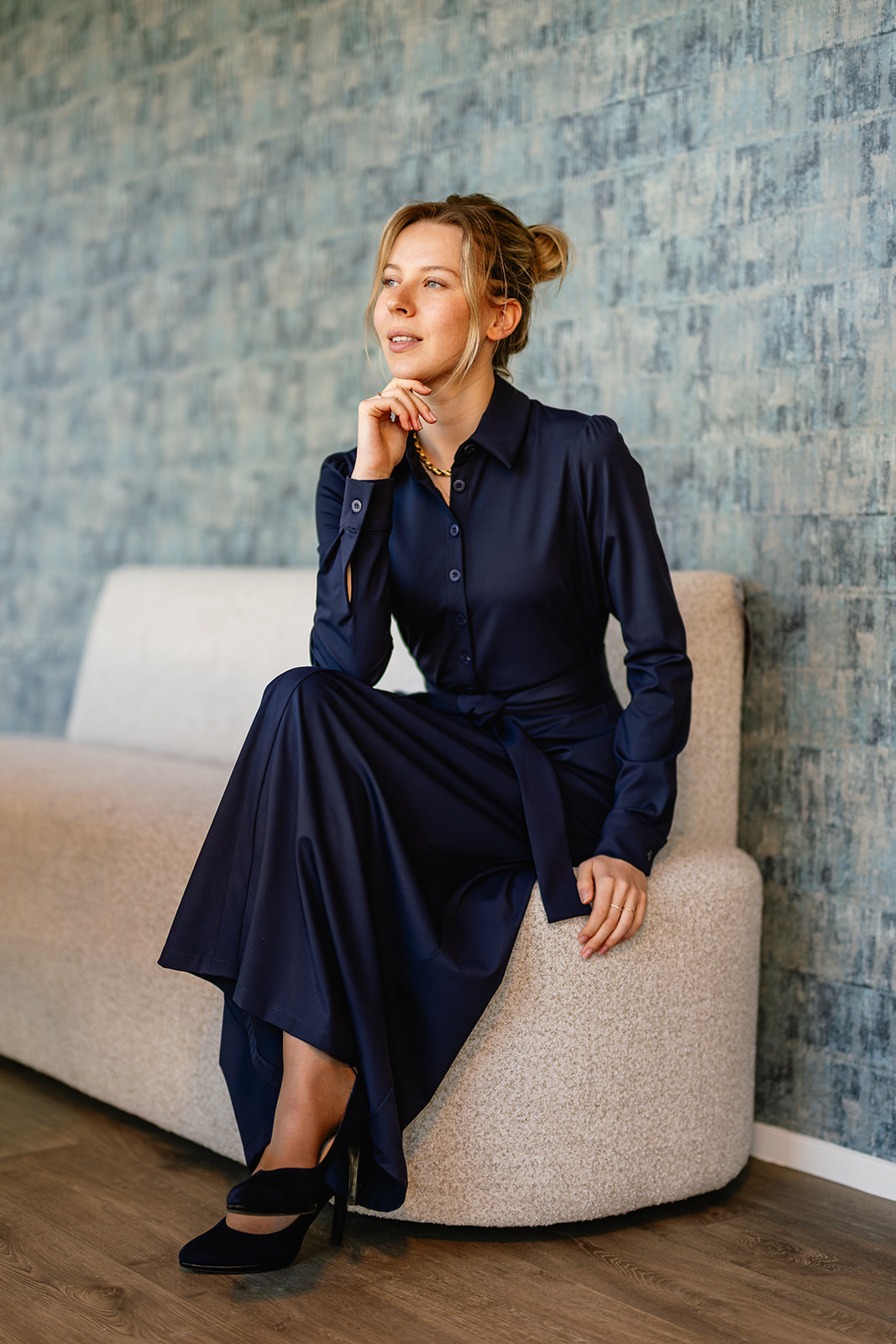 De Jurk Floor in donkerblauw van Port Lavande is een elegante en veelzijdige damesjurk met een exclusieve uitstraling. De klassieke kraag, lange mouwen en gedeeltelijk en fake knoopsluiting geven de j...