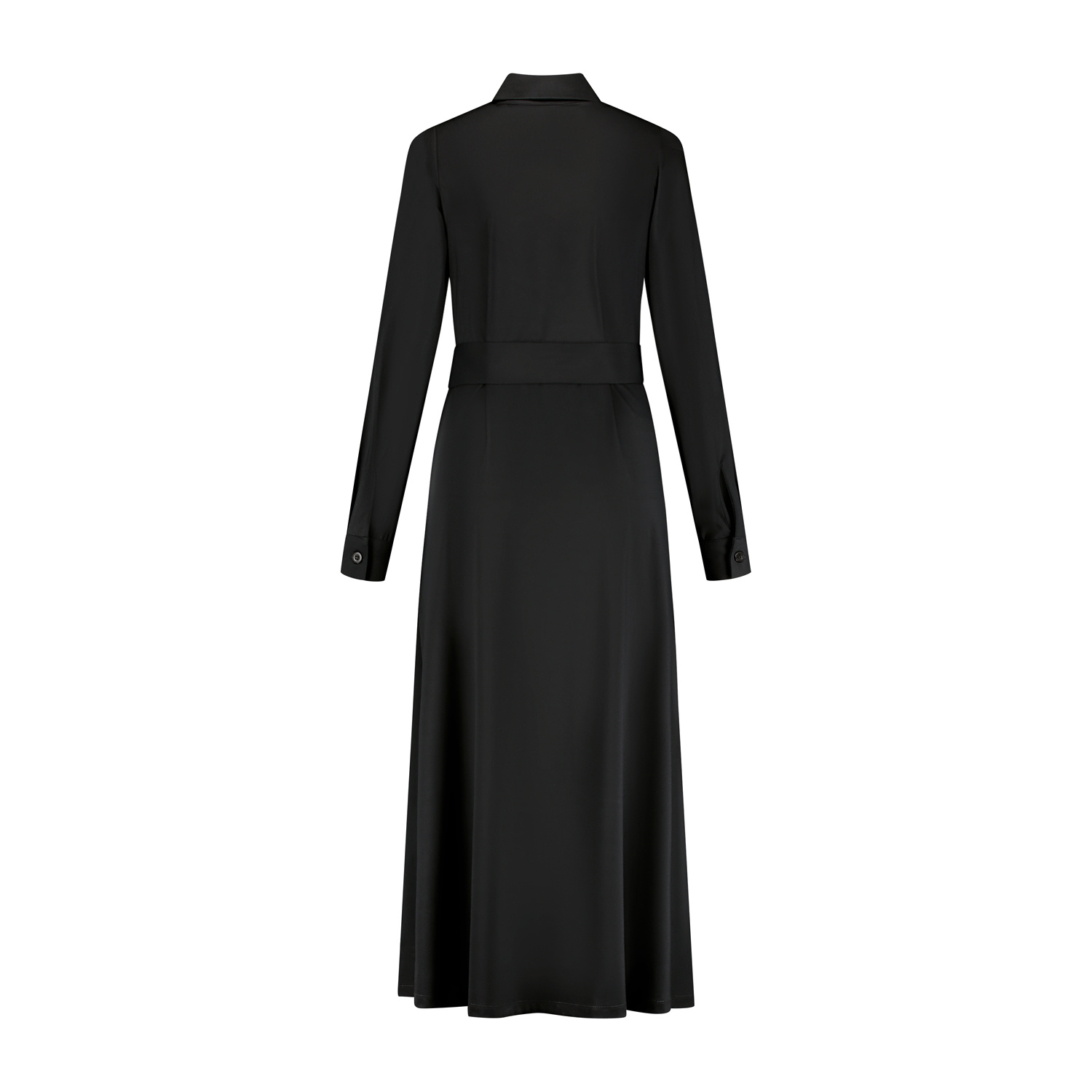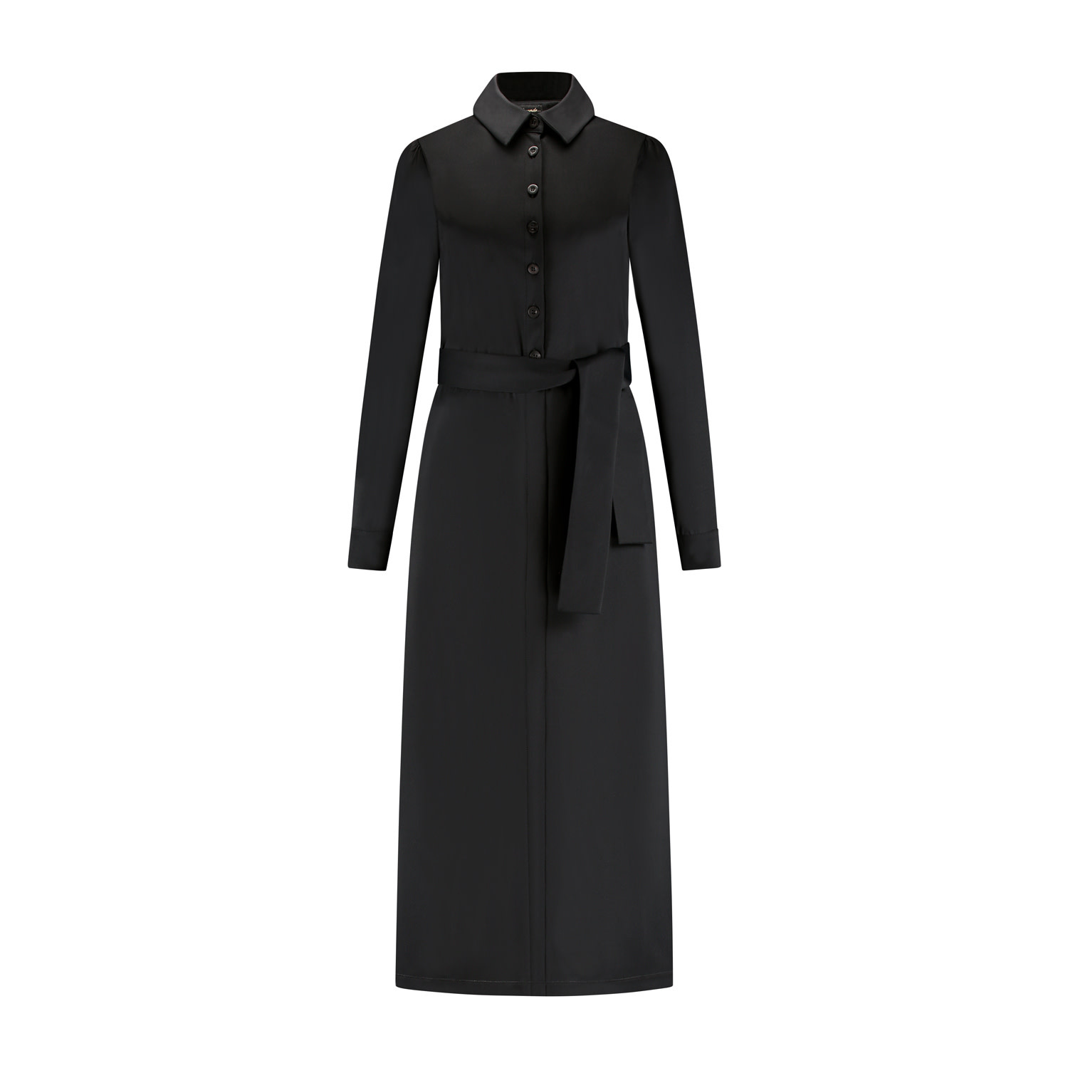 De Jurk Floor in zwart van Port Lavande is een elegante en veelzijdige damesjurk met een exclusieve uitstraling. De klassieke kraag, lange mouwen en gedeeltelijk en fake knoopsluiting geven de jurk een verfijnde uitstraling die moeiteloos past bij zowel zakelijke, dagelijkse als stijlvolle momenten. De bijpassende strikceintuur accentueert de taille en zorgt voor een mooie pasvorm. De lange, soepel vallende rok met steekzakken geeft de jurk een elegante beweging en extra draagcomfort. De mooie zwarte kleur straalt rust en luxe uit en is eenvoudig te combineren met diverse andere items uit de Port Lavande collectie. Jurk Floor is ongevoerd en gemaakt in een mooie stevige comfortabele travel kwaliteitsstof.