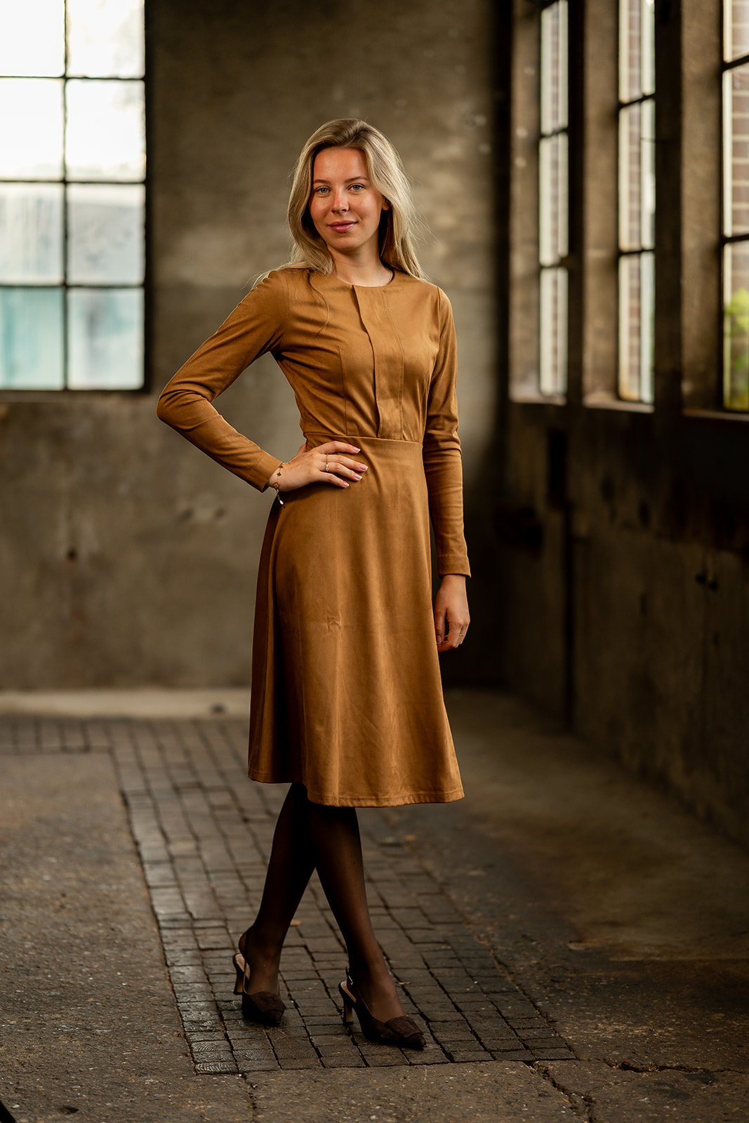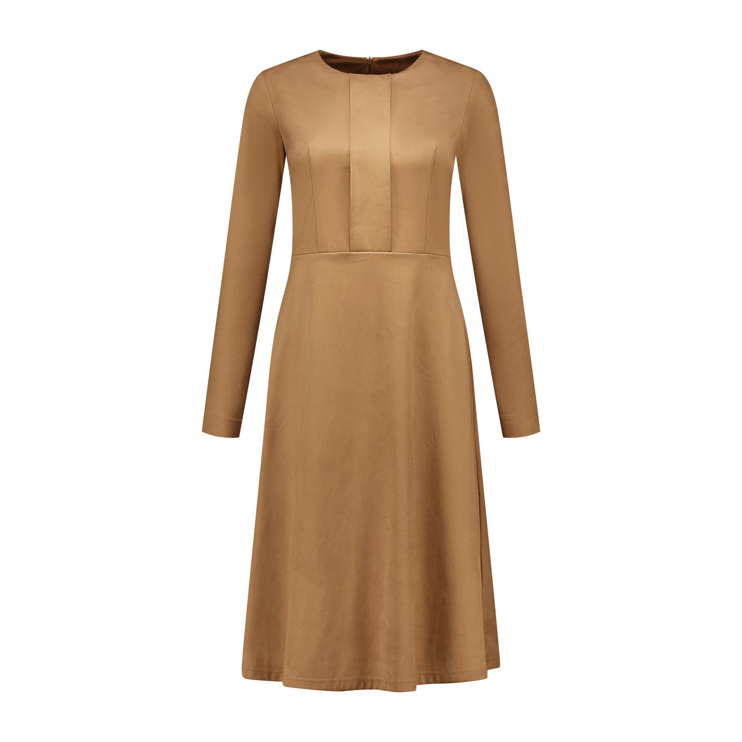 Jurk met een ronde halslijn en fake deelpas middenvoor. De jurk heeft aansluitende (zie maattabel) lange mouwen. De jurk heeft een getailleerd bovenlijfje met vanuit de taille een wijde rok. De jurk sluit middenachter d.m.v. een blinde rits en is gemaakt in een luxe suedine/lederlook kwaliteitsstof.