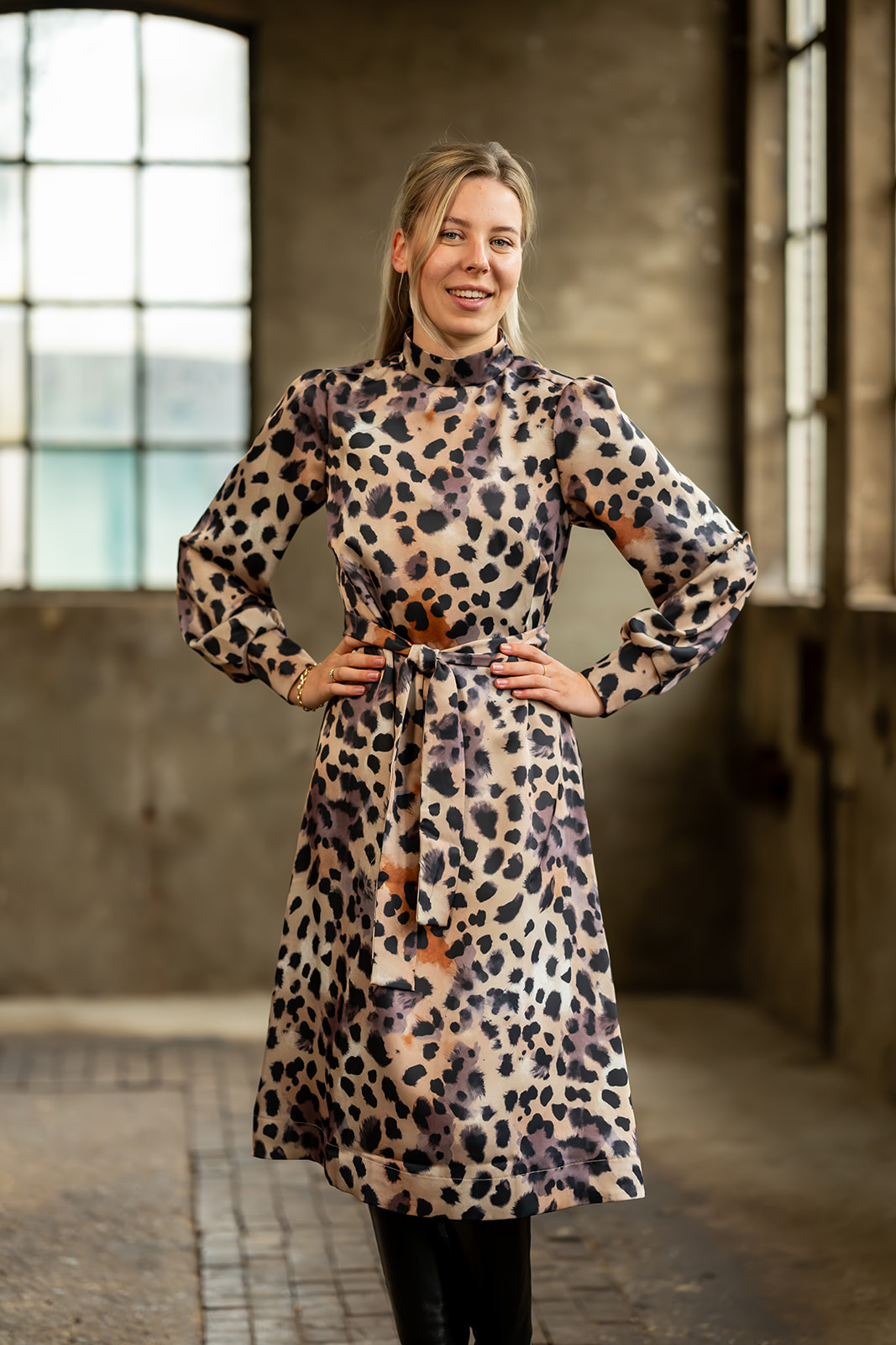 Jurk met een klein opstaand kraagje en lange blousende mouwen met brede manchet. De jurk is wijdervallend van model en d.m.v. het strikceintuur haal je het in de taille bij elkaar. De jurk sluit middenachter d.m.v. een blinde rits en is gemaakt in een gladde viscose kwaliteitsstof met mooie print.