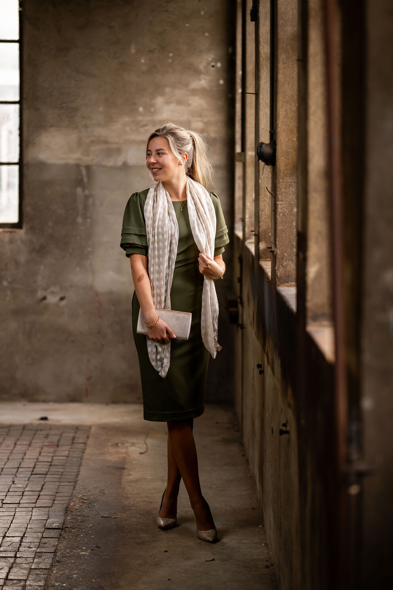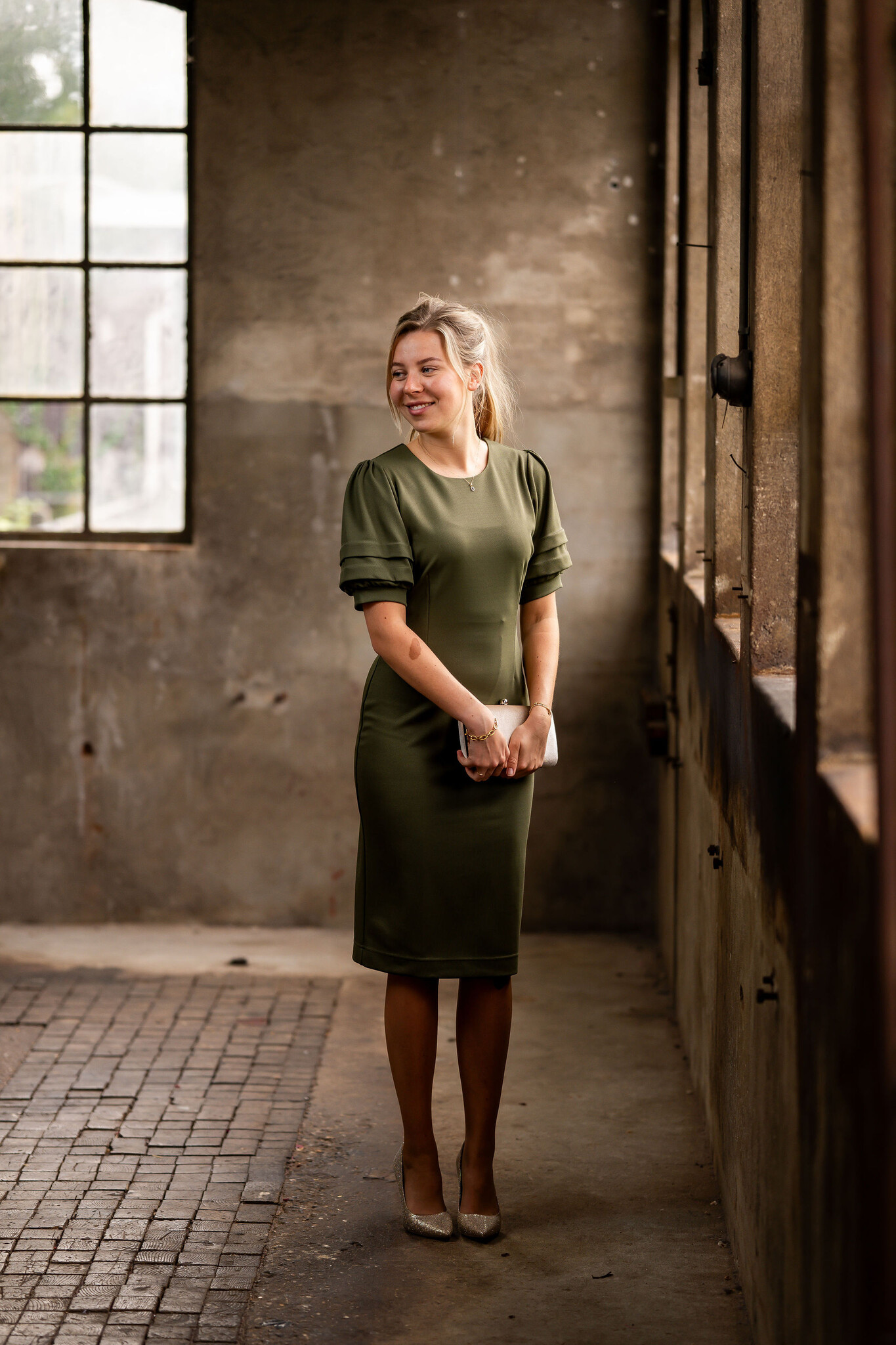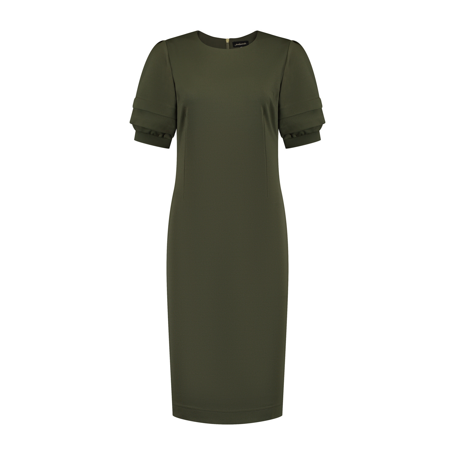 Jurk met ronde halslijn en wijde pofmouw met plooidetail en bies. De jurk is aansluitend van model en heeft middenachter een licht goudkleurige lange rits en is gemaakt in een twill kwaliteitstof.