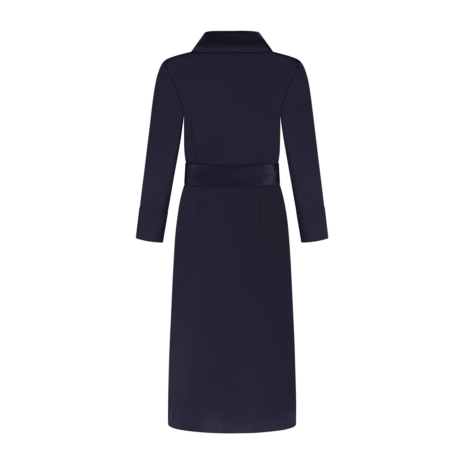 Jurk Janske is een licht getailleerde jurk met 3/4 mouwen en een reverkraag. De jurk heeft een dubbele rij knoopsluiting en een ceintuur om de taille, het welk de mogelijkheid geeft om de pasvorm na...